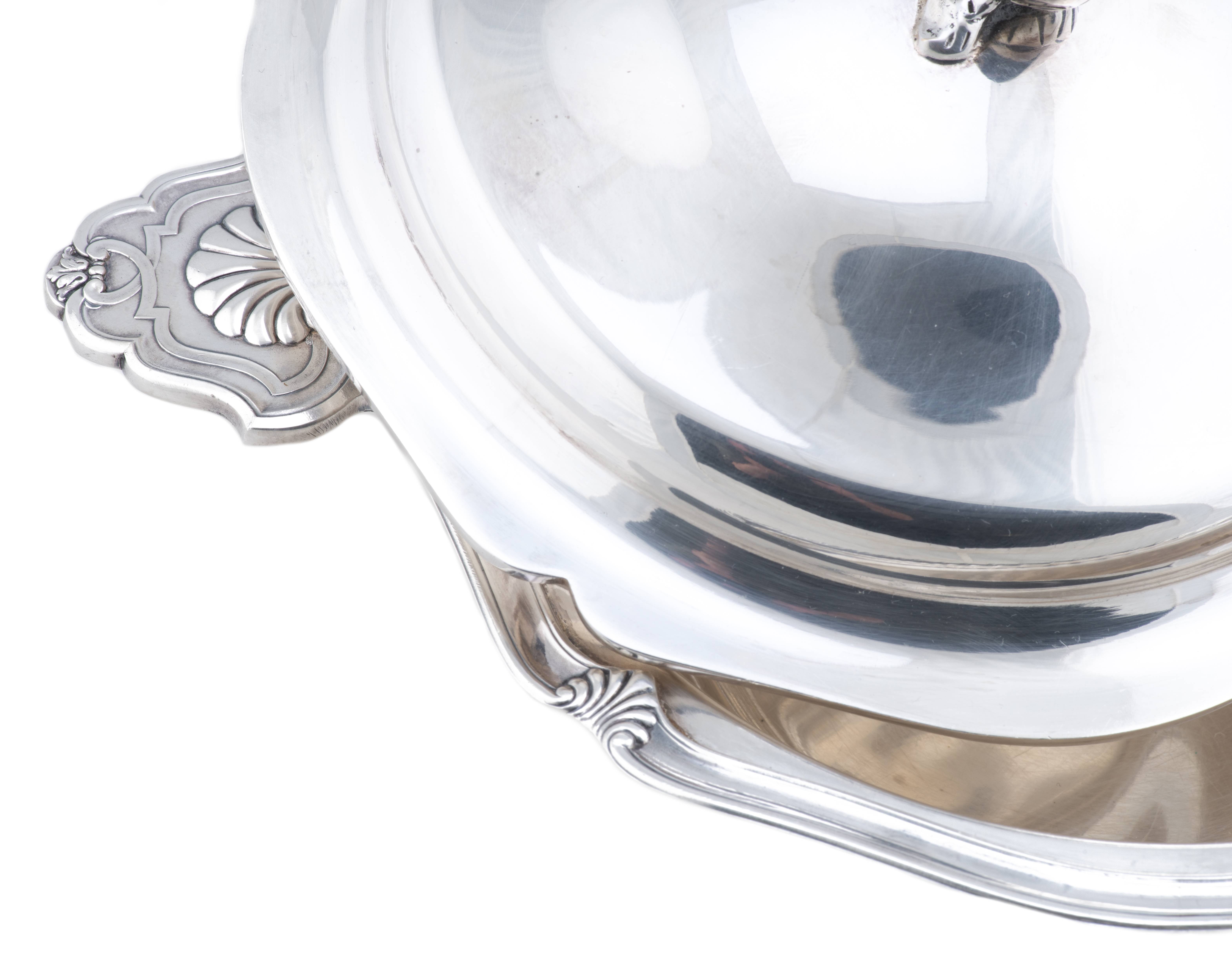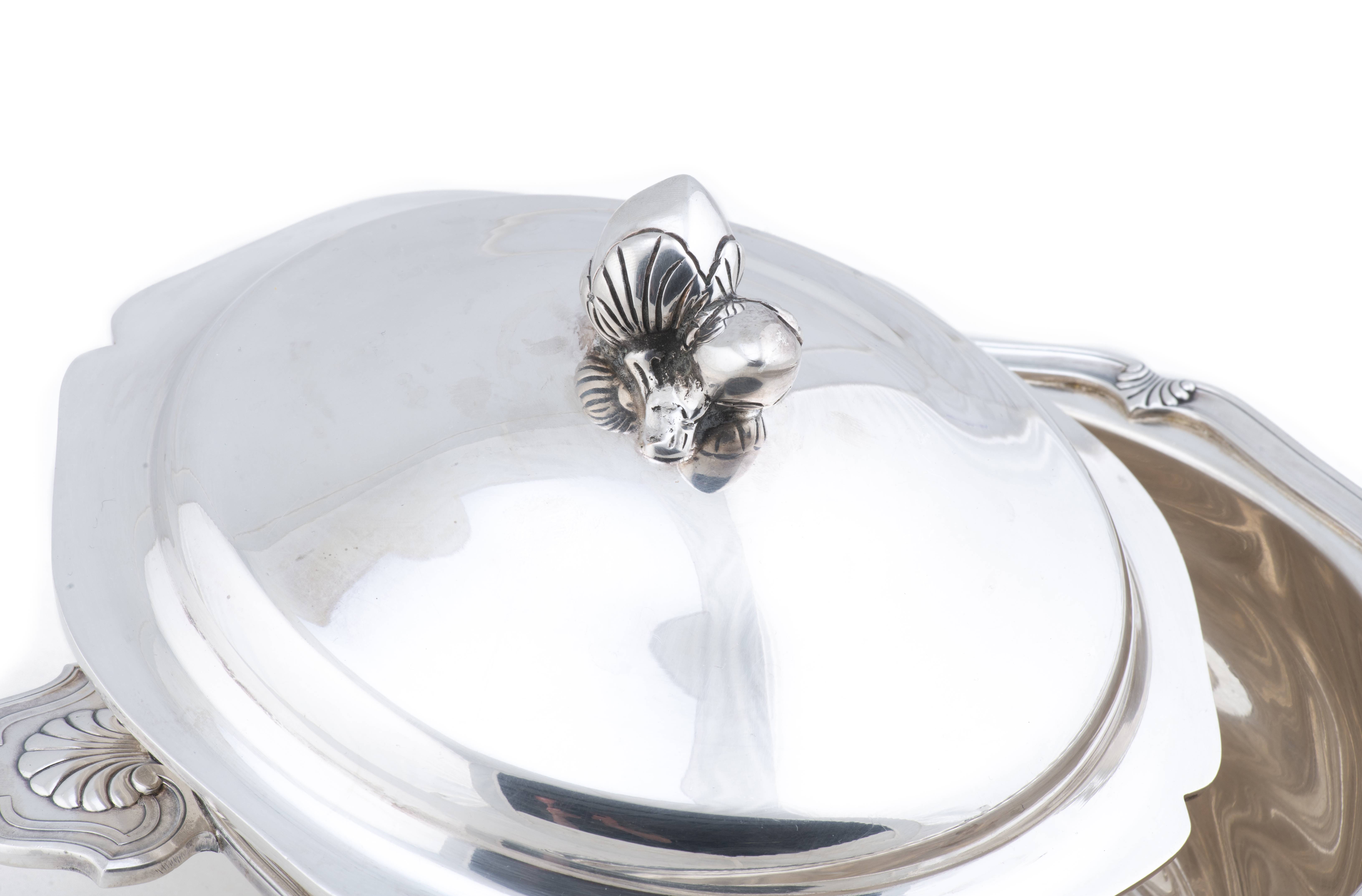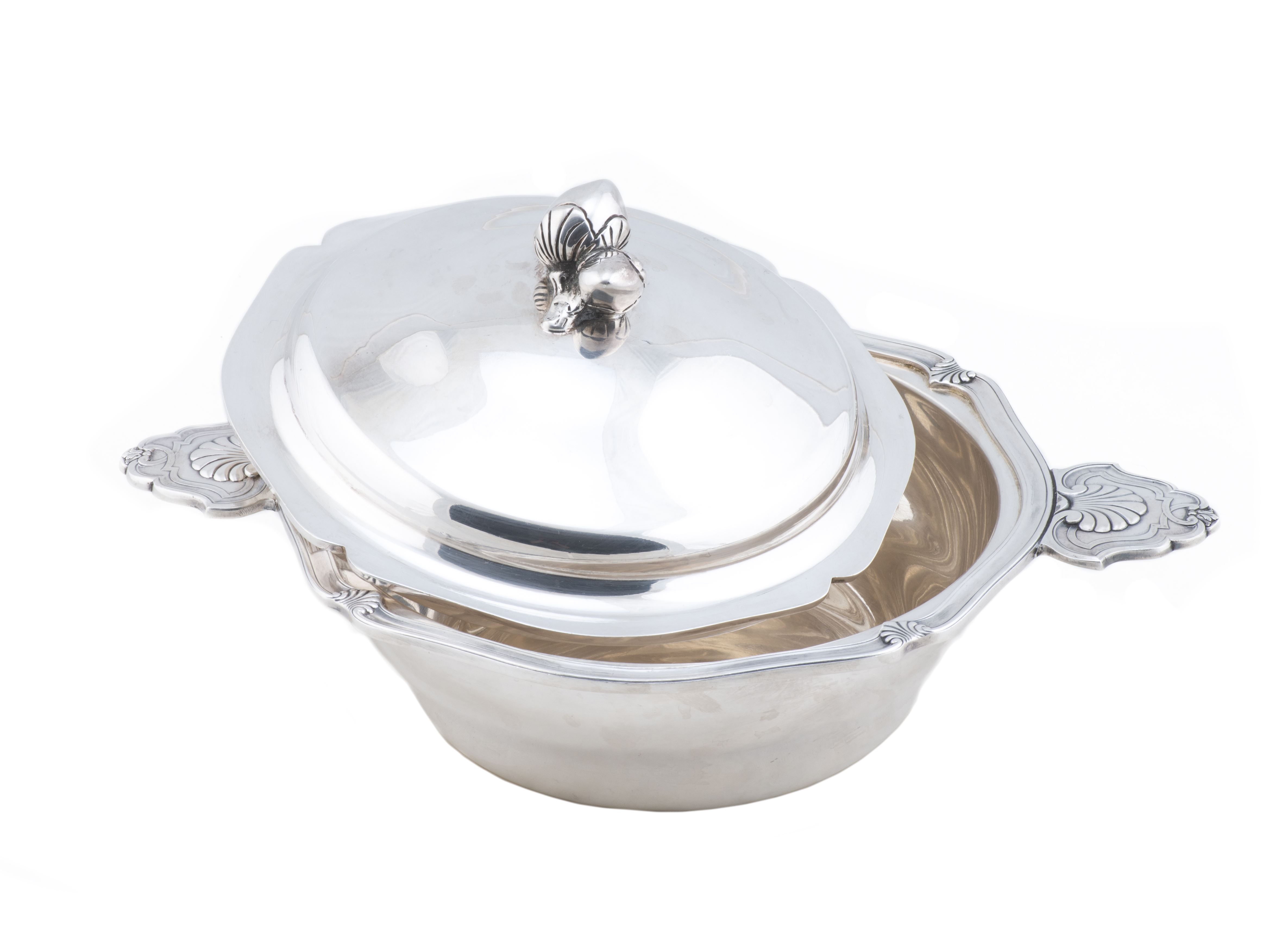 Ercuis, écuelle à oreilles ouvertes en métal argenté avec prise du couvercle en forme de gland