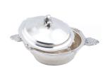 Ercuis, écuelle à oreilles ouvertes en métal argenté avec prise du couvercle en forme de gland.