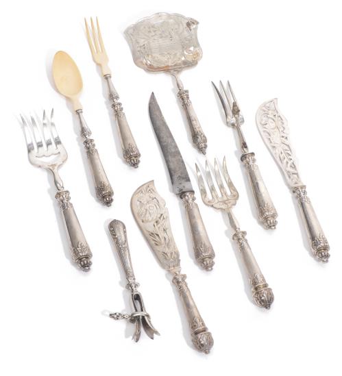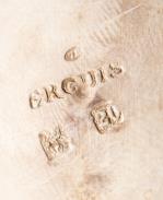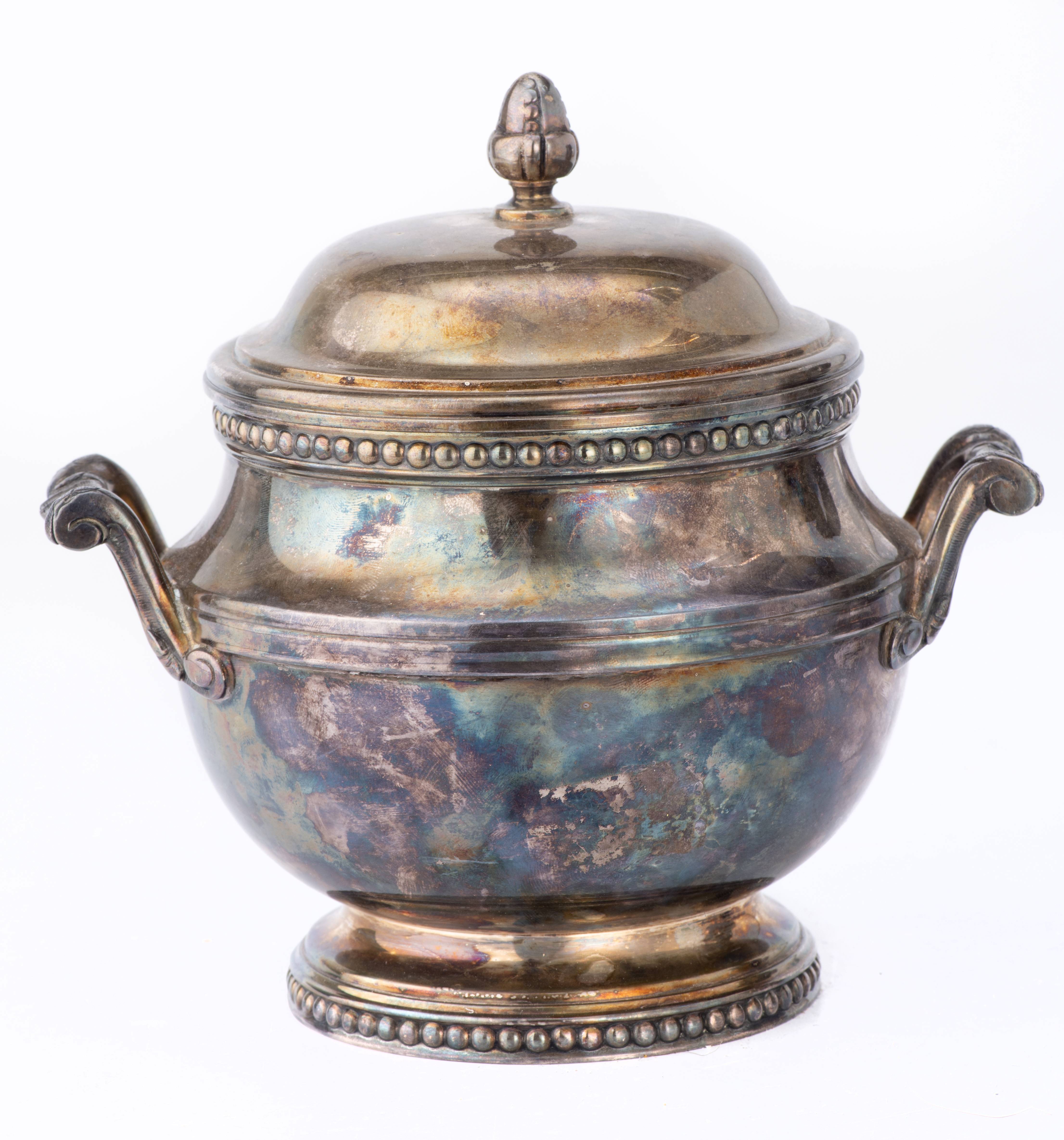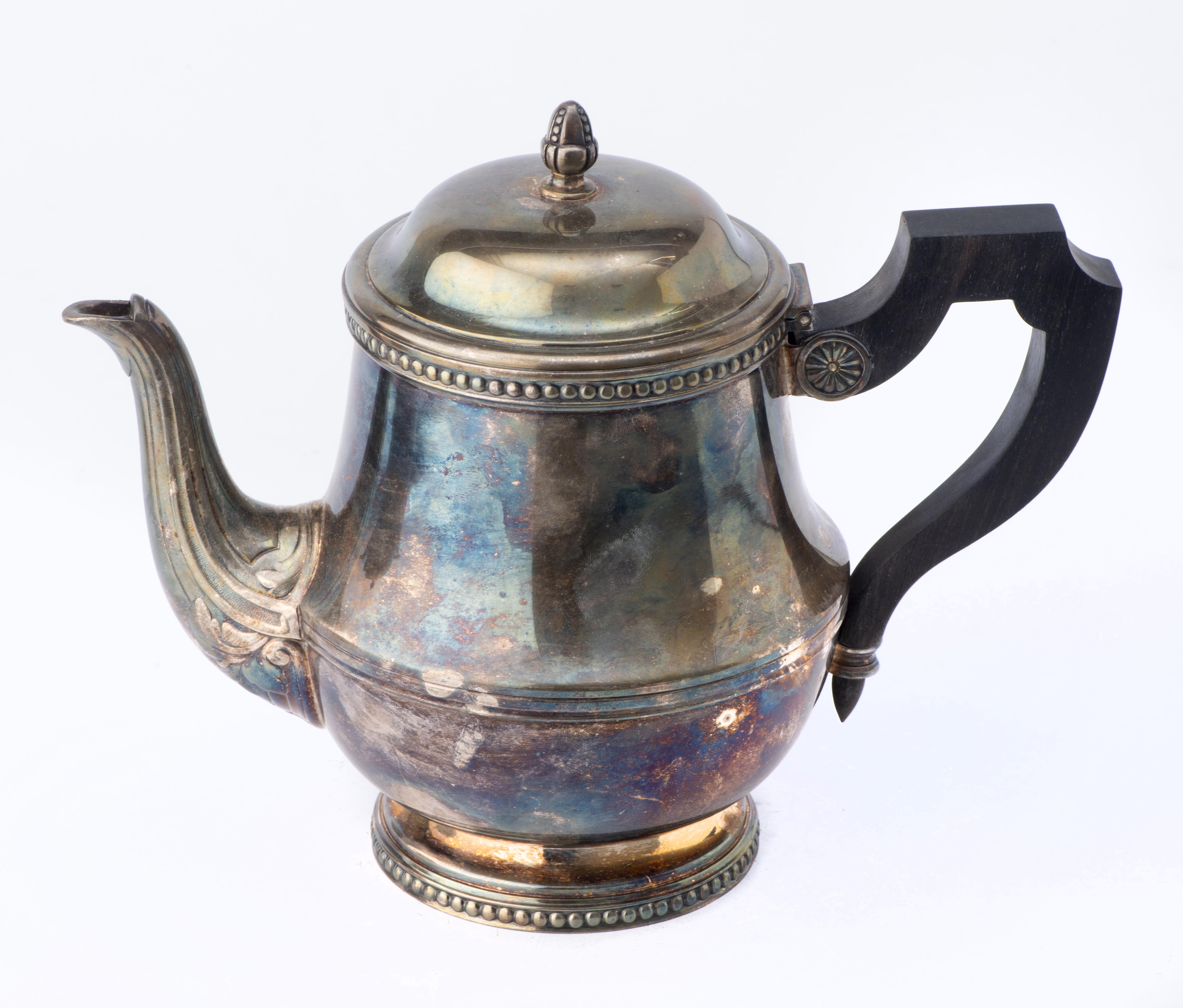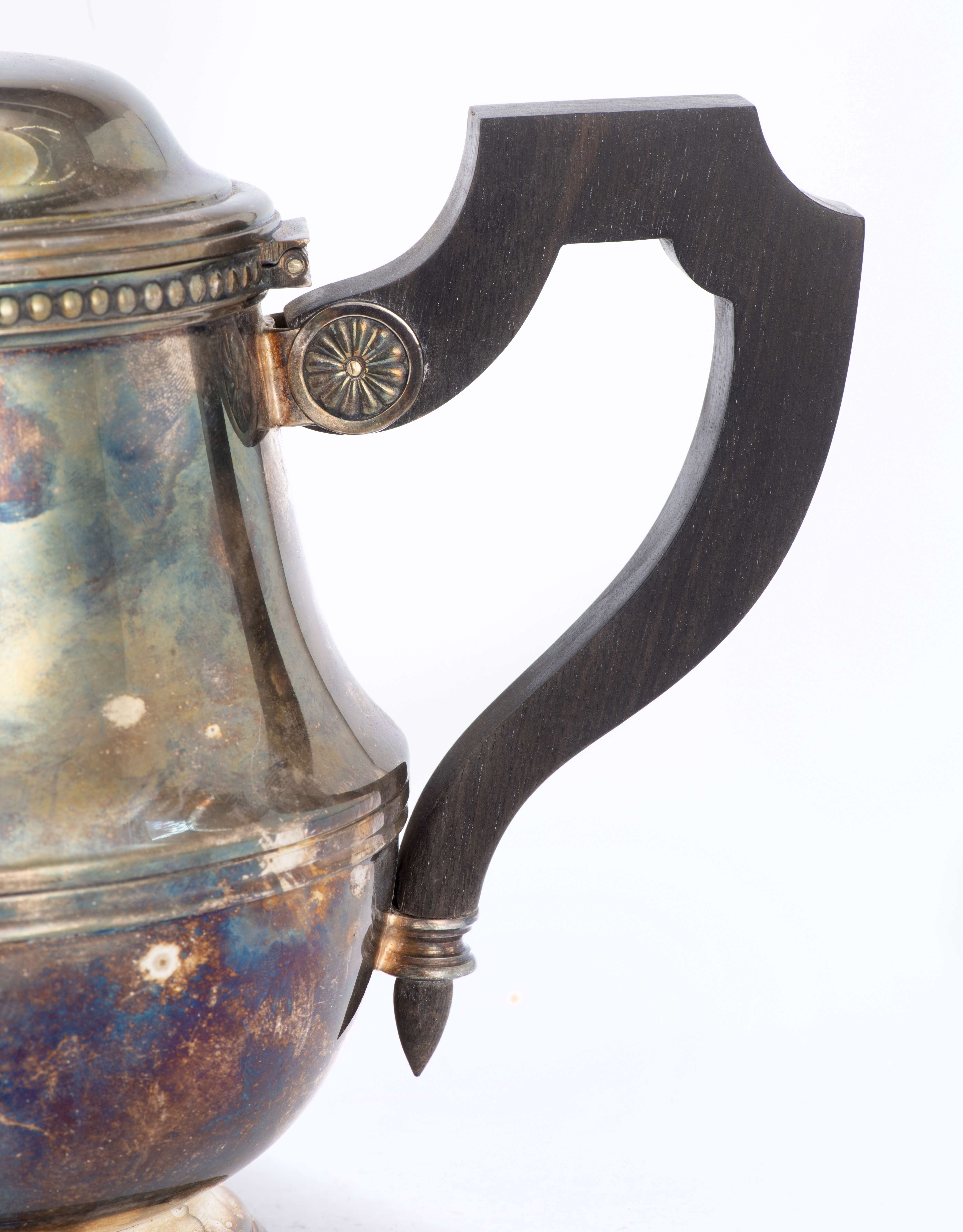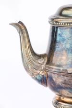 Ercuis, théière et sucrier en métal argenté à décor de bandeaux de perles et surmontés de glands.