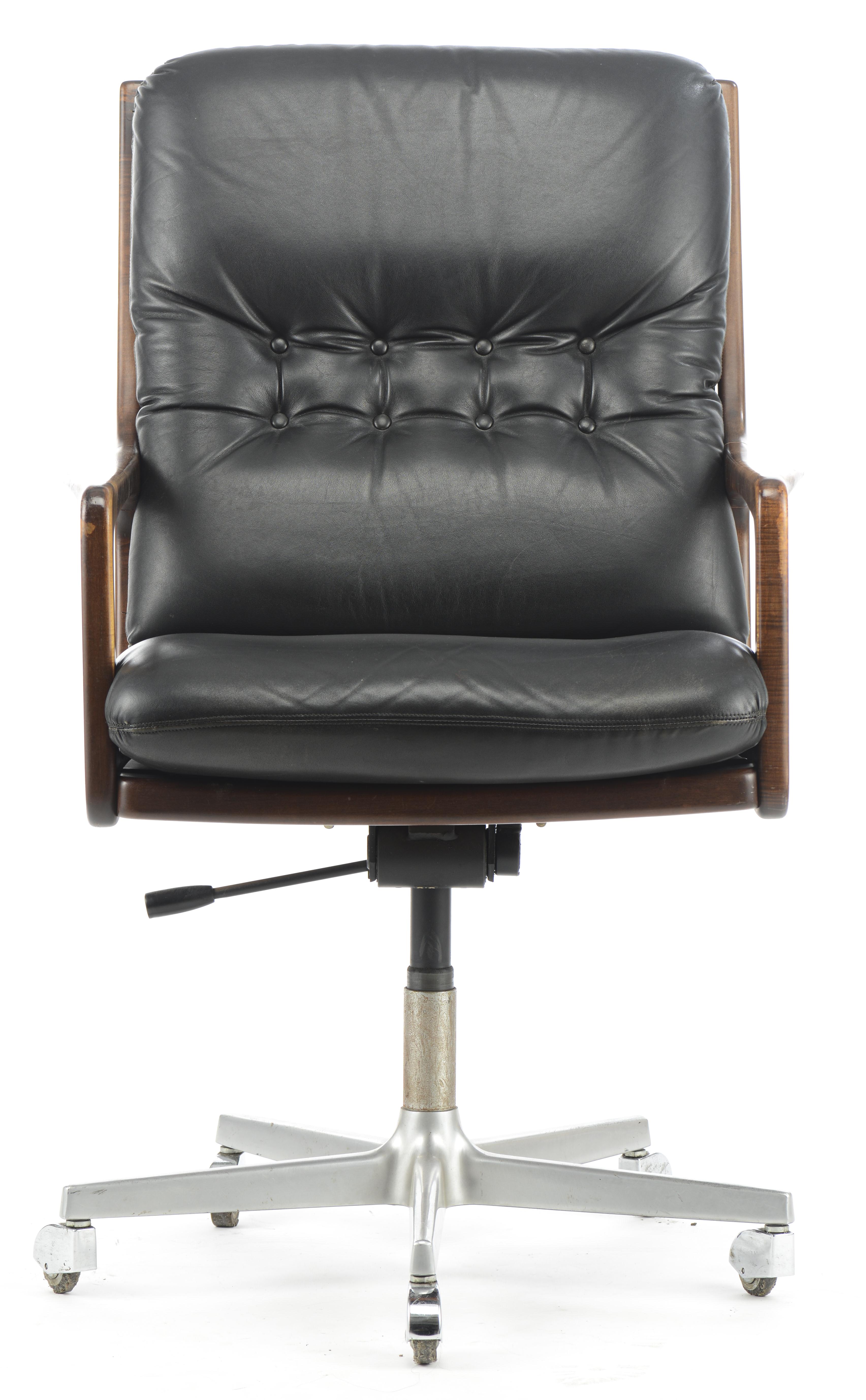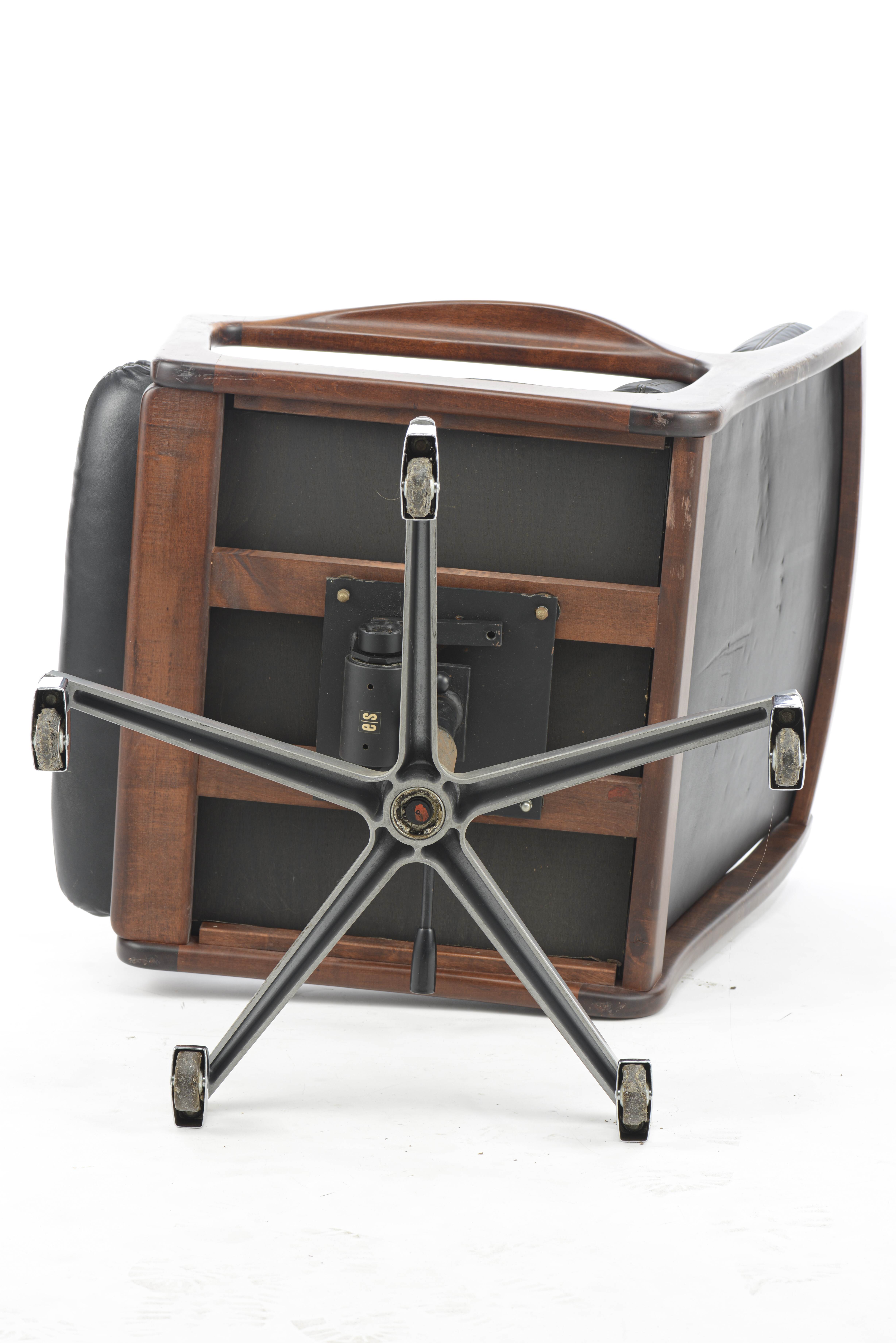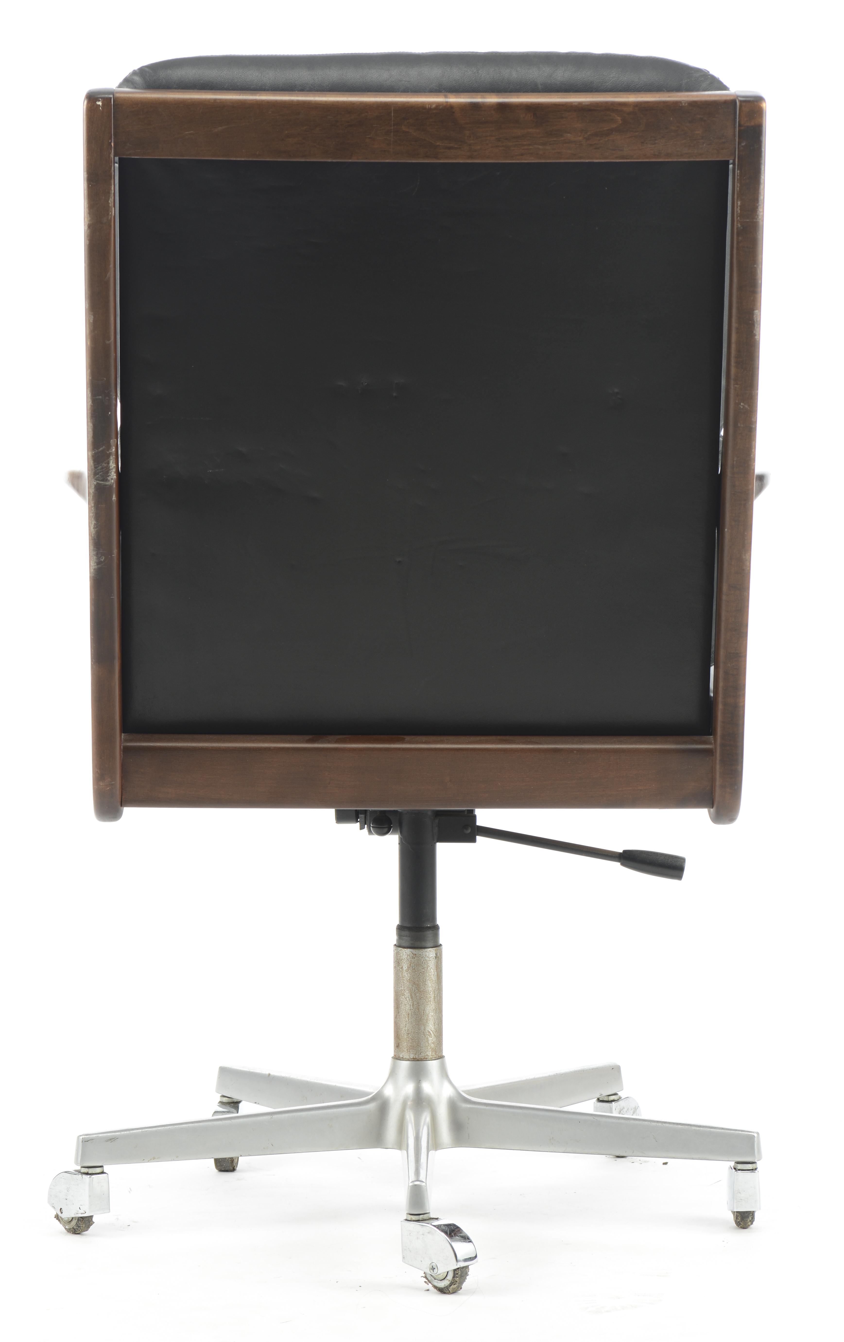 Eugen SCHMIDT pour Soloform, fauteuil de bureau tournant à assise et dossier en cuir noir et accotoirs en bois, pied aluminium à cinq patins, vers 1960, porte une étiquette E|S.