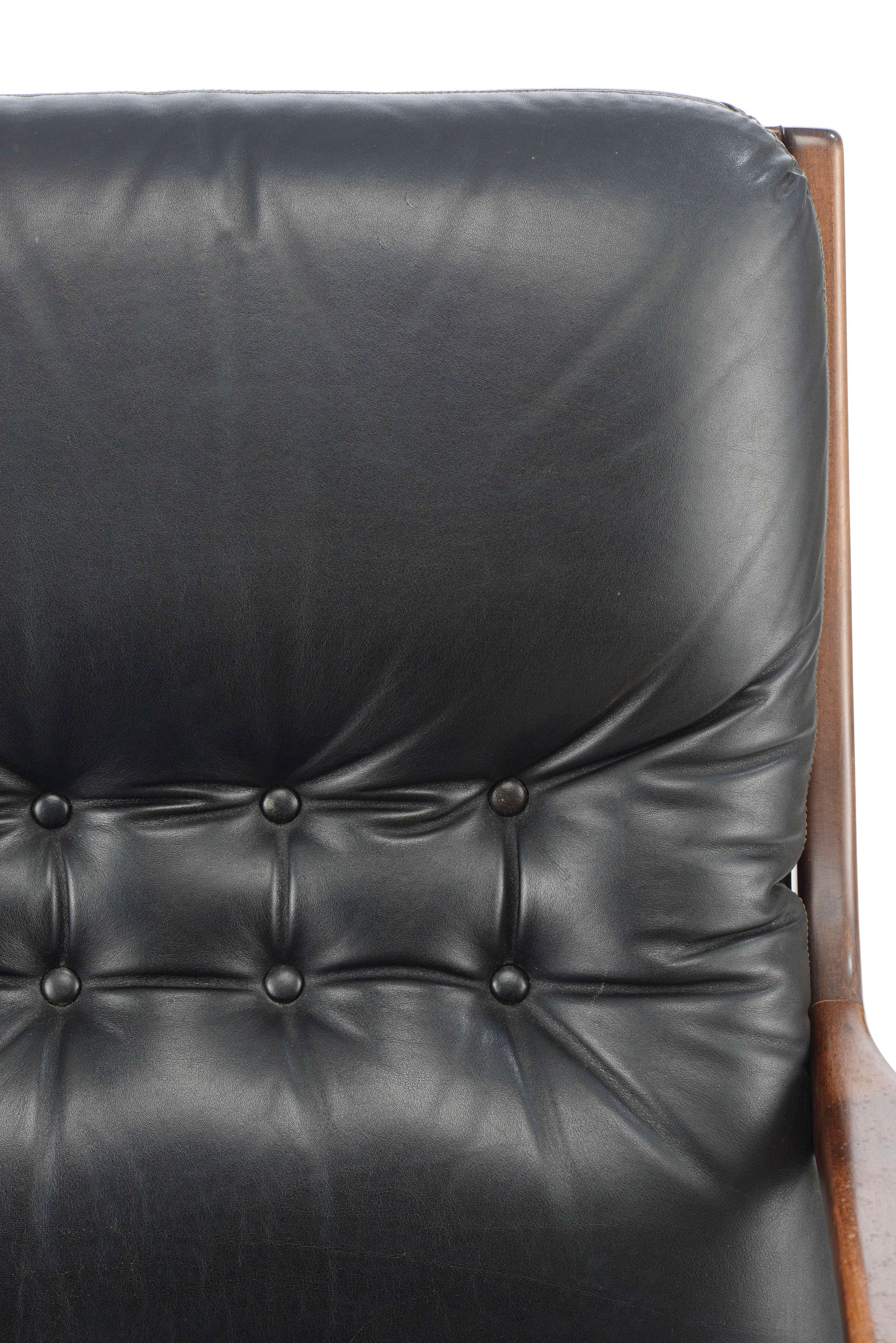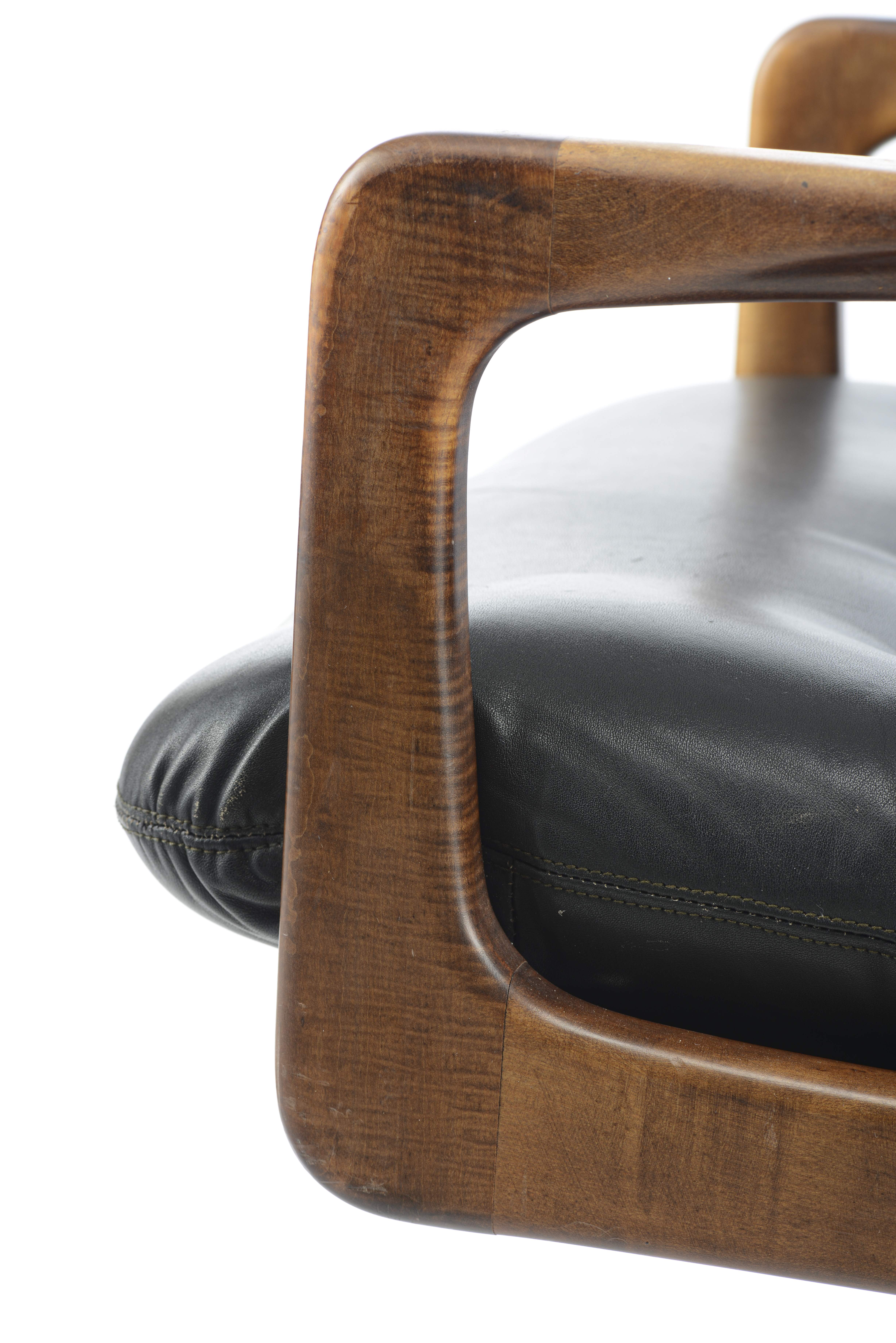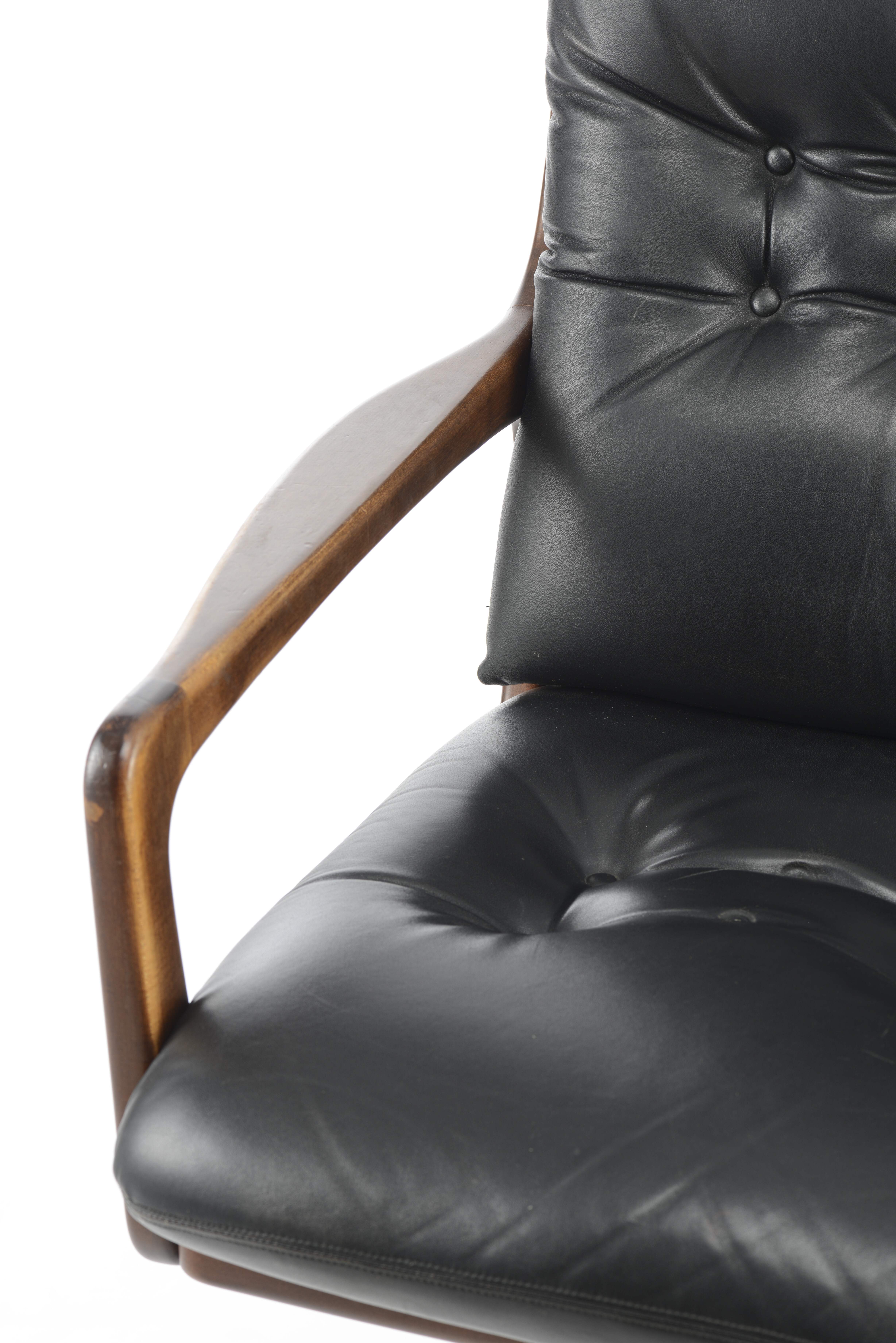 Eugen SCHMIDT pour Soloform, fauteuil de bureau tournant à assise et dossier en cuir noir et accotoirs en bois, pied aluminium à cinq patins, vers 1960, porte une étiquette E|S.