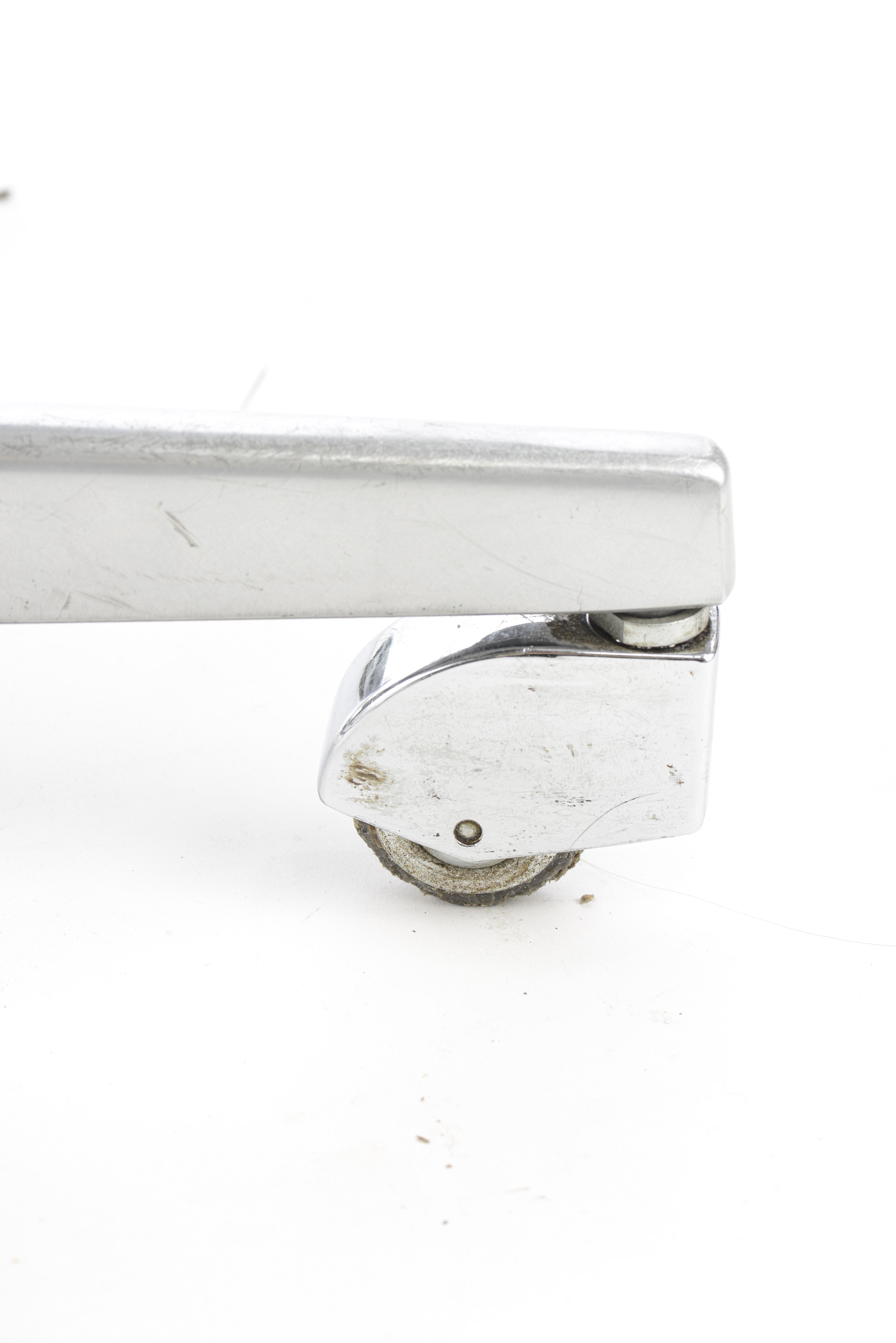 Le caoutchouc des roulettes d'origine serait à changer (usures), manque deux boutons en cuir sur l'assise