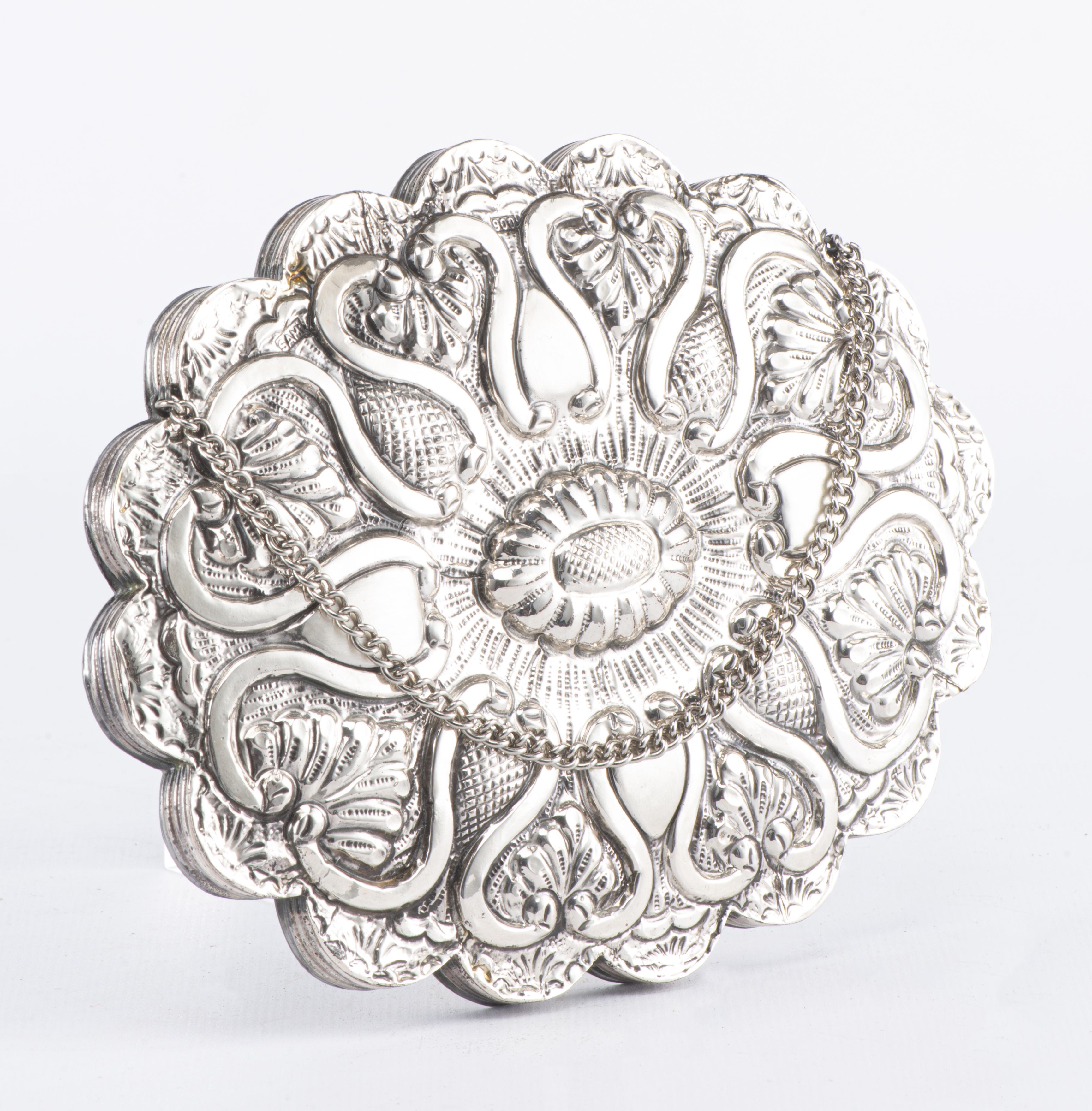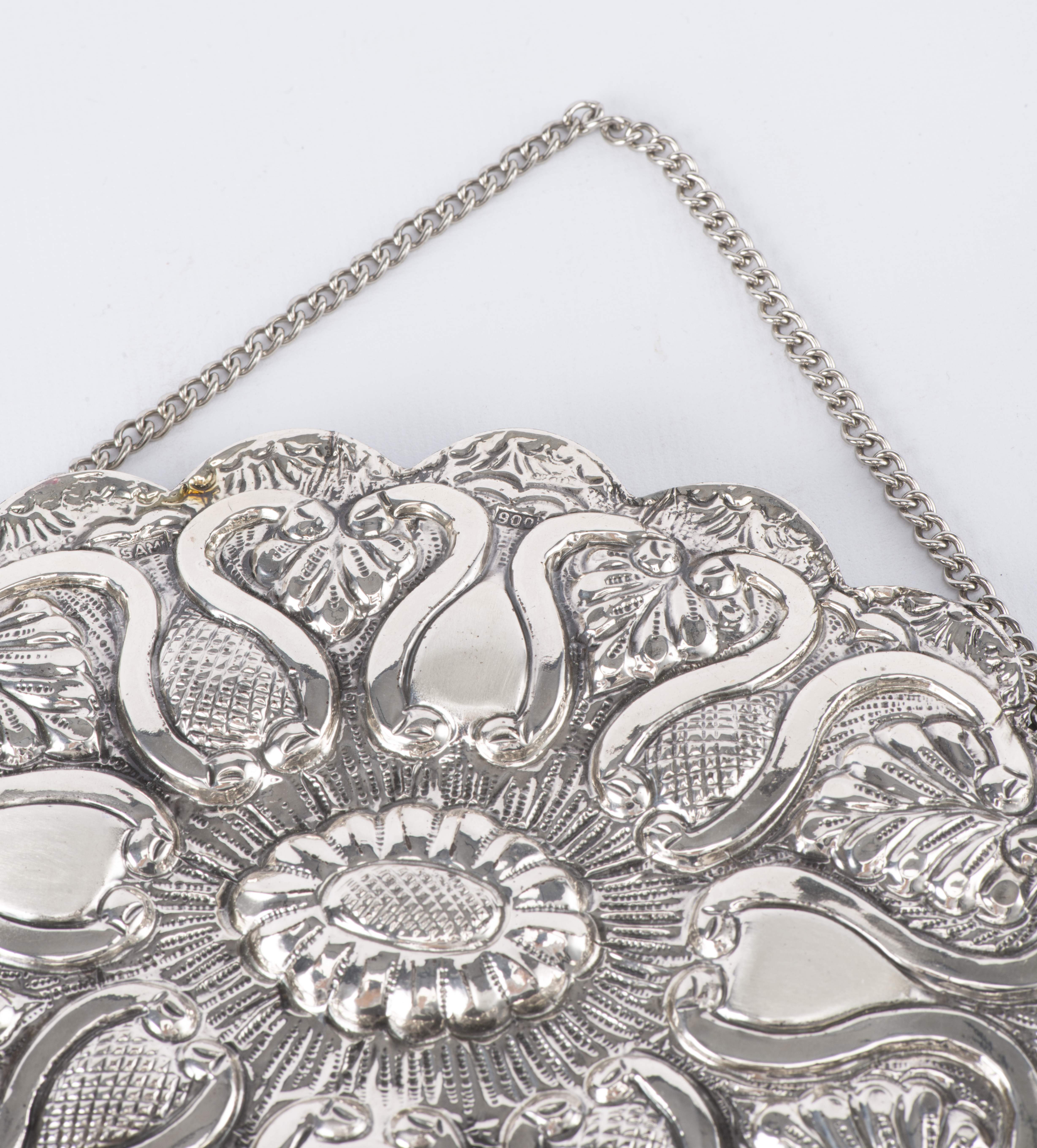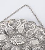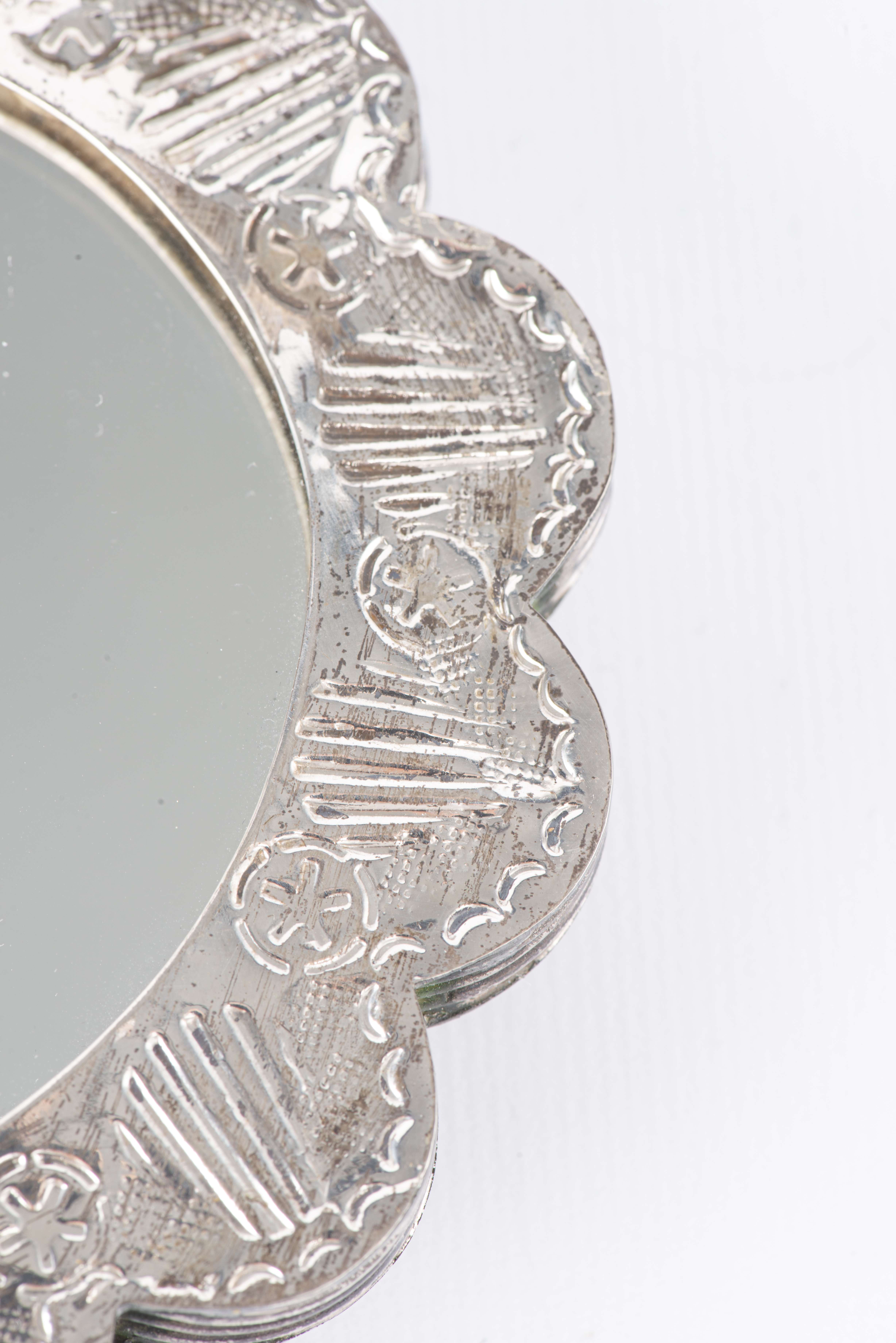 On y joint également un miroir de forme ovale polylobée, en argent turc .900 repoussé à décor floral, dotté d'une chaine à suspendre.