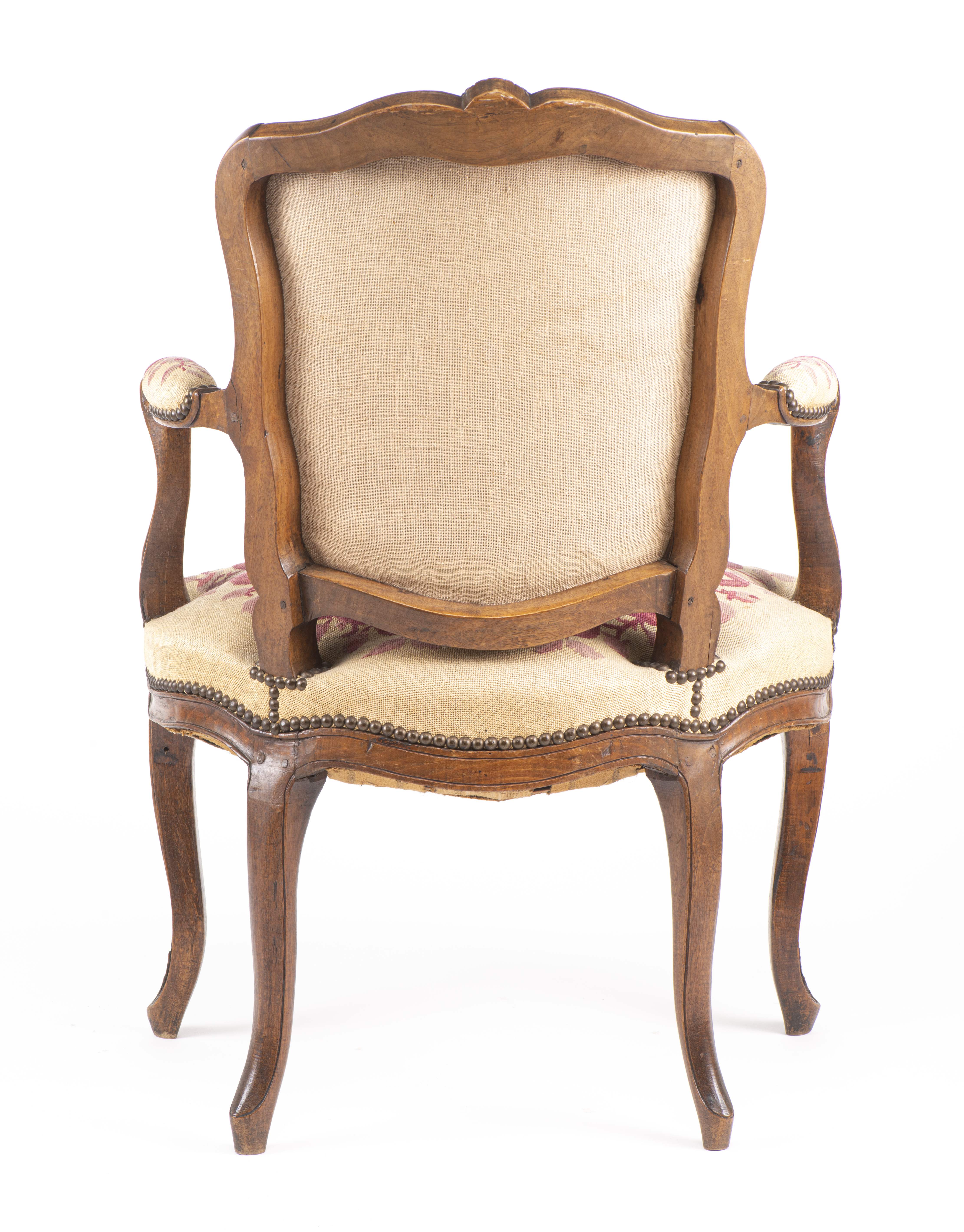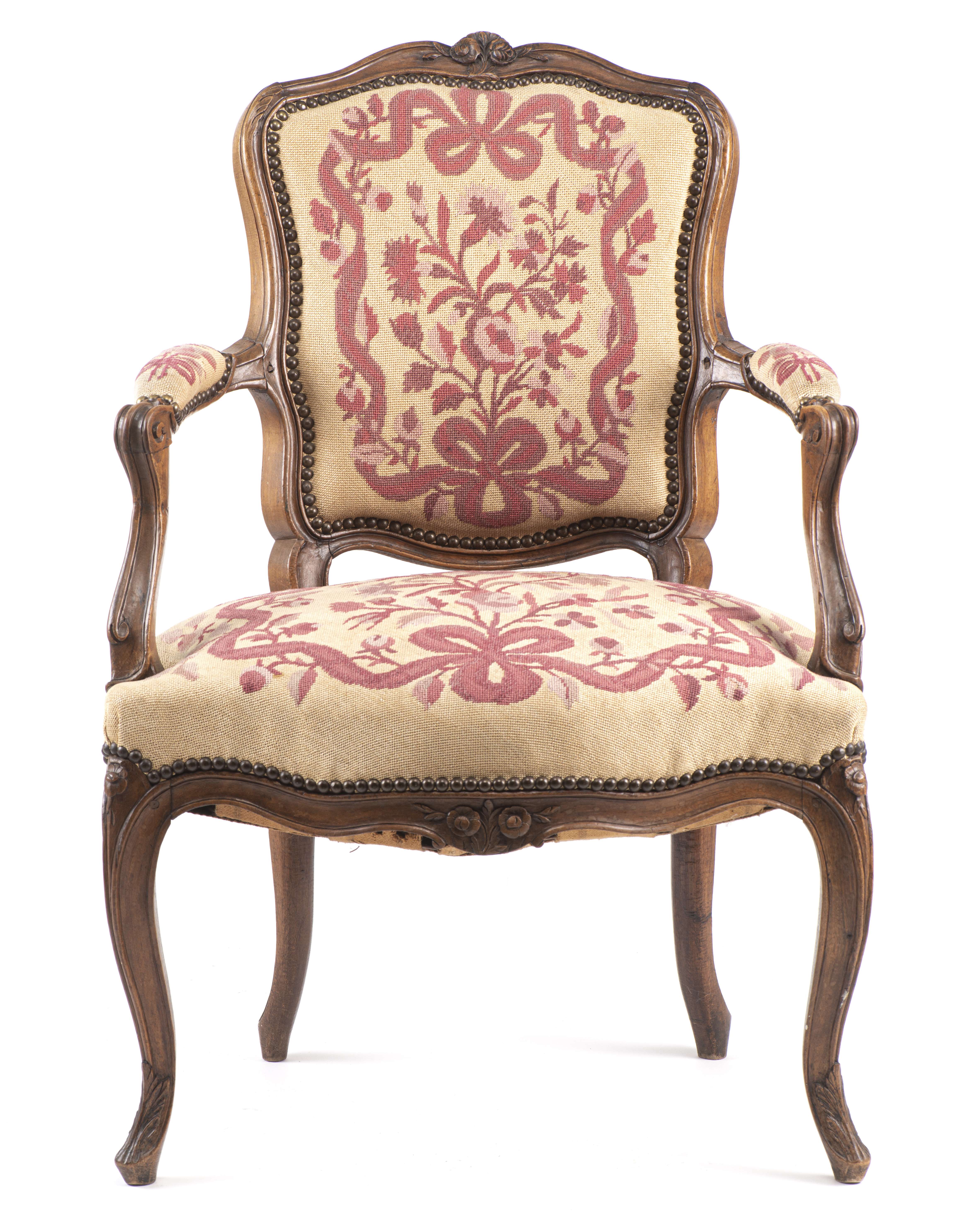 Fauteuil cabriolet de style Louis XV par Chevrier Pomel & Cie à Genève, recouvert d'un tissu à point.