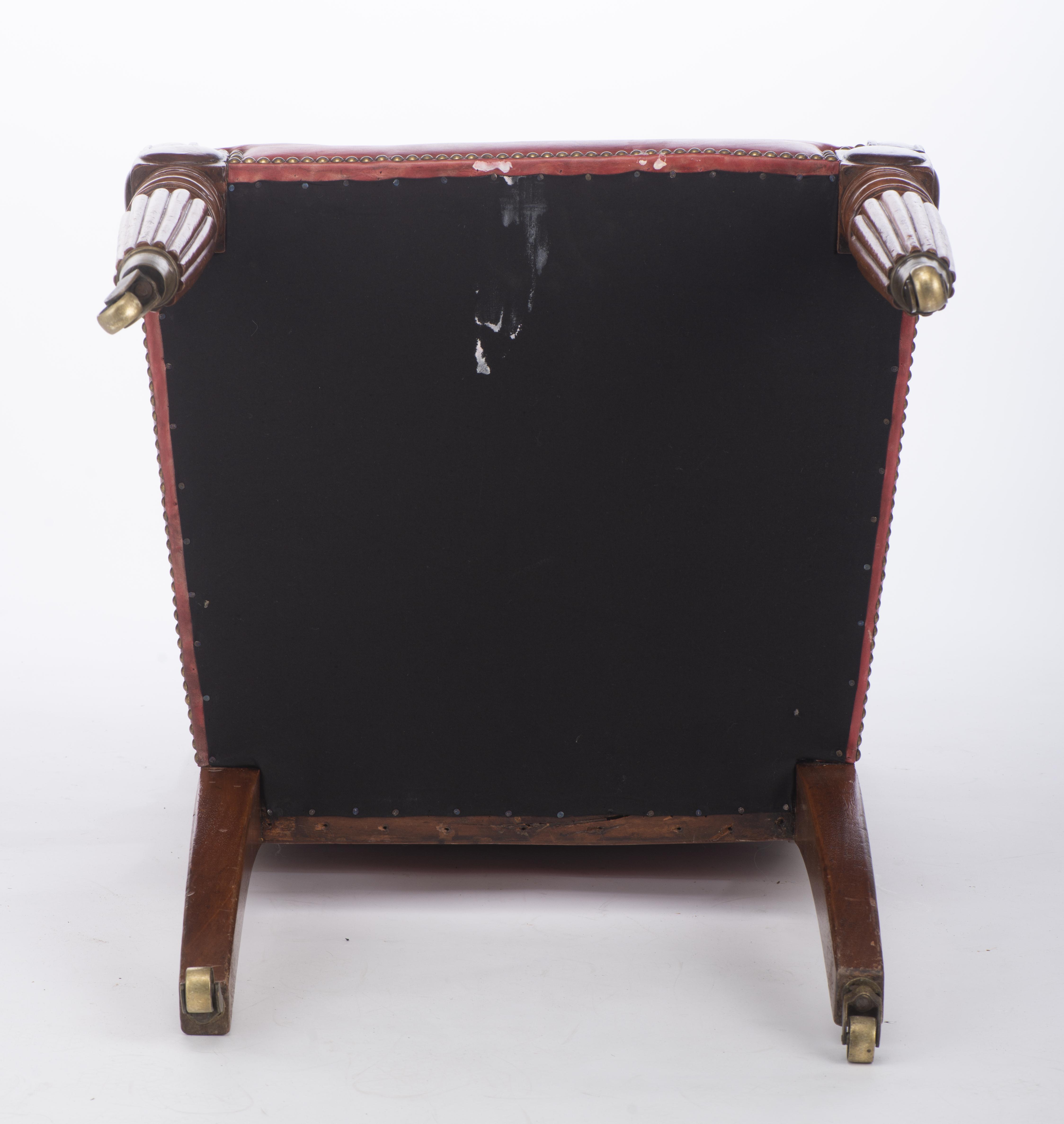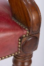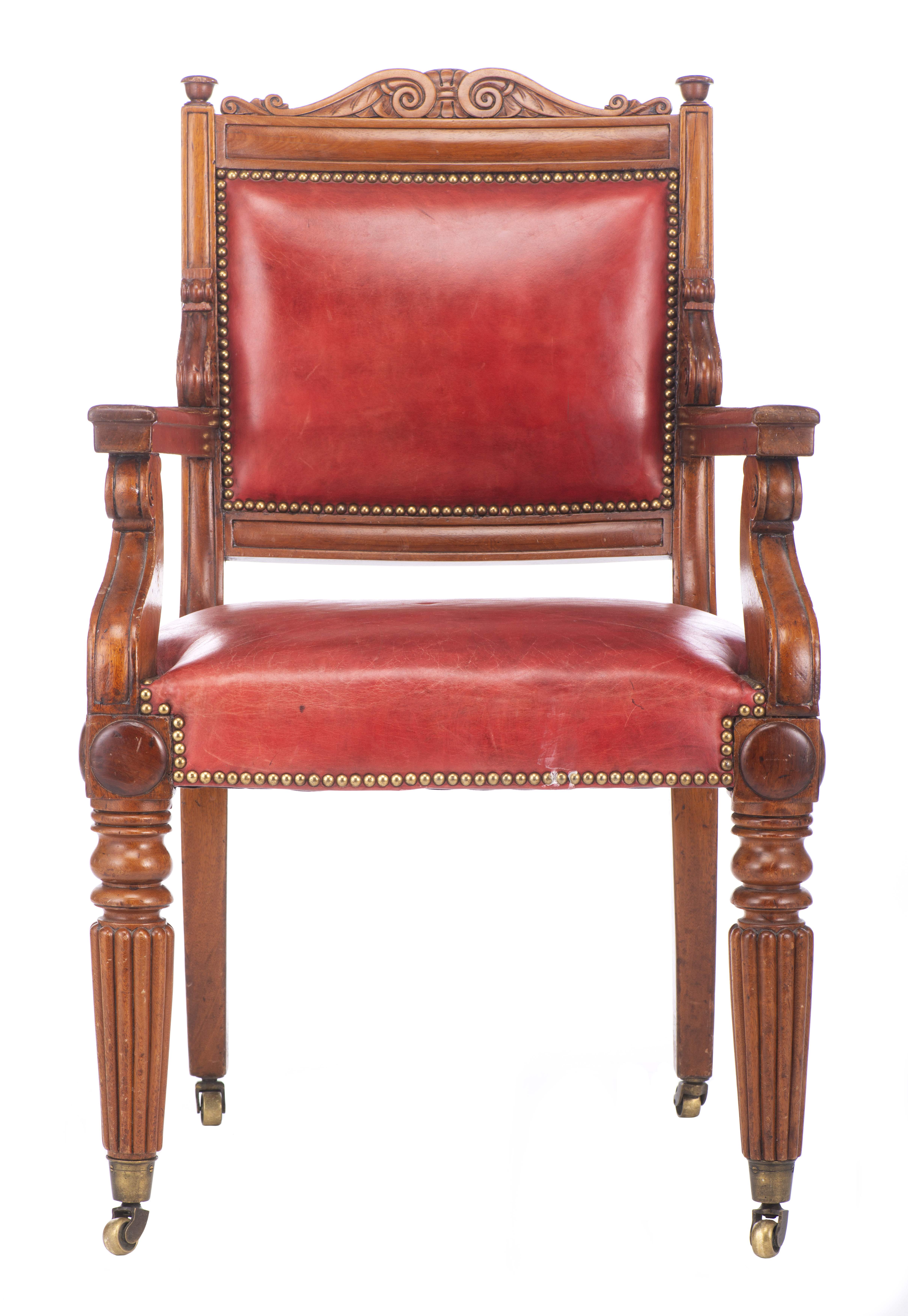 Fauteuil en bois sculpté, assise cuir rouge, pieds cannelés sur roulettes.
