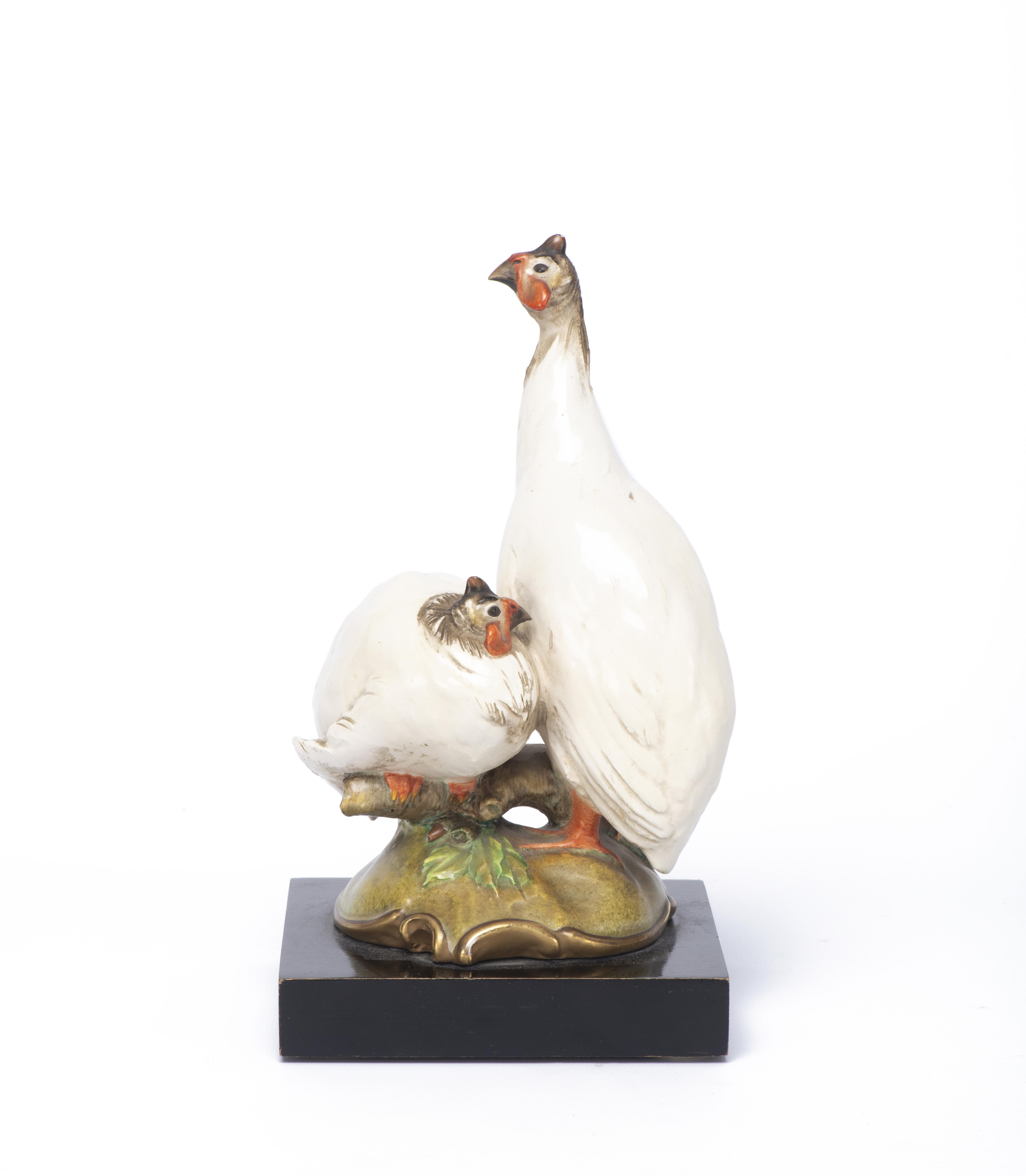 G. Louios Priots XXe, deux pintades en porcelaine.