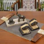 - 1 encrier porte-crayon en marbre et régule à décor d'un éléphant de cirque.