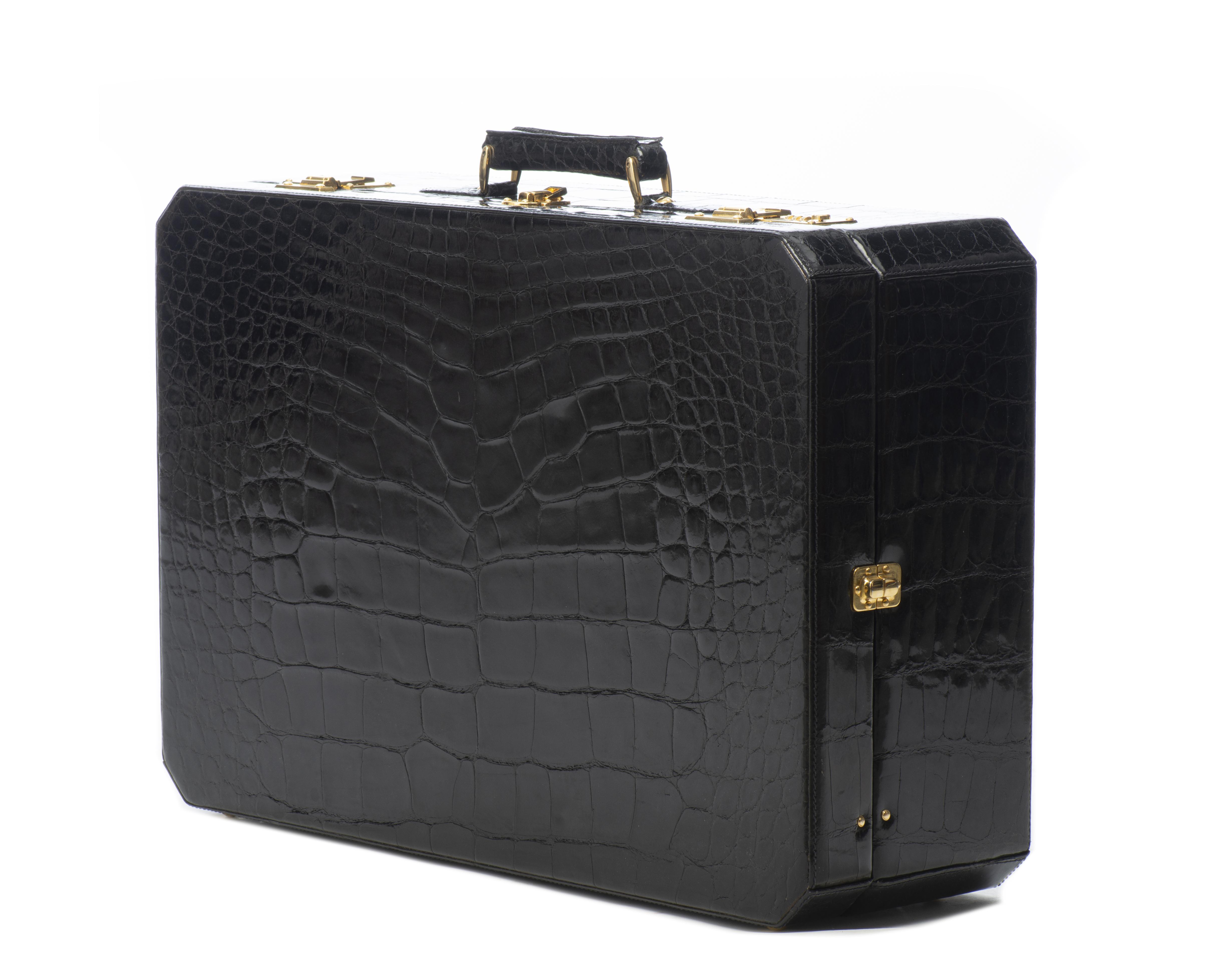 GAUTIER Genève. Valise en cuir croco vernis noir, intérieur en cuir noir lisse avec 2 poches cuir, garnitures en métal doré ainsi que la serrure à code.