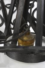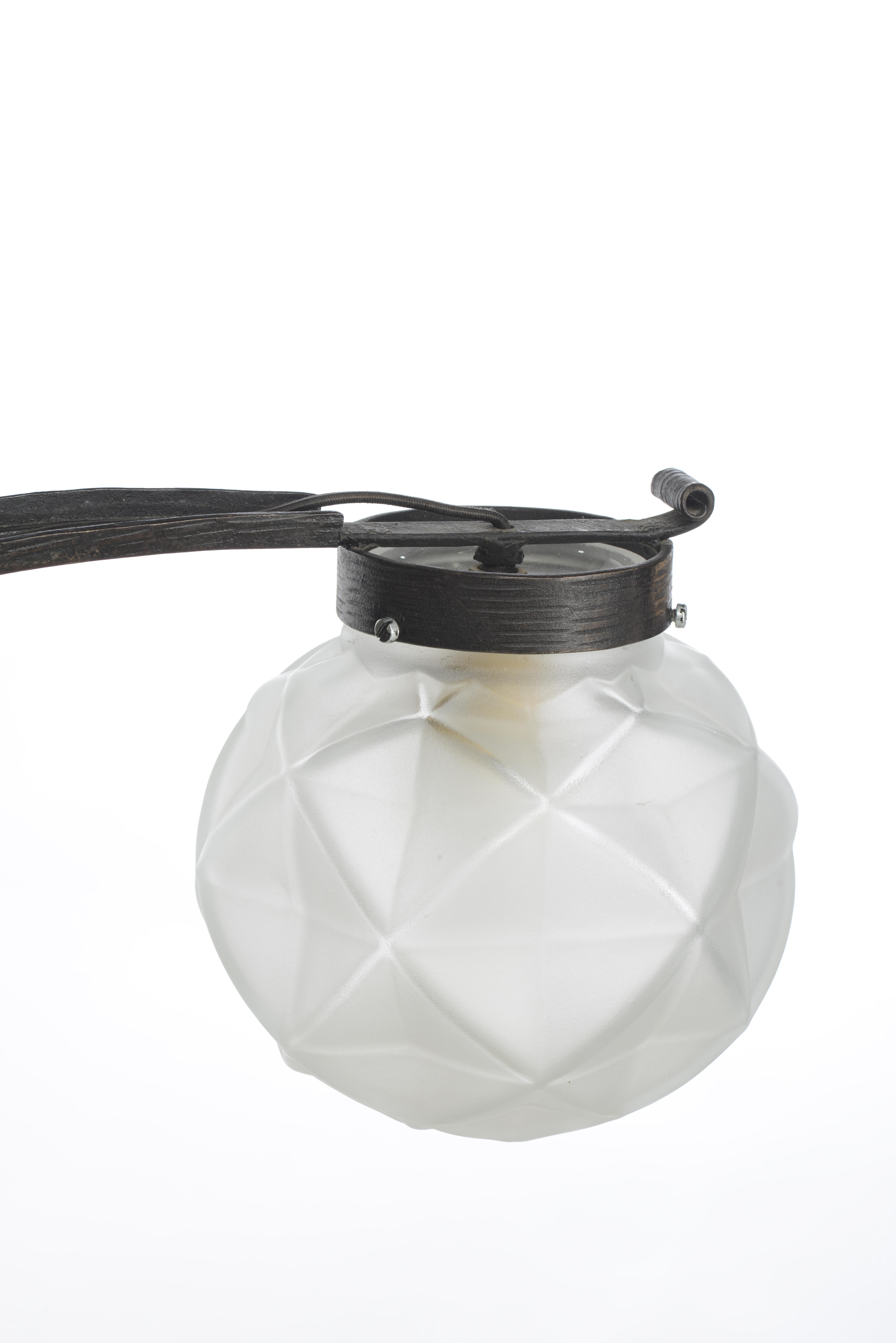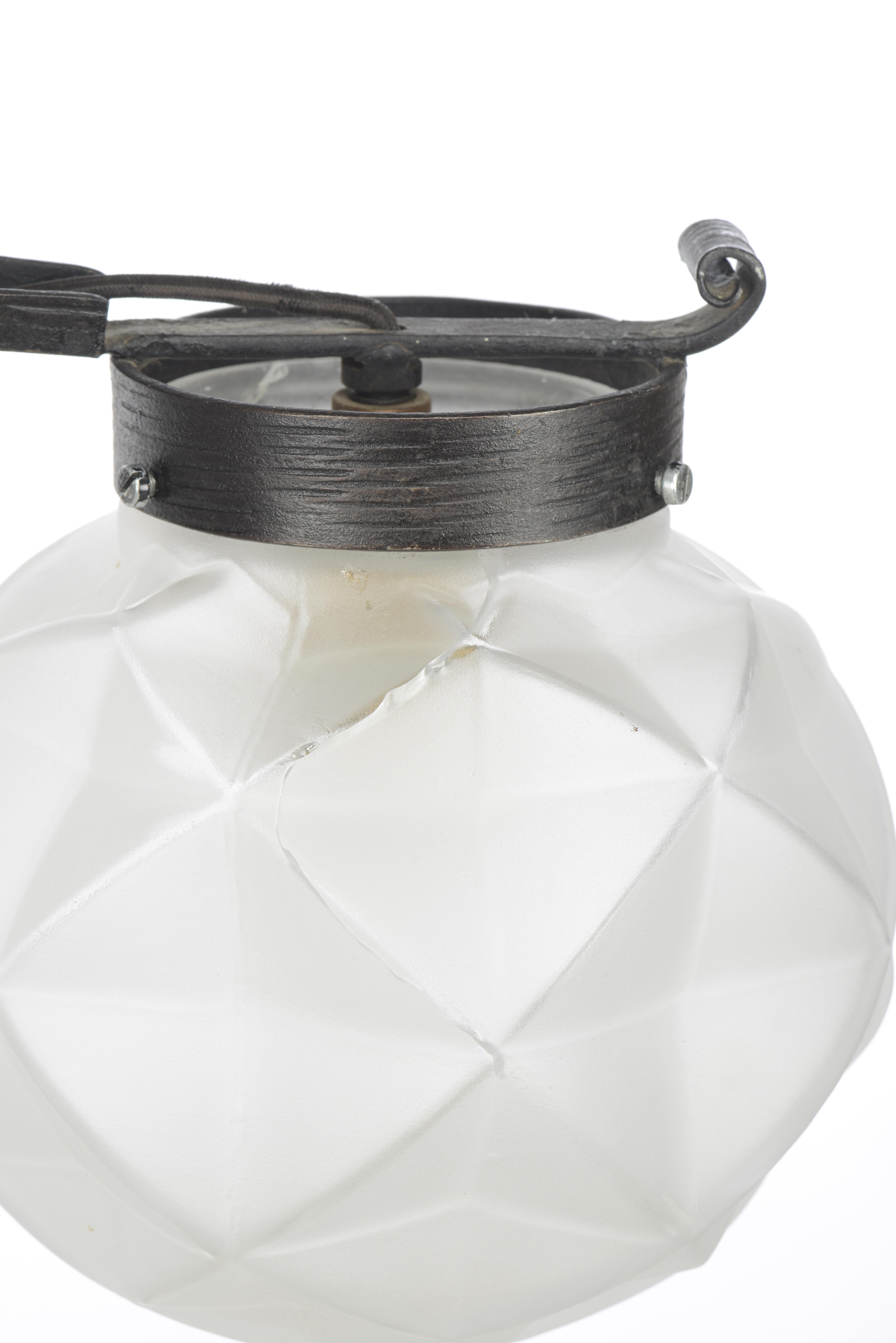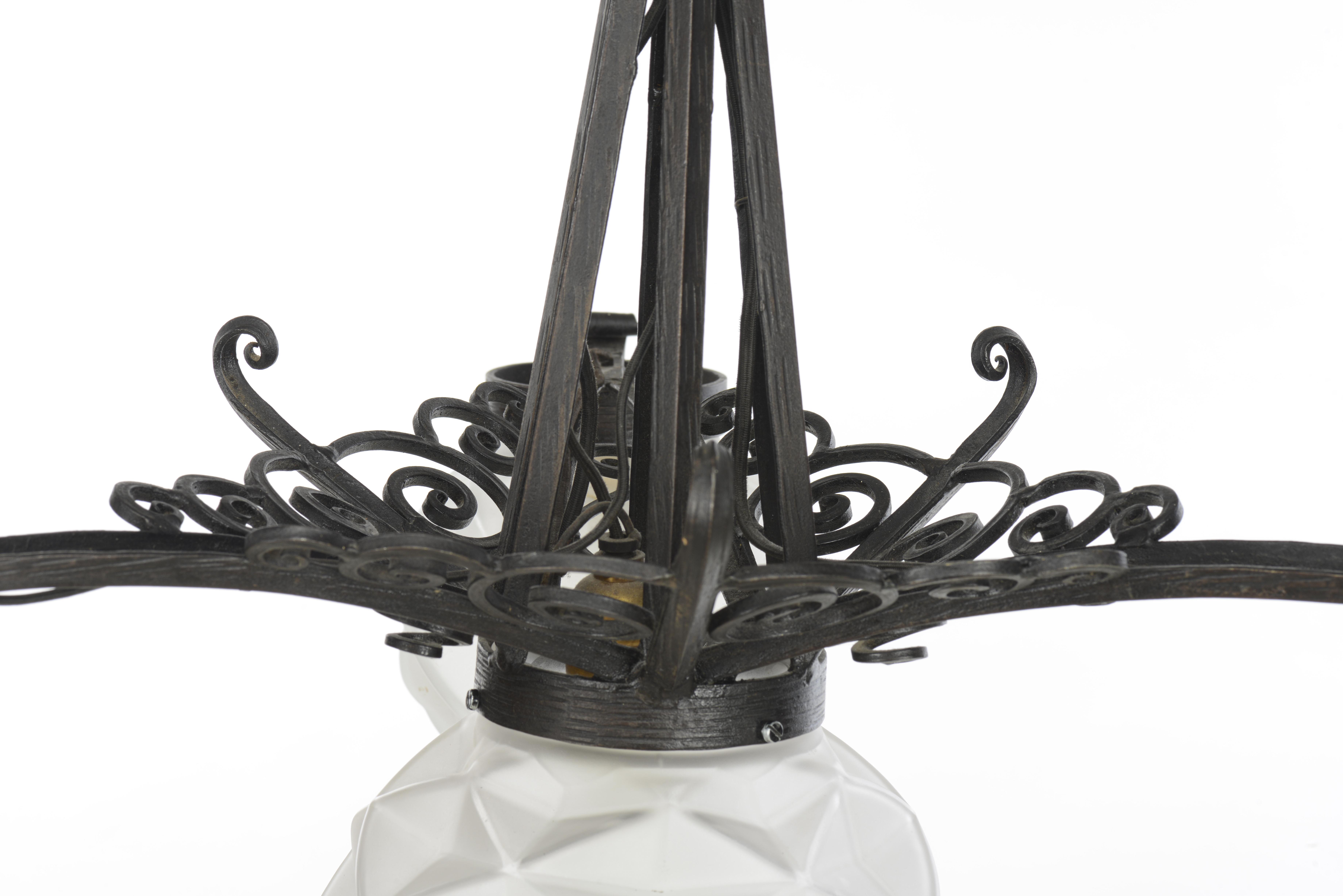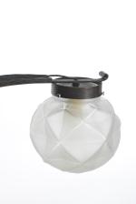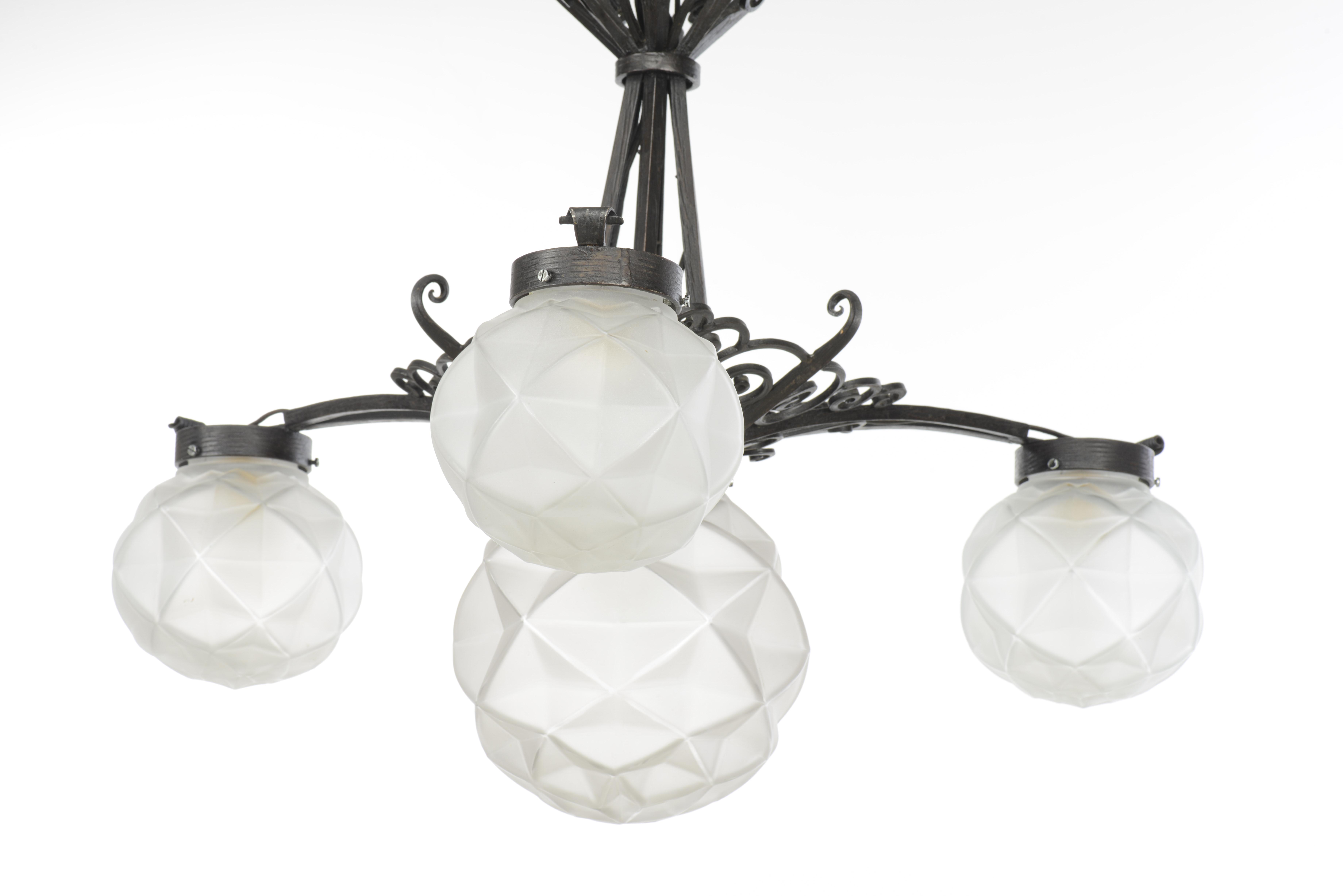 GENET et MICHON, lustre Art déco à quatre feux en fer forgé et boules en verre moulé faceté, la boule centrale est signée.
