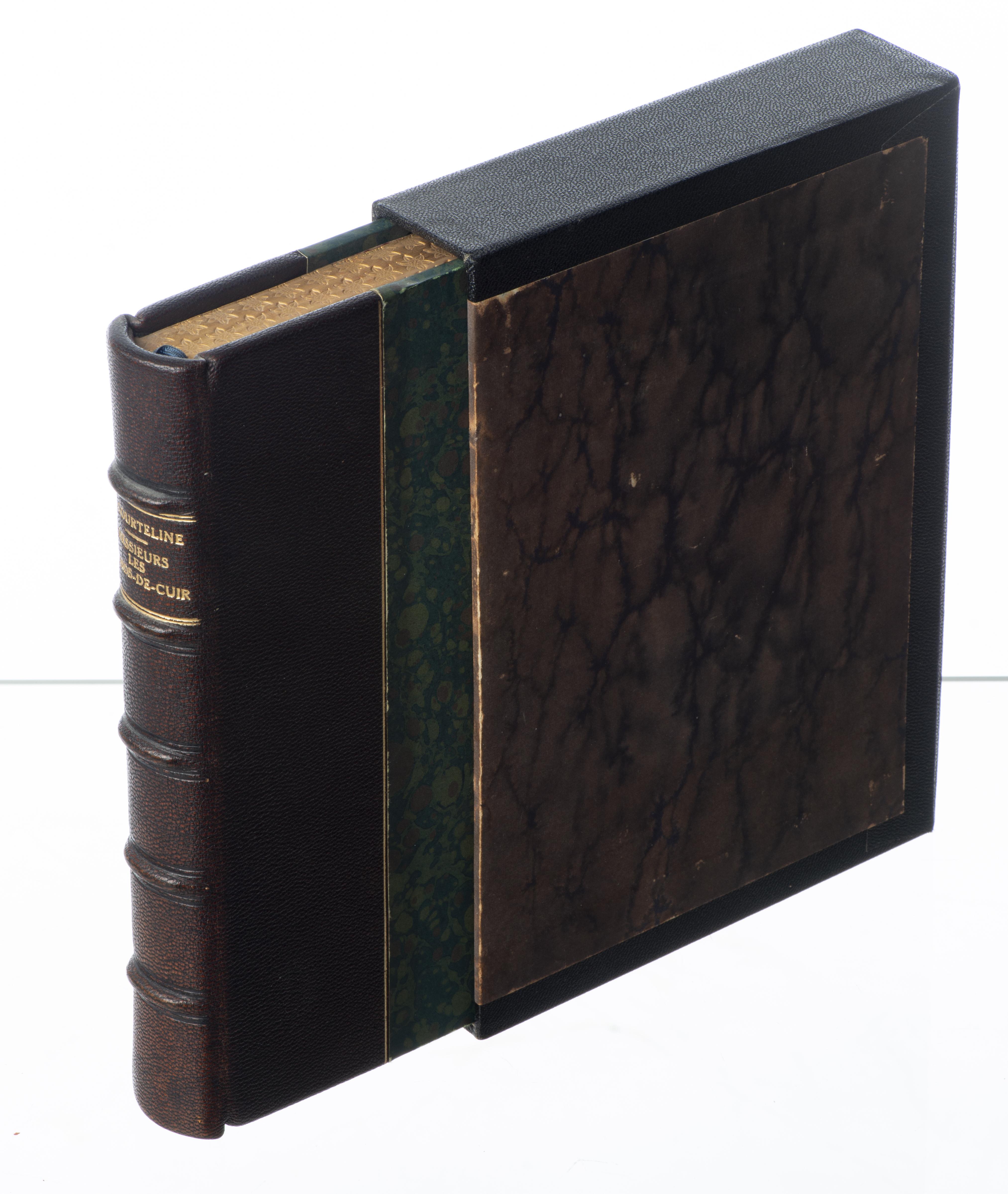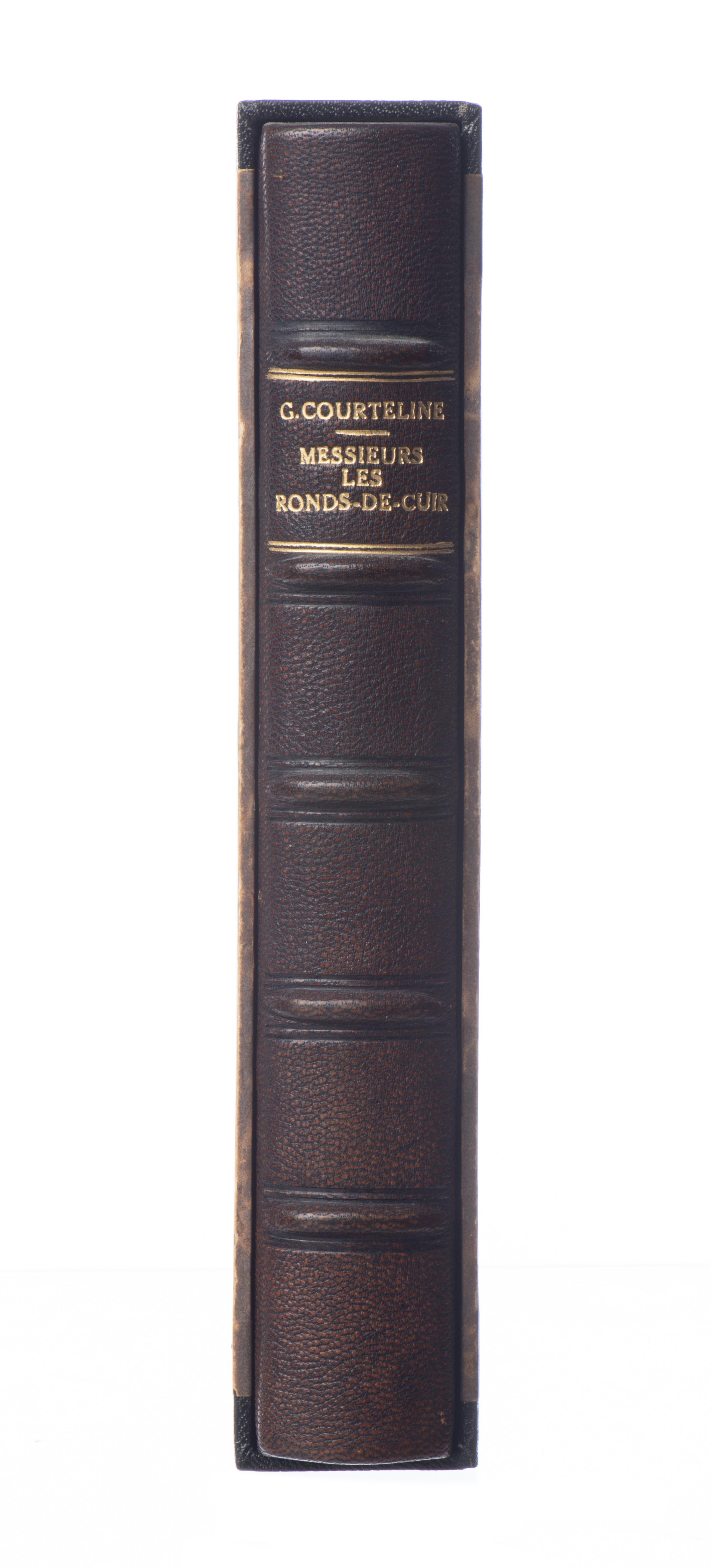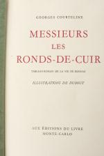 Georges COURTELINE,"Messieurs les Ronds-de-Cuir, Tableau-Roman de la Vie de Bureau", illustrations de DUBOUT, 1949, Editions Monte-Carlo, les lithographies de Doubout ont été tirées par Mourlot Frères à Paris, plaisant exemplaire relié en chagrin brun, avec une tête dorée ciselée avec les fleurs.
