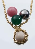 GILBERT ALBERT, chaîne pendentif en or jaune .750 texturé avec quatre billes interchangeables : acier, rodochrozite, agate verte et agate blanche.