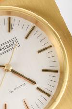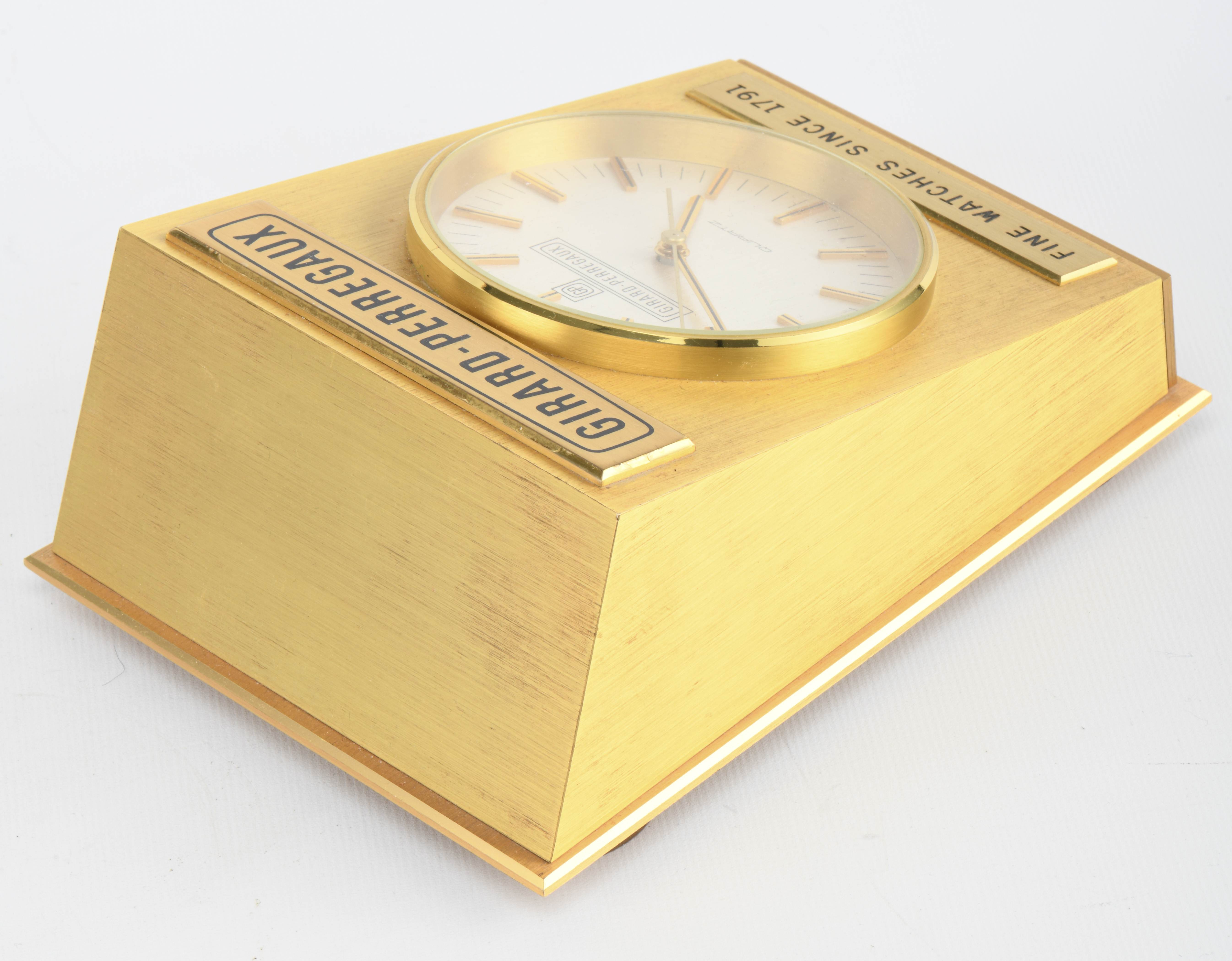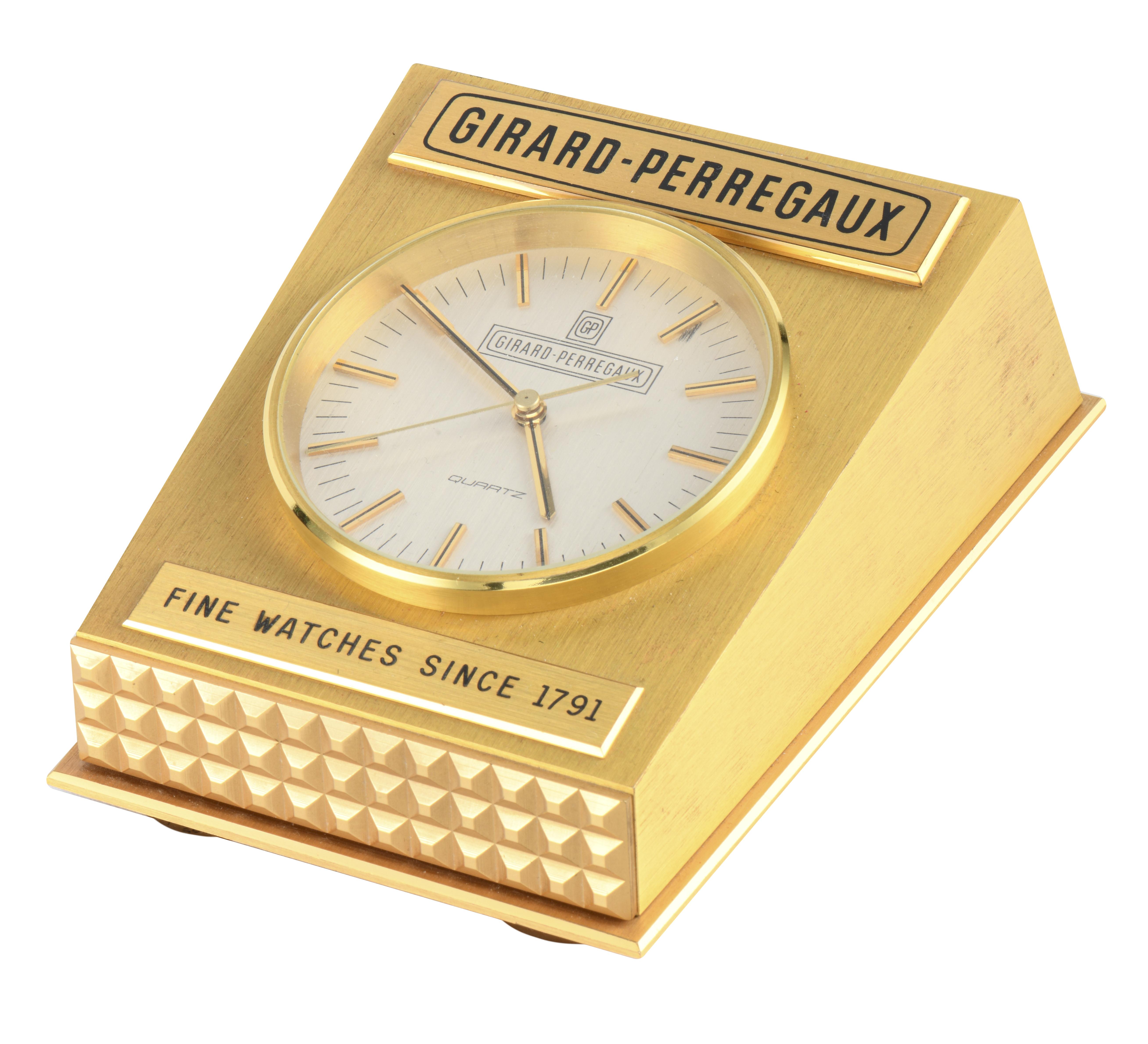 Girard-Perregaux, pendulette de table en métal doré, quartz, cadran argenté mat, index appliques bâton et aiguilles noirs et dorés.