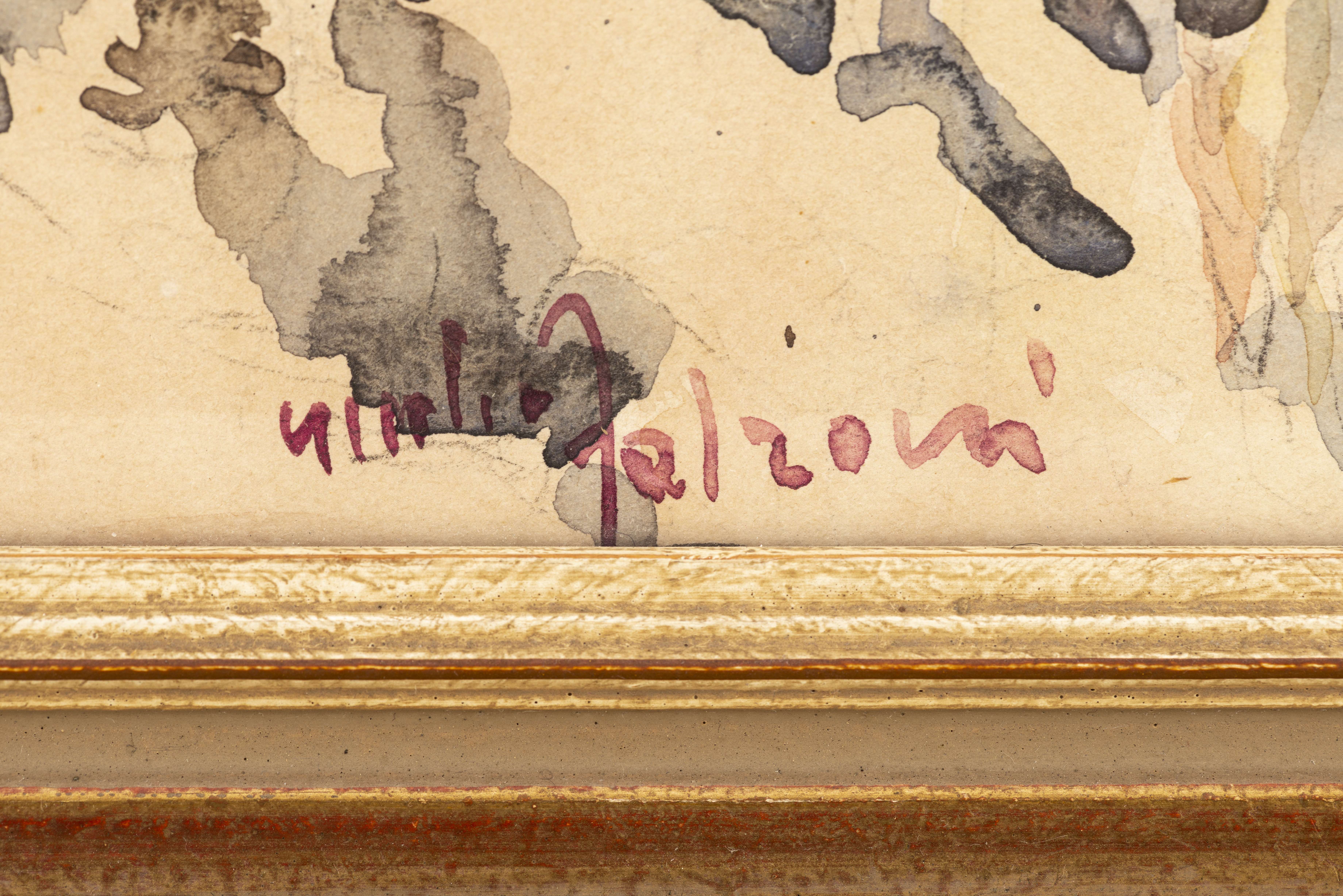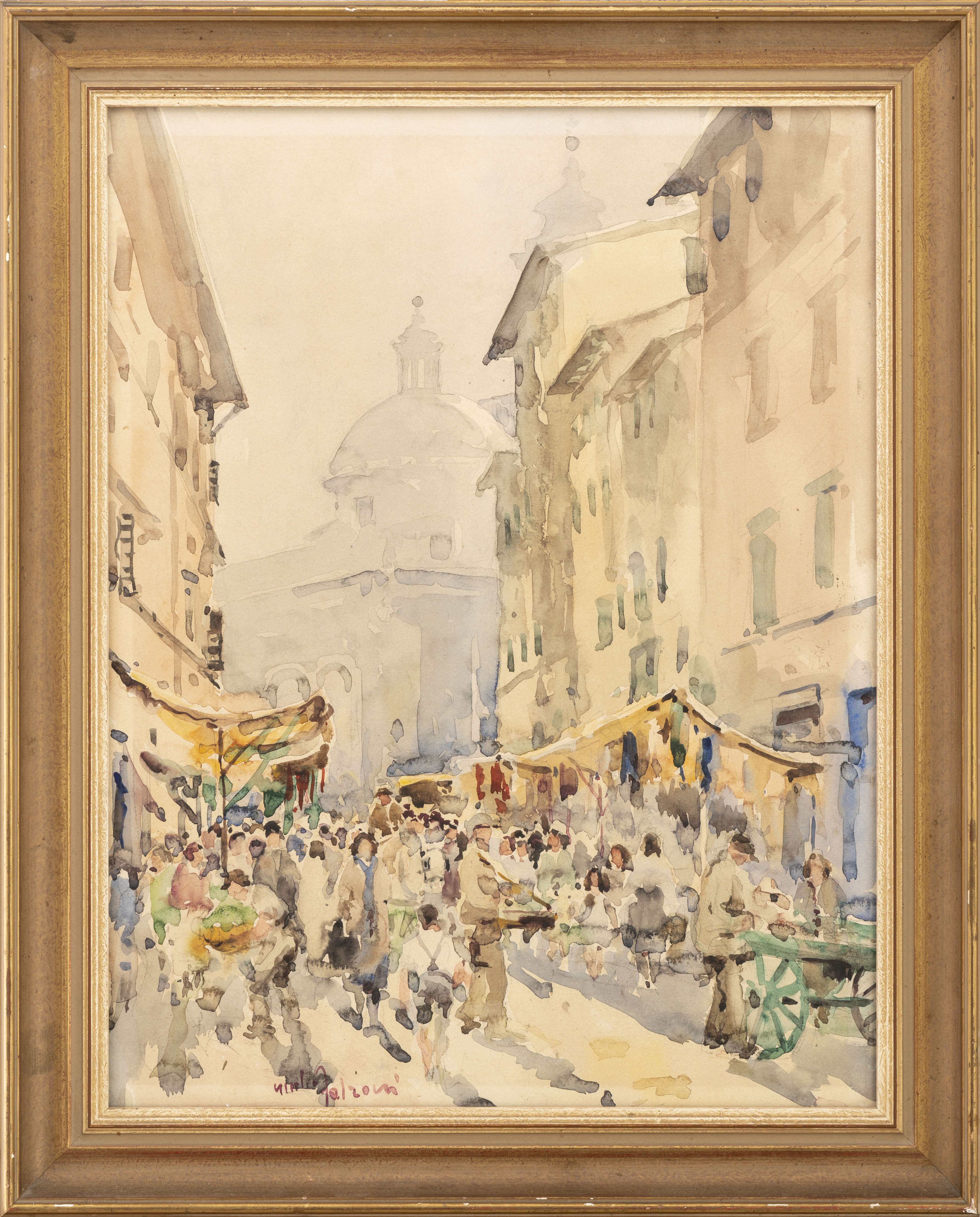 Giulio FALZONI (1900-1978) "Marché de Florence", aquarelle sur papier, signée en bas à gauche en rouge et inscrite au crayon au dos 1947.
