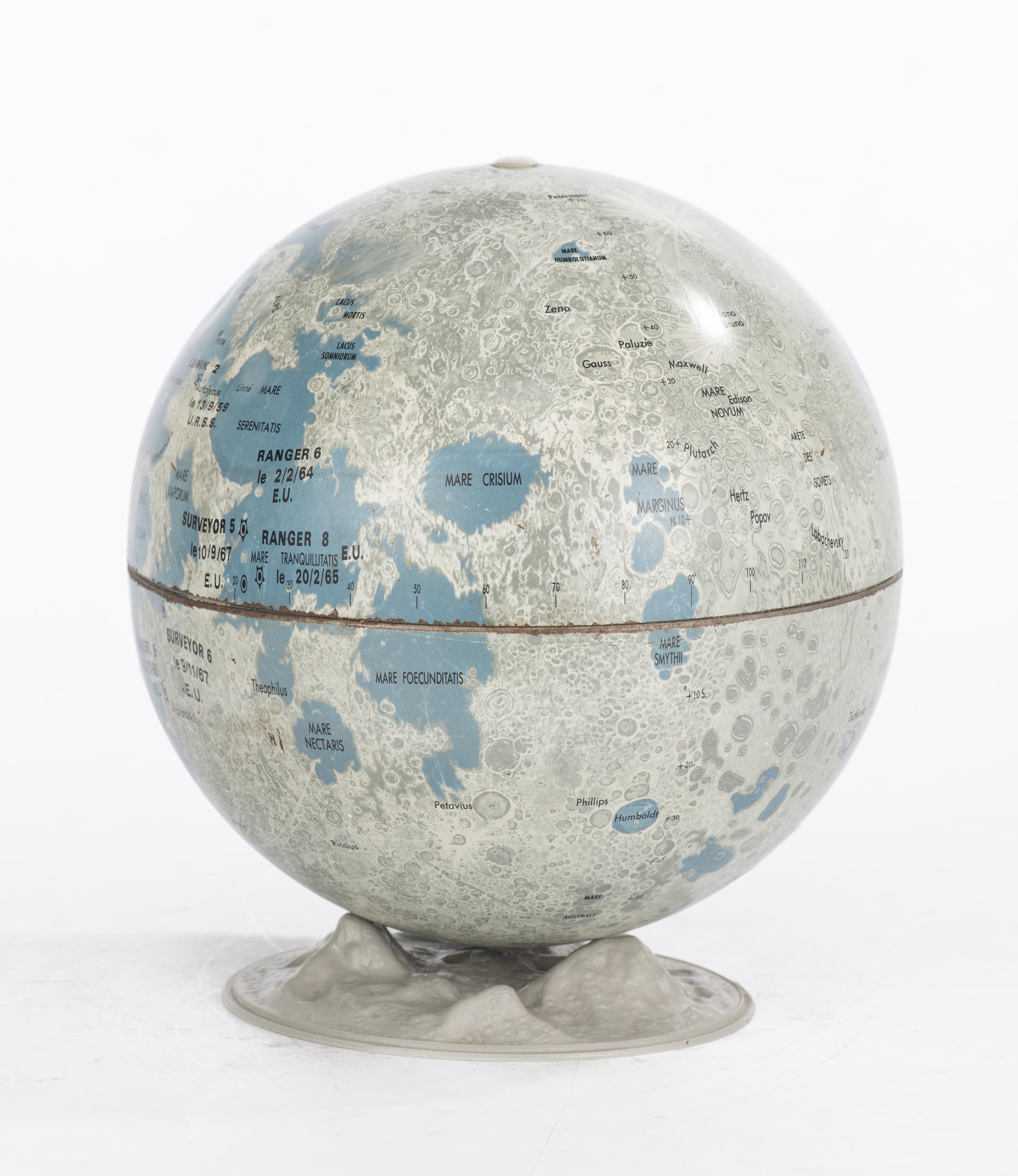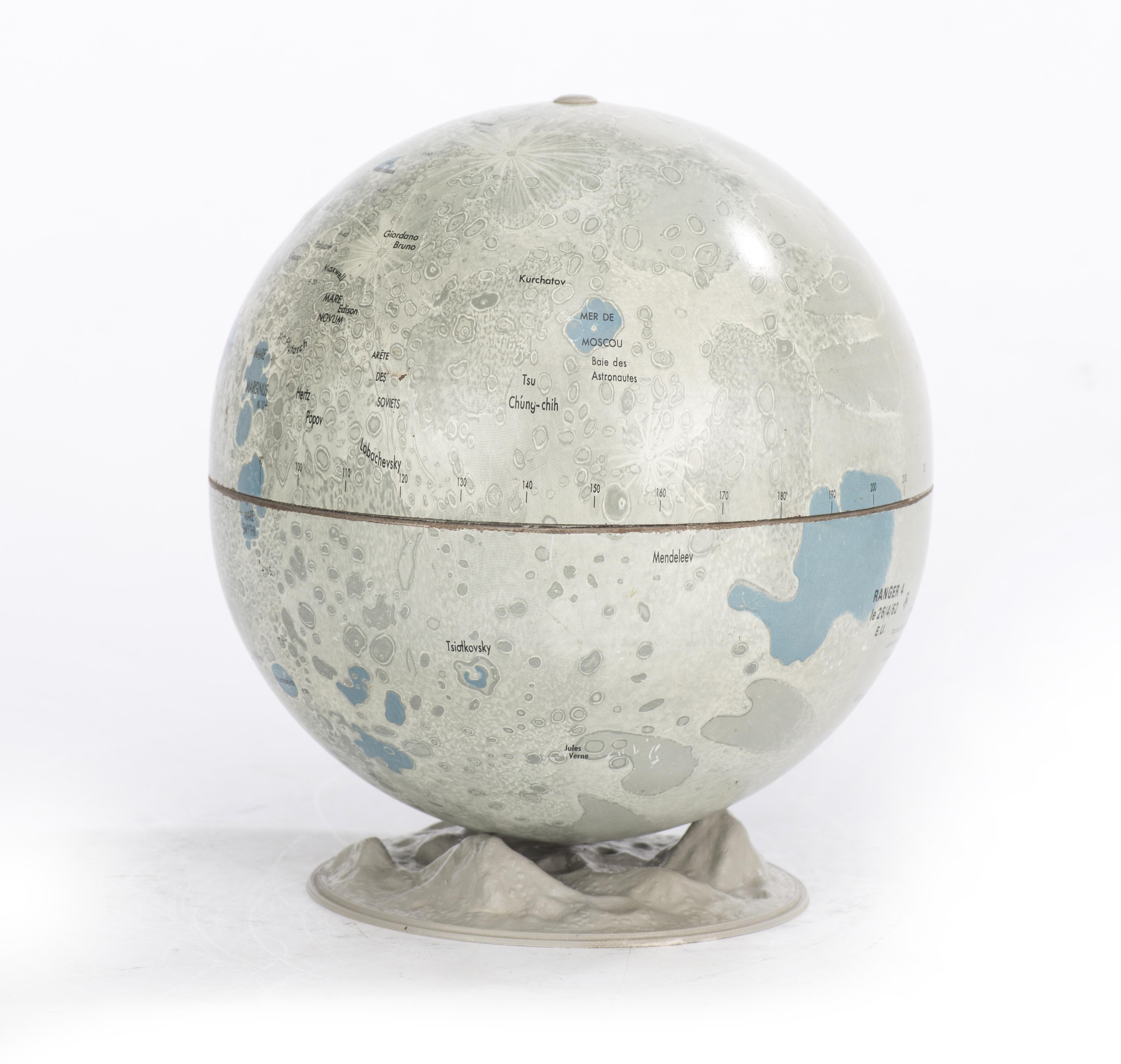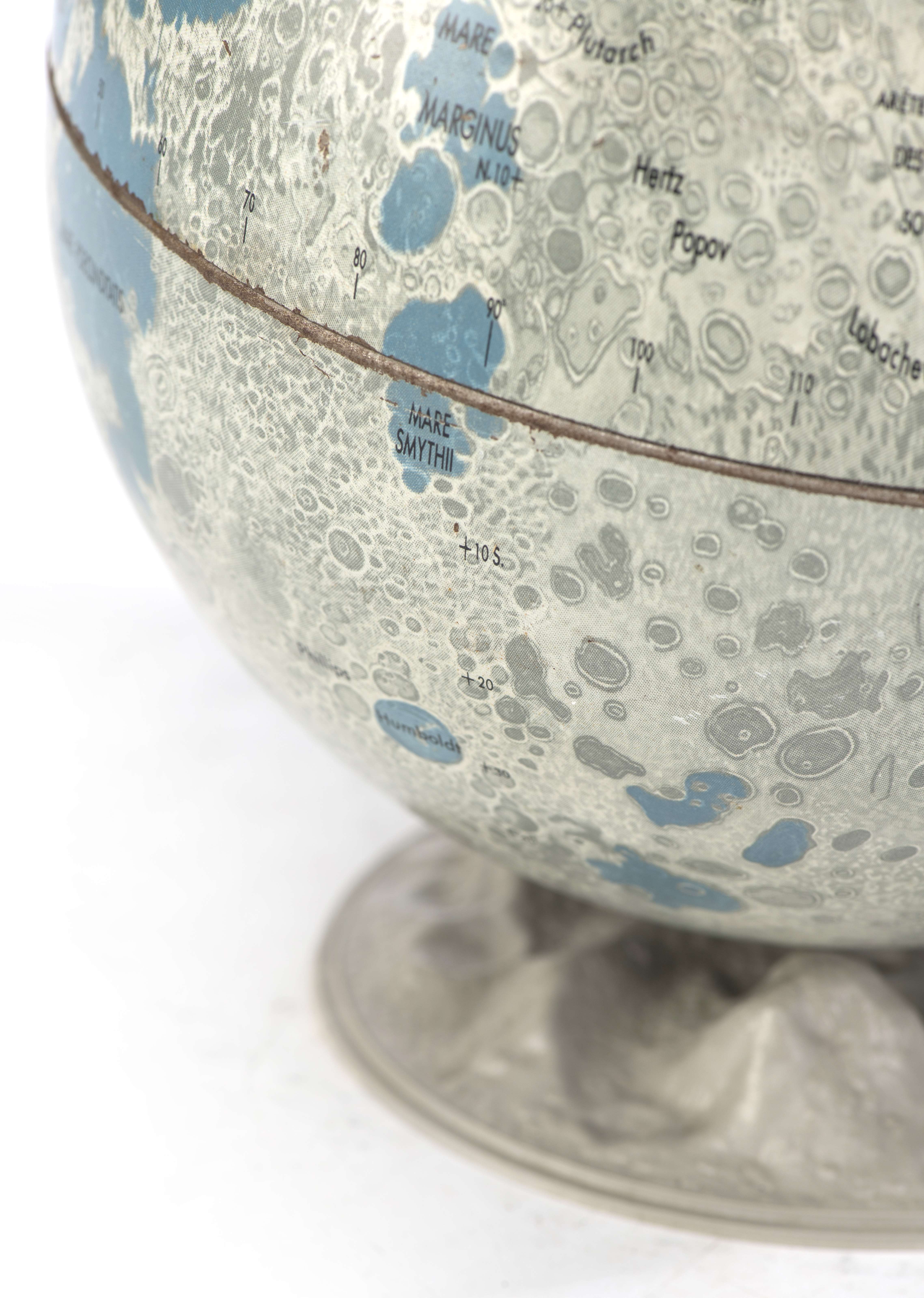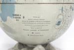 Globe lunaire en métal fabriqué par Scan-Globe et produit par Robert I. Johnson, Directeur Richard M. Grossman et Equipe, de Cartographes Adler Planetarium and astronomical museum 1:22,809,600 ou un pouce = 360 milles. Copyright Replogle Globes, Inc., Chicago, III 1966 Made in Denmark