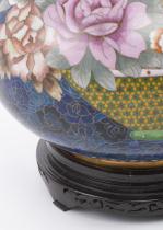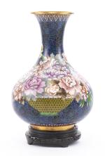 Grand vase en cloisonné sur fond bleu à décor de pivoines, Chine, XXe siècle. Avec son socle en bois teinté.