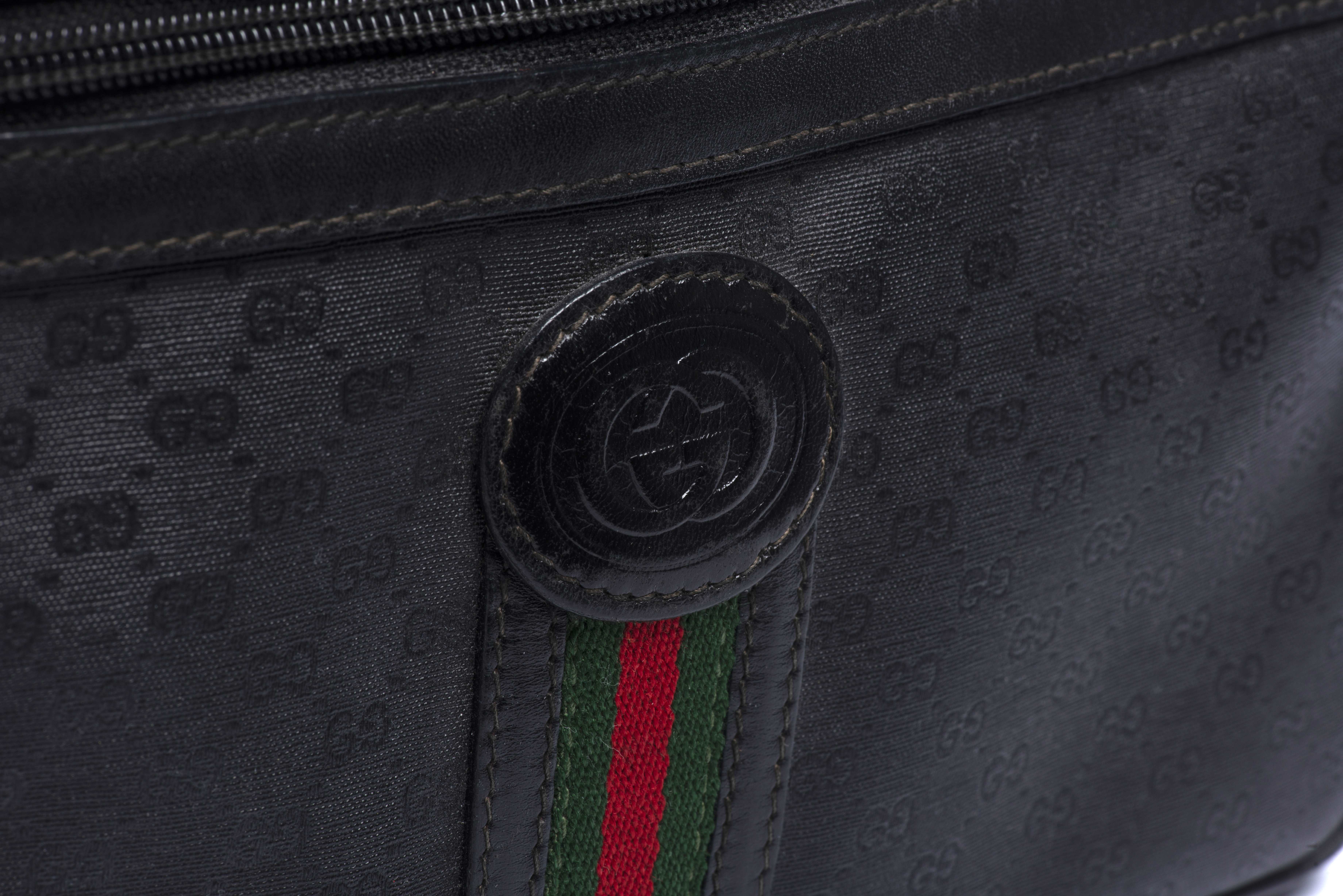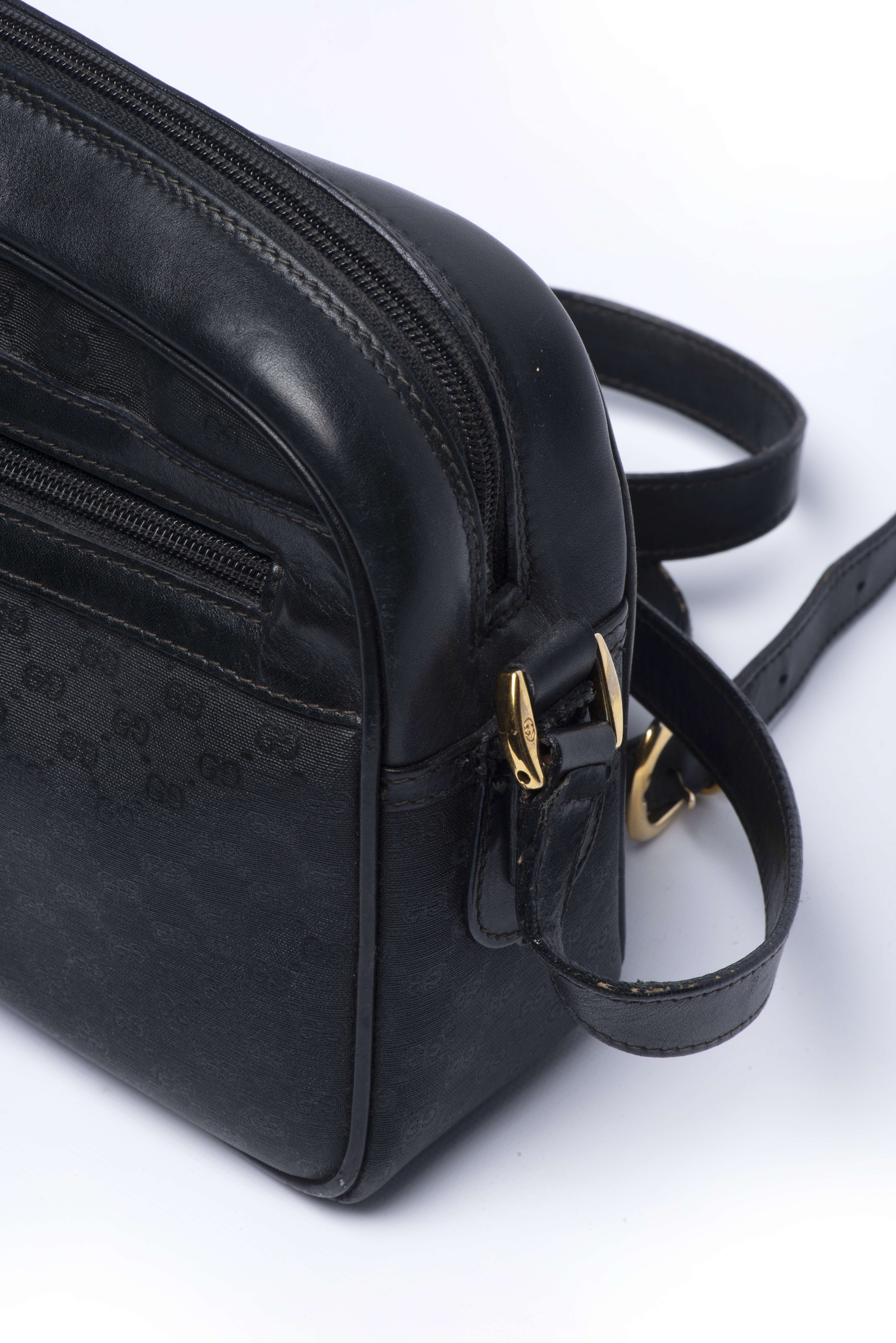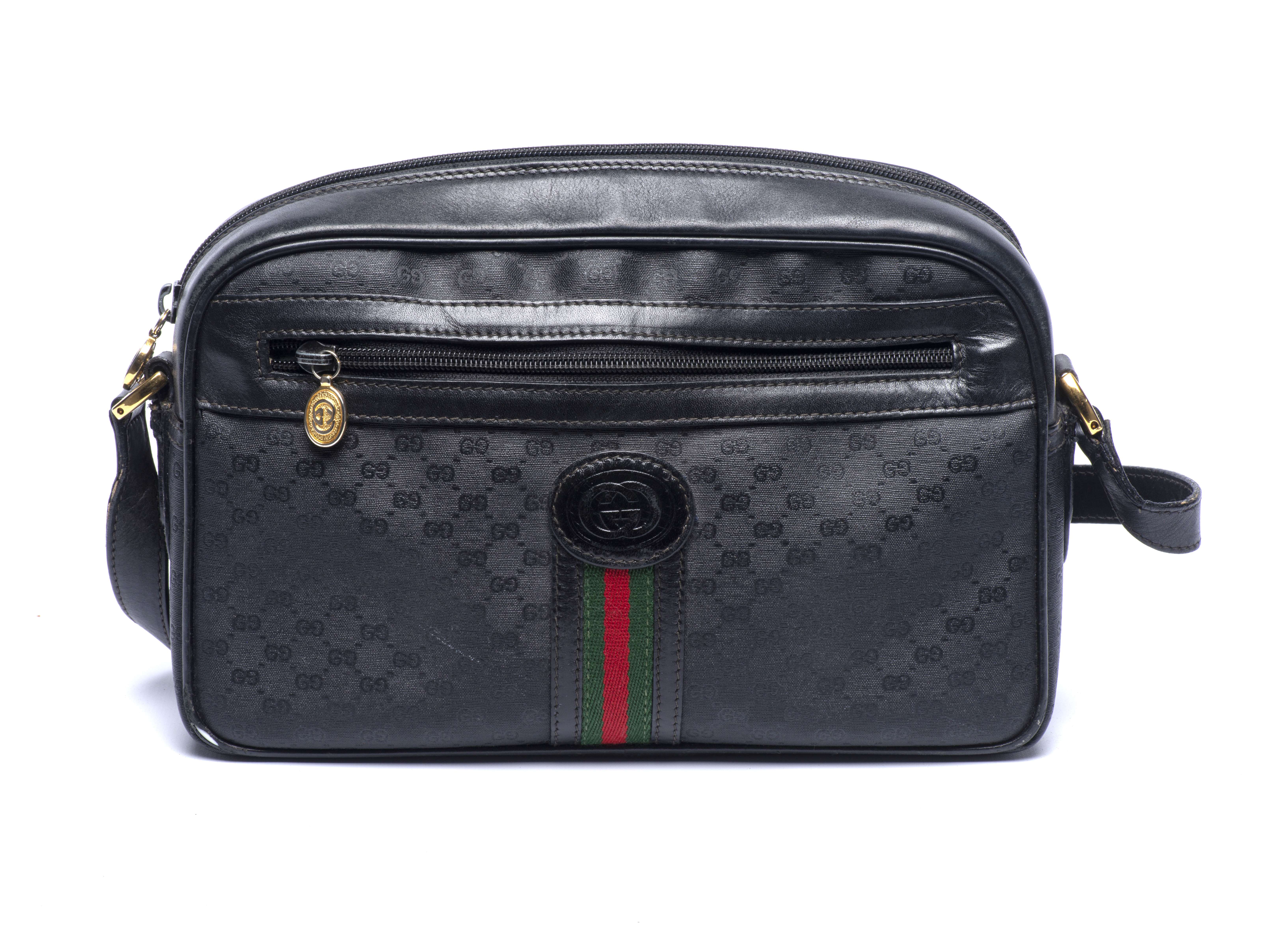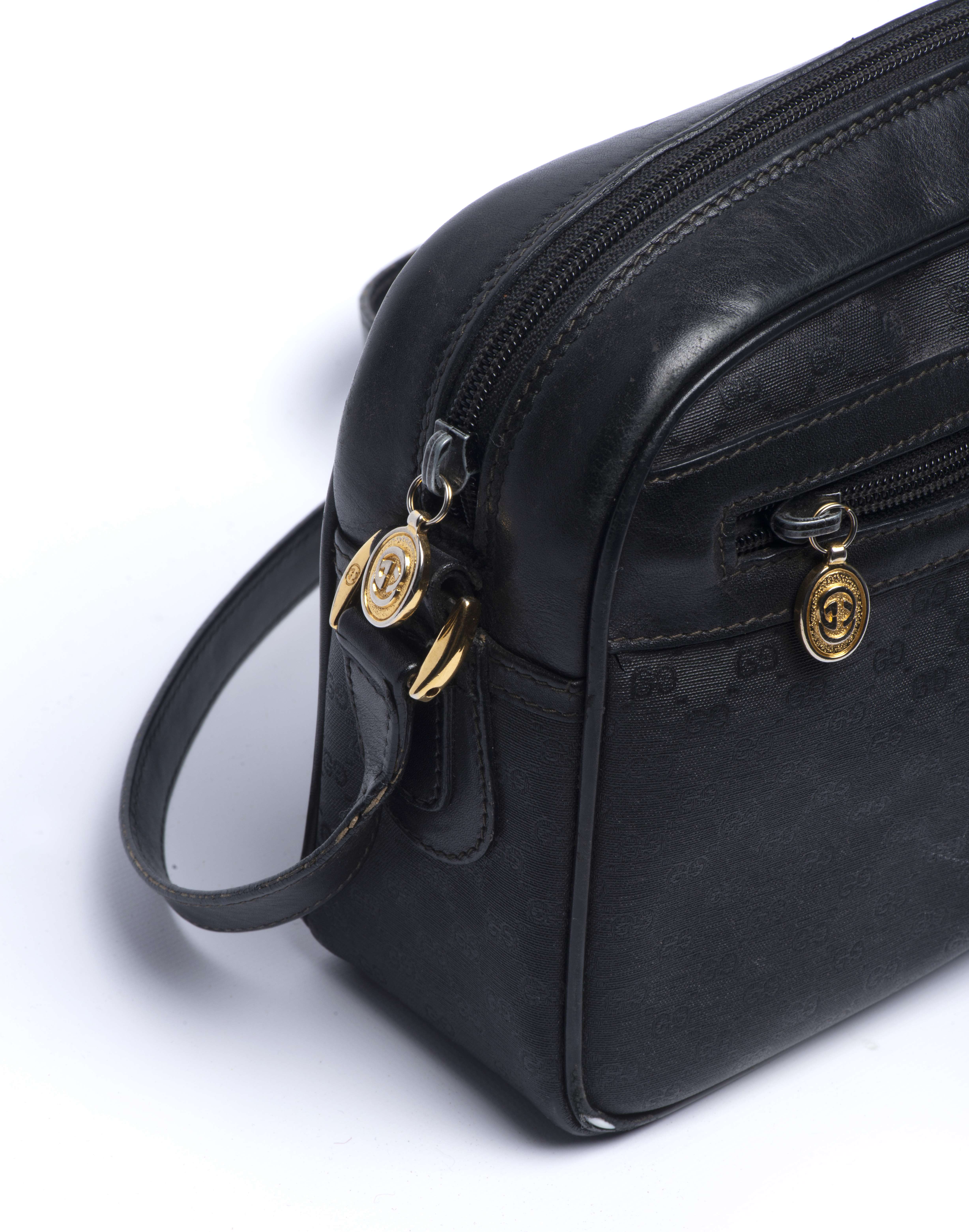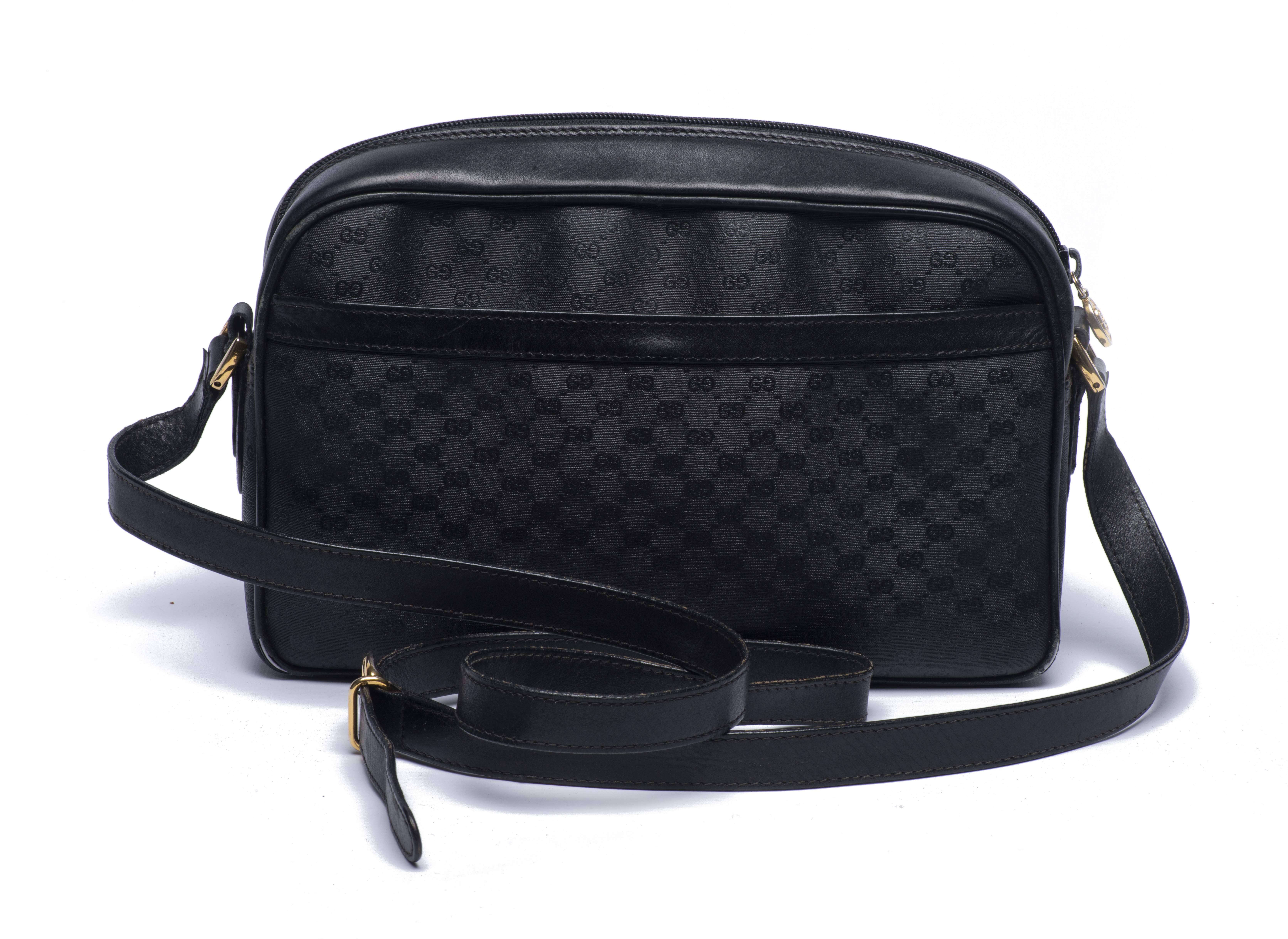 Sac à bandoulière Gucci, toile monogramme noire et cuir noir. Intérieur tissu noir.
