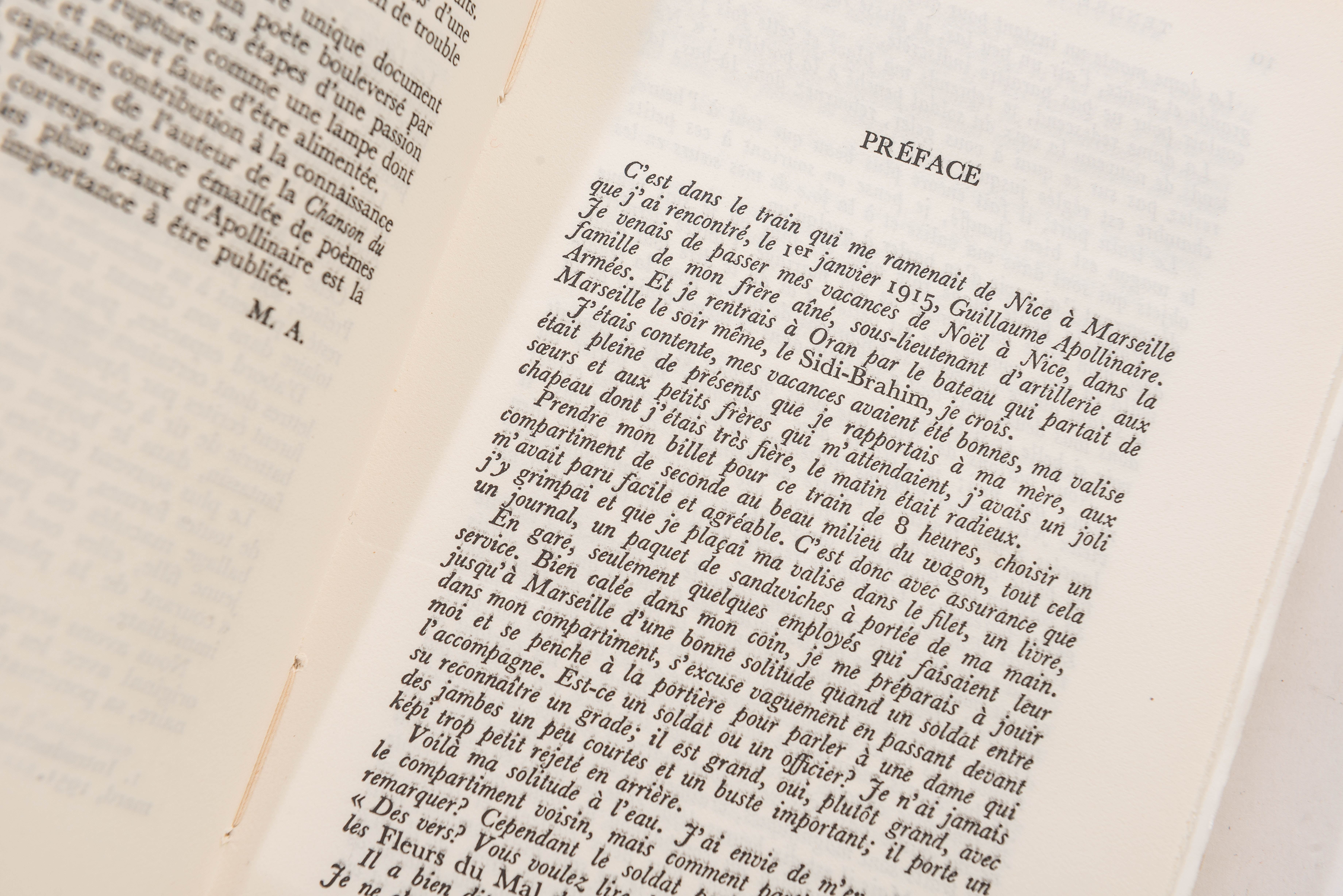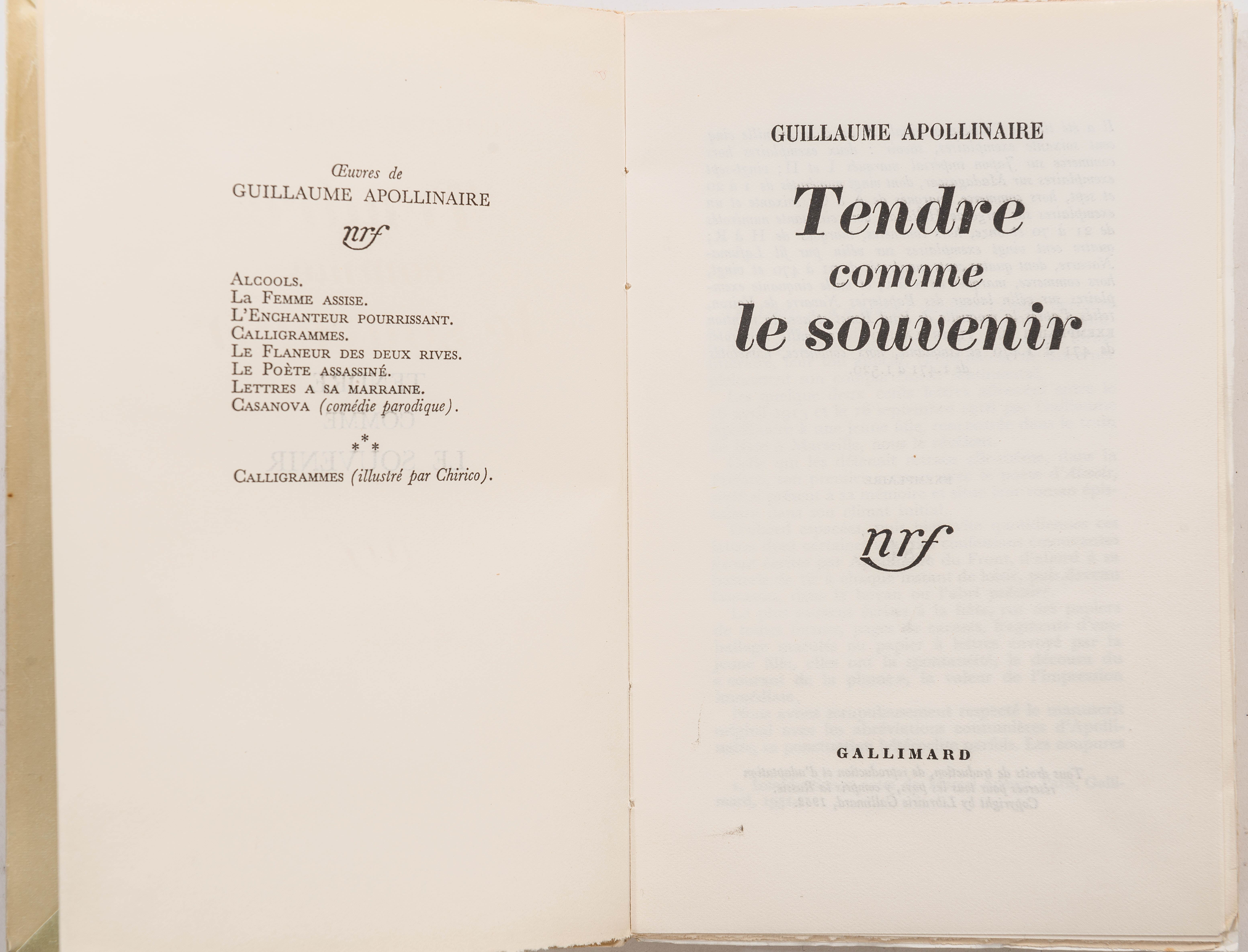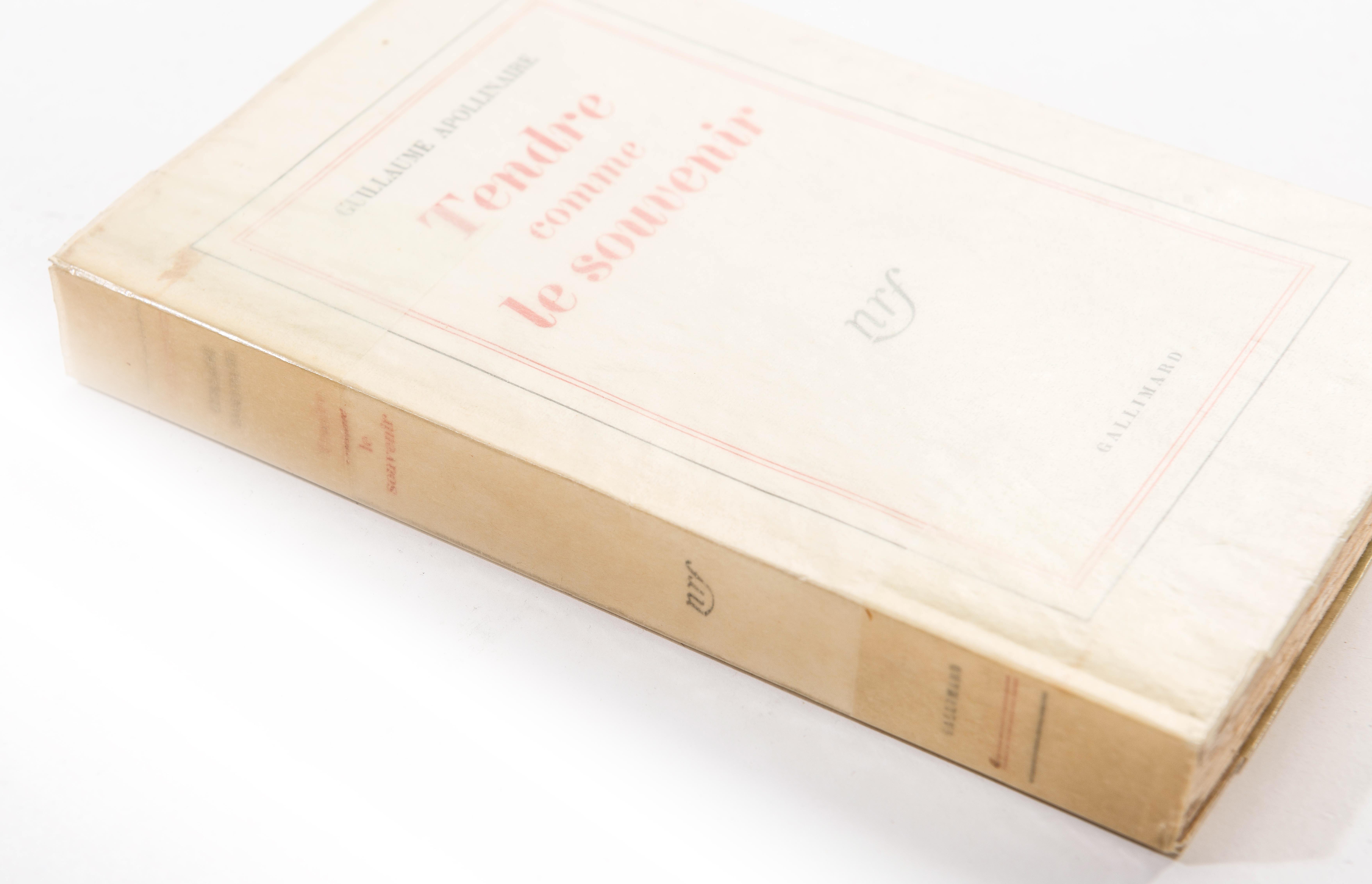 Guillaume Apollinaire, "Tendre comme le souvenir", NRF, Gallimard, Paris 1952. Edition originale broché. Un des 420 exemplaires sur vélin pur fil Lafuma-Navarre. Exemplaire numéroté 380. In-12°, 19x12.3 cm