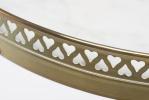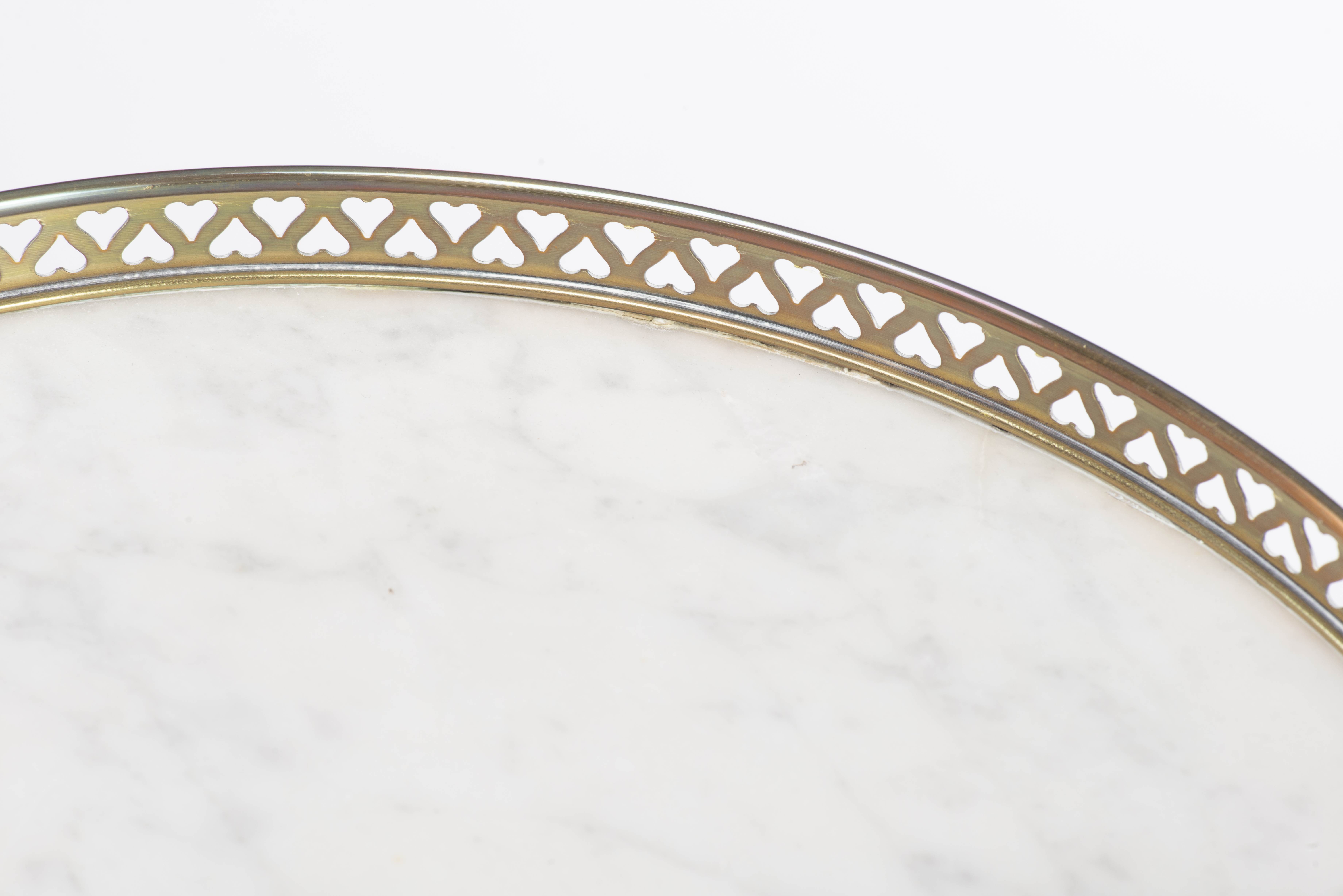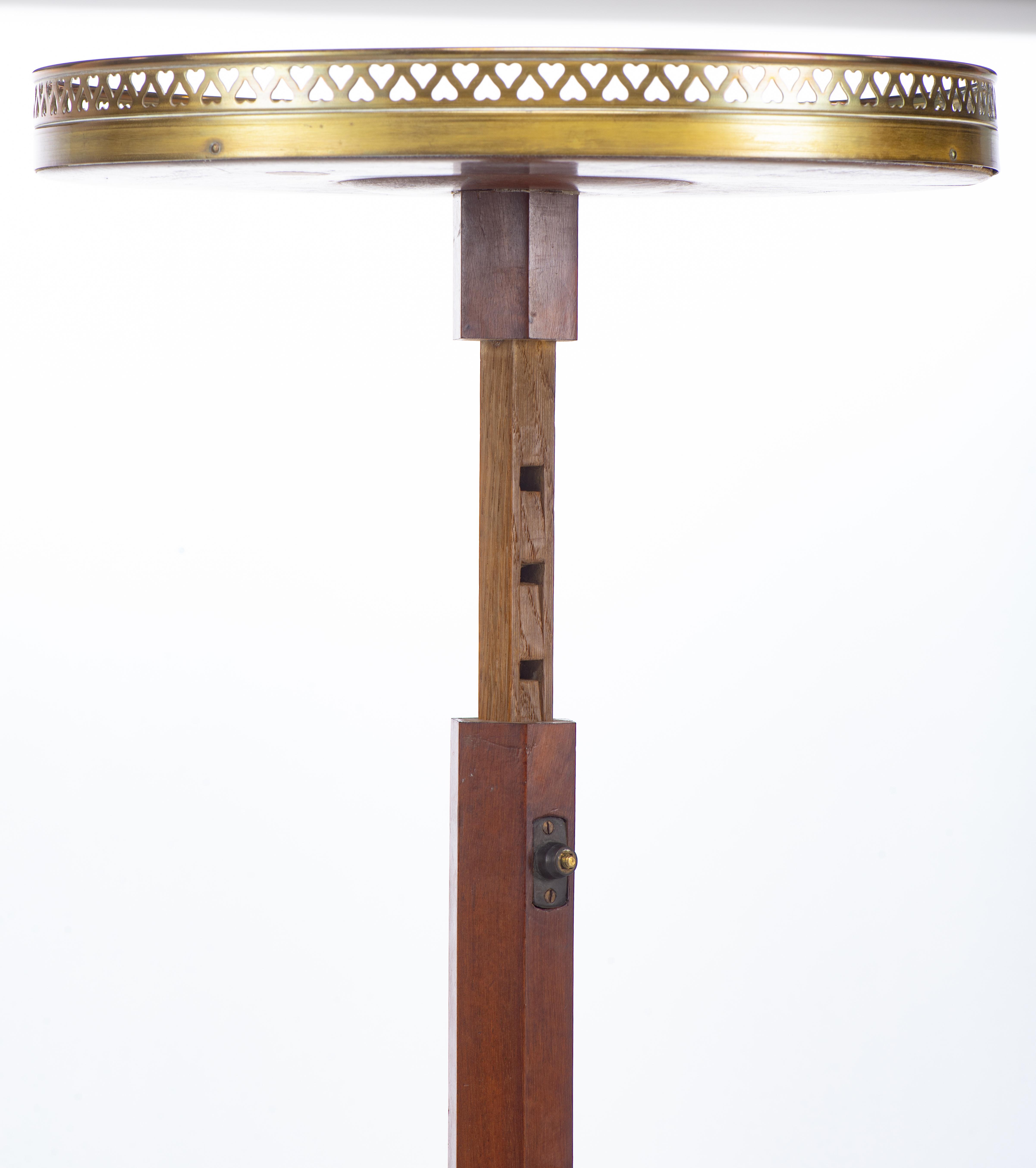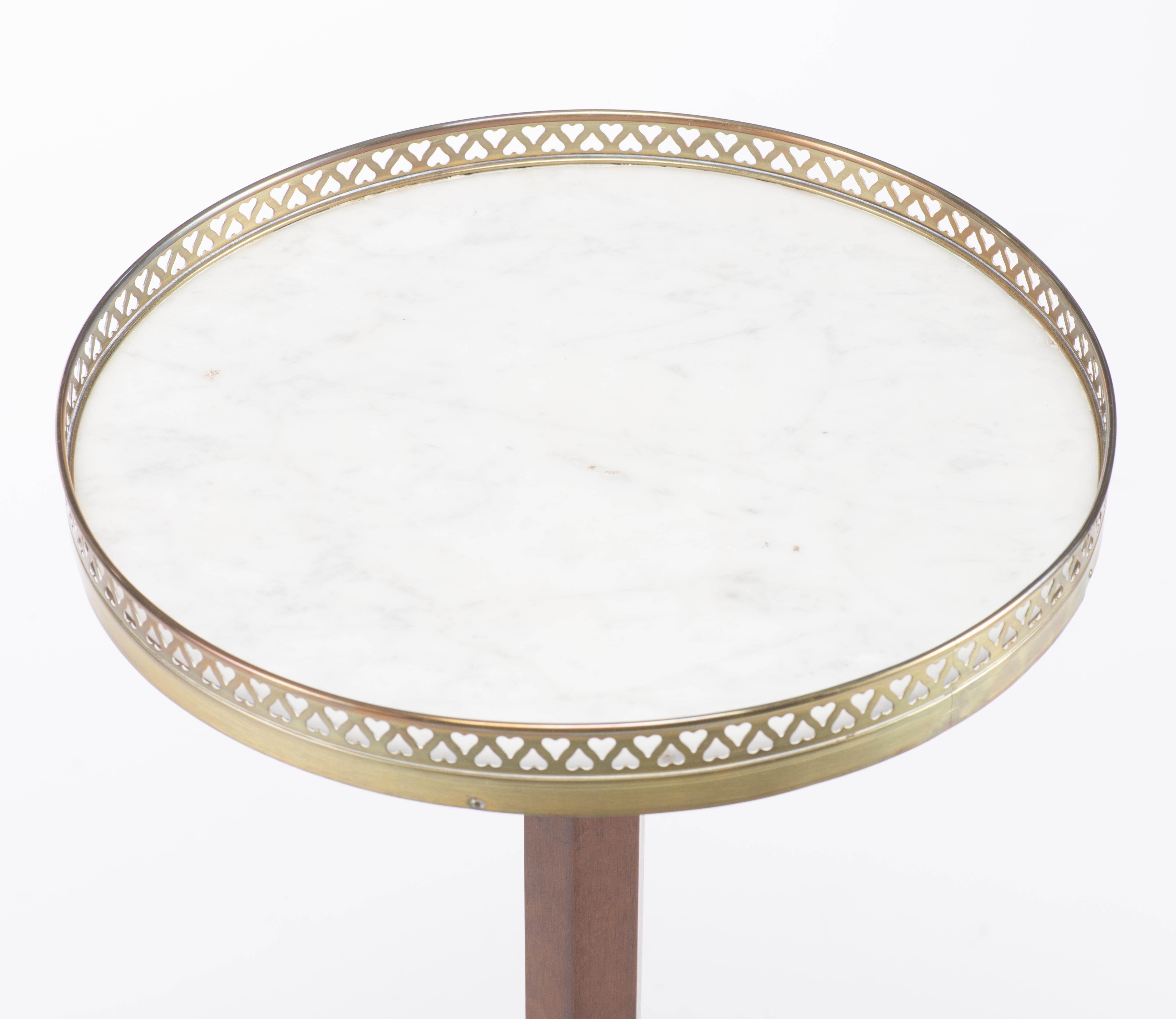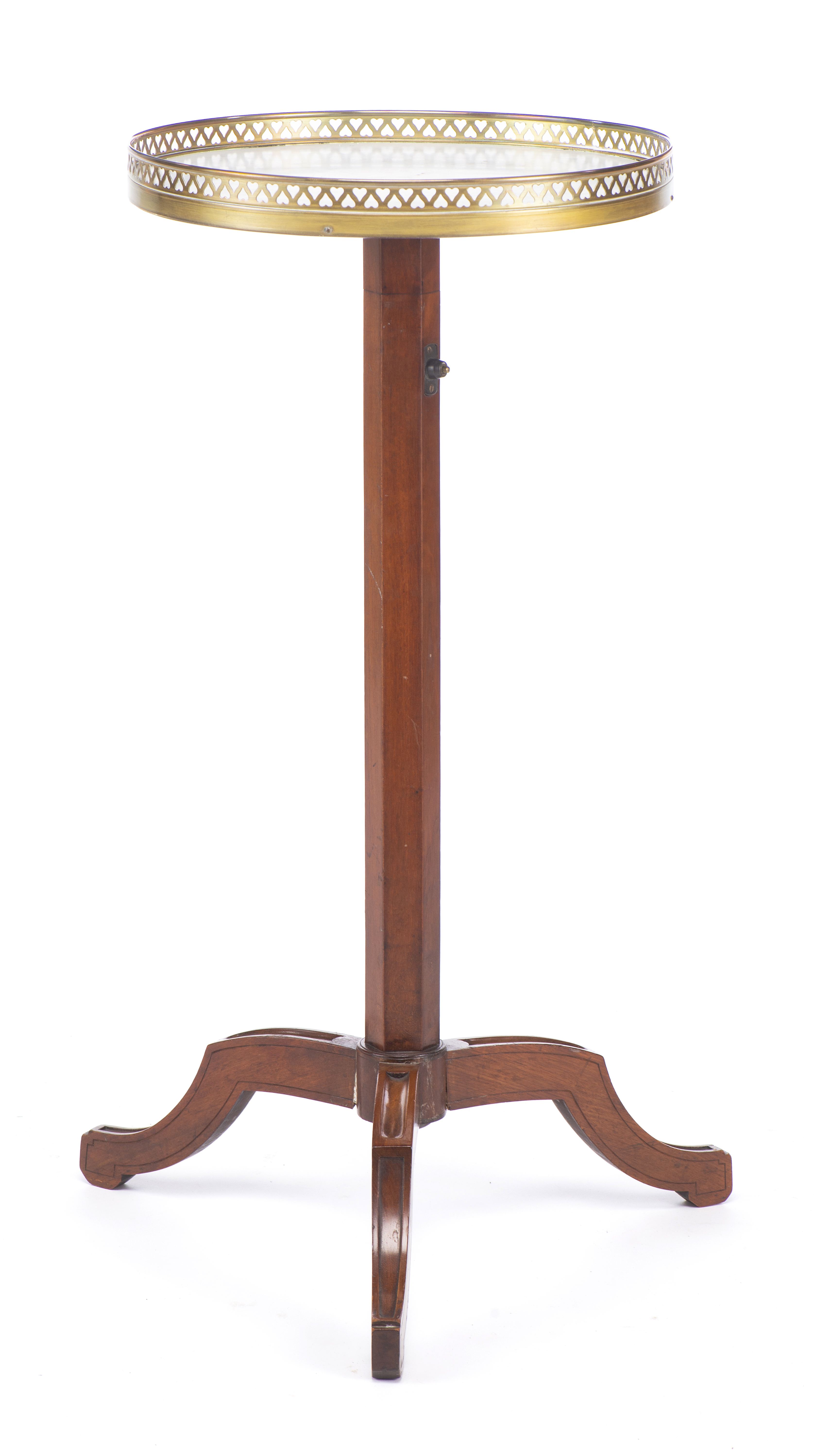 Guéridon rond réglable de style Louis XVI à plateau de marbre blanc et galerie de laiton ajourée à motif de cœurs en tête-bêche, pied en acajou terminé par trois patins.