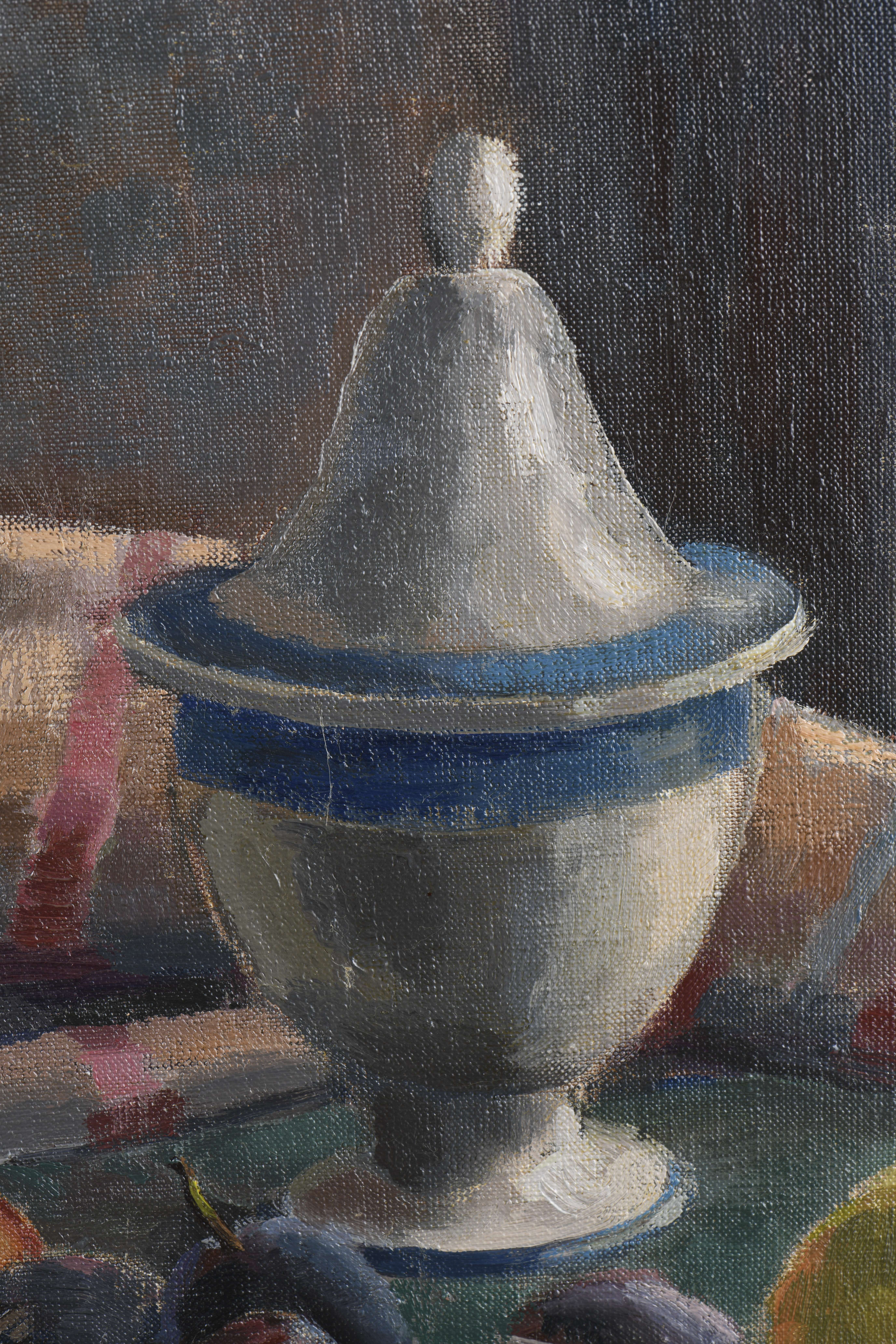 - "Nature morte à l'urne et aux fruits", signé en bas à droite.