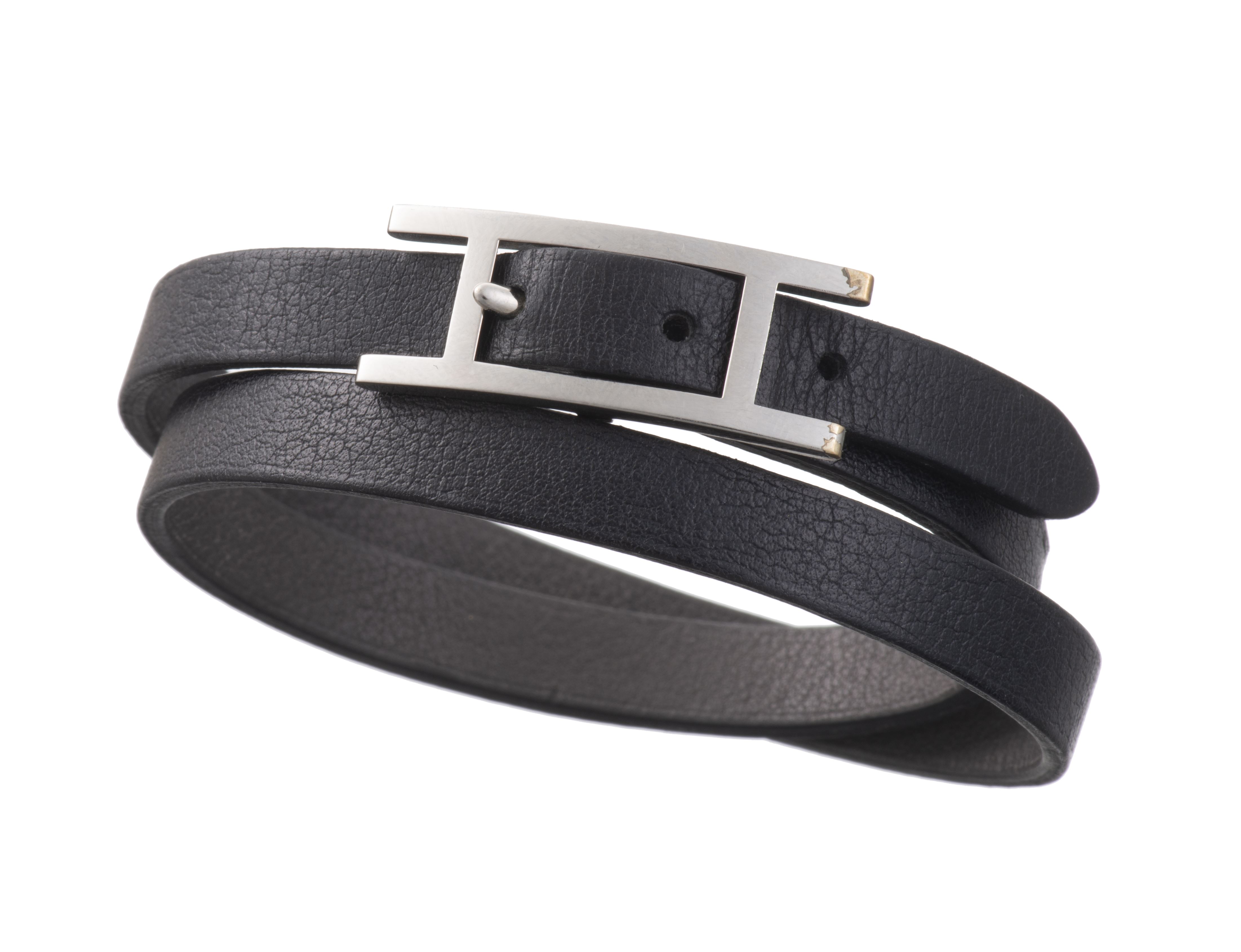 Hermès Belhappi bracelet double tour réversible en veau Chamonix et veau Tadelakt noir, fermoir avec boucle ardillon H en métal palladié.