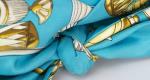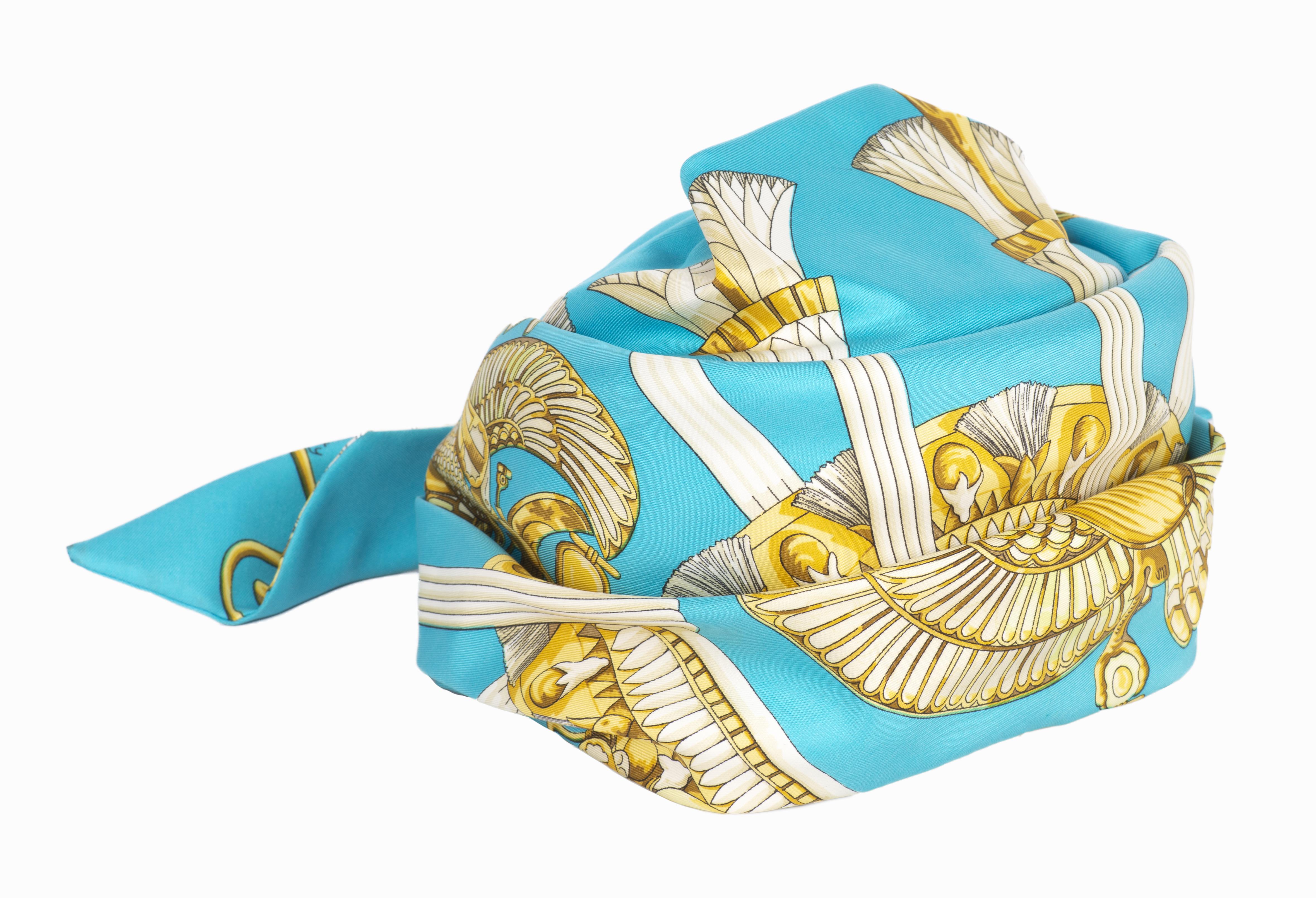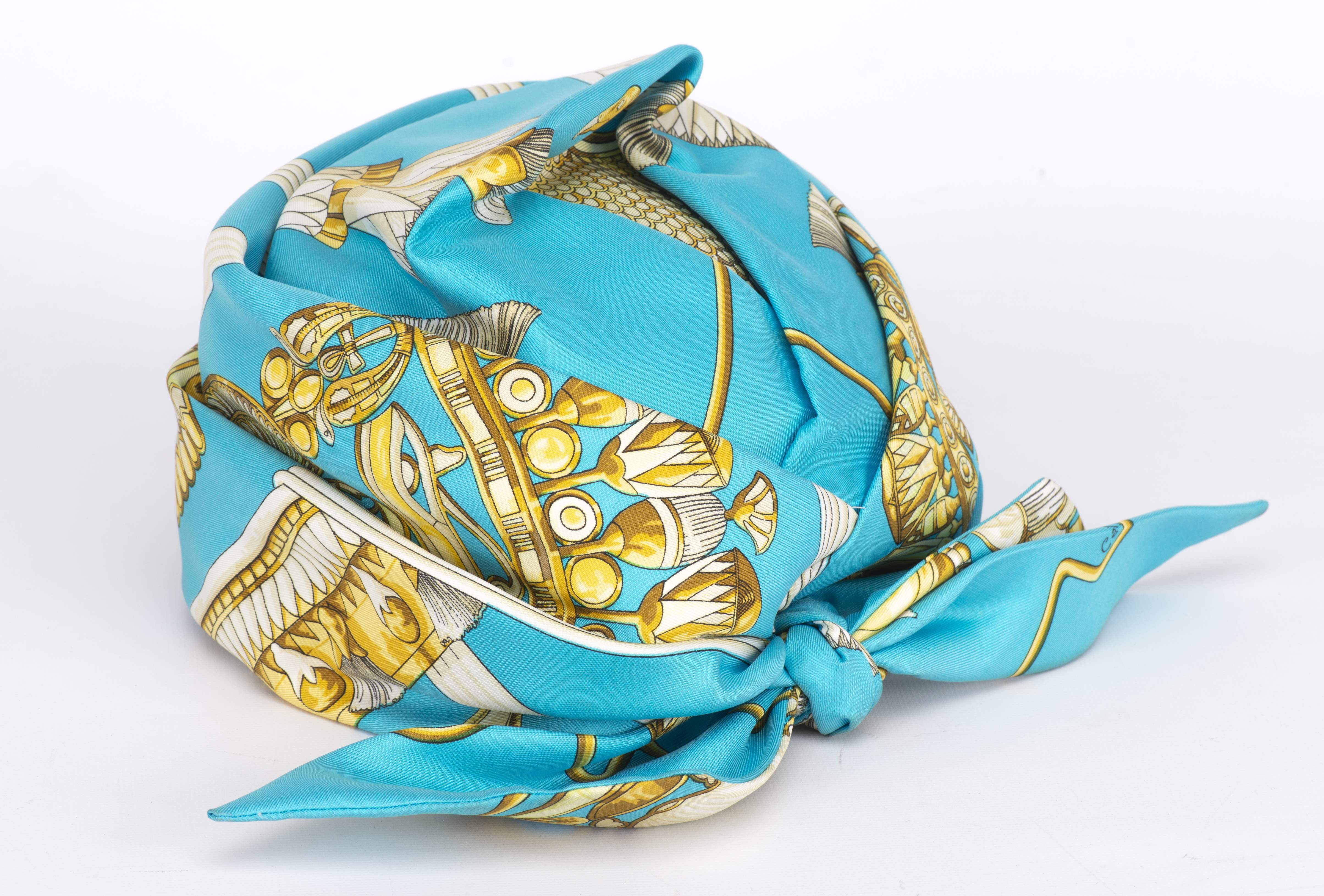Hermès coiffe turban en soie bleu azur et or