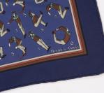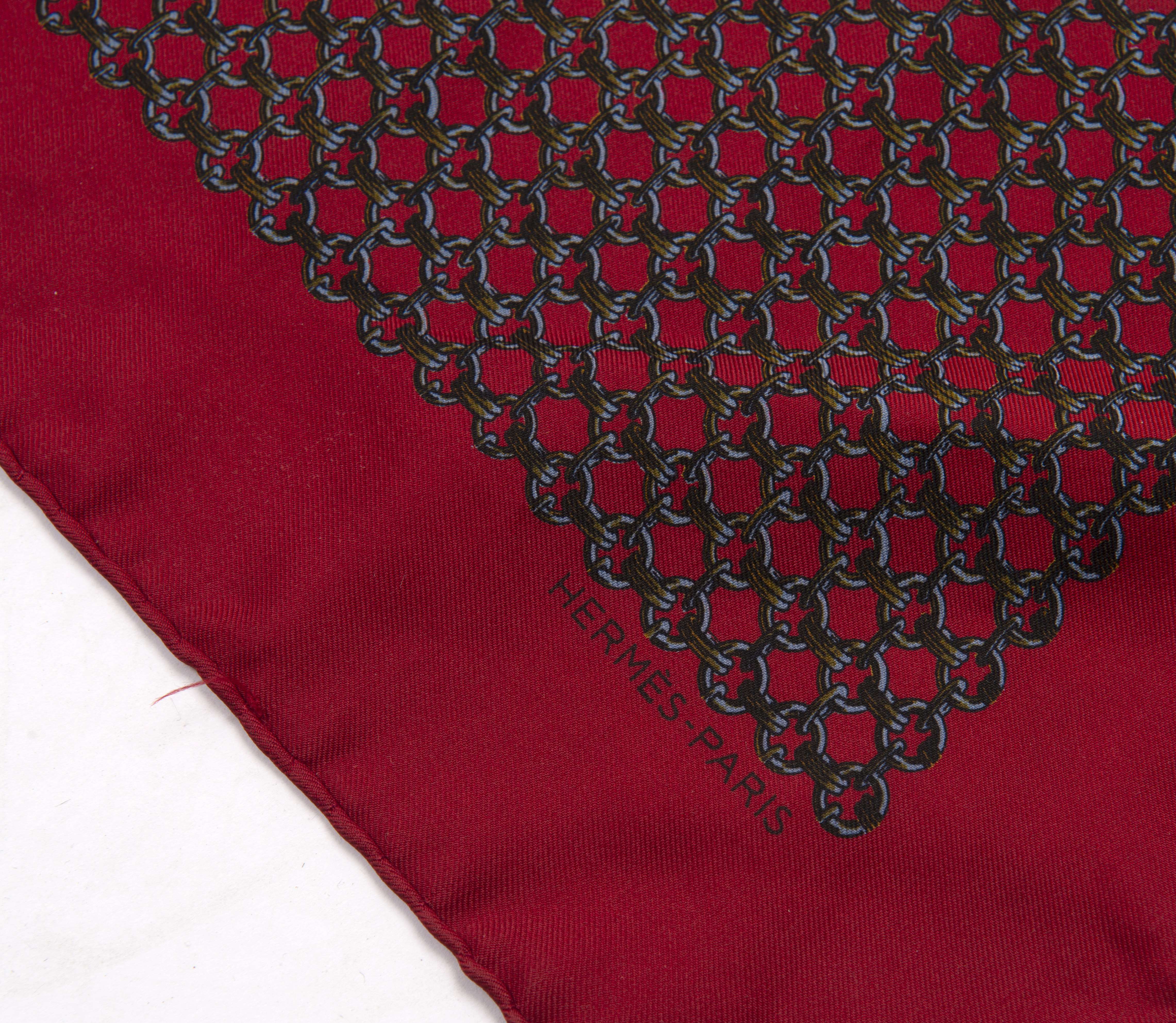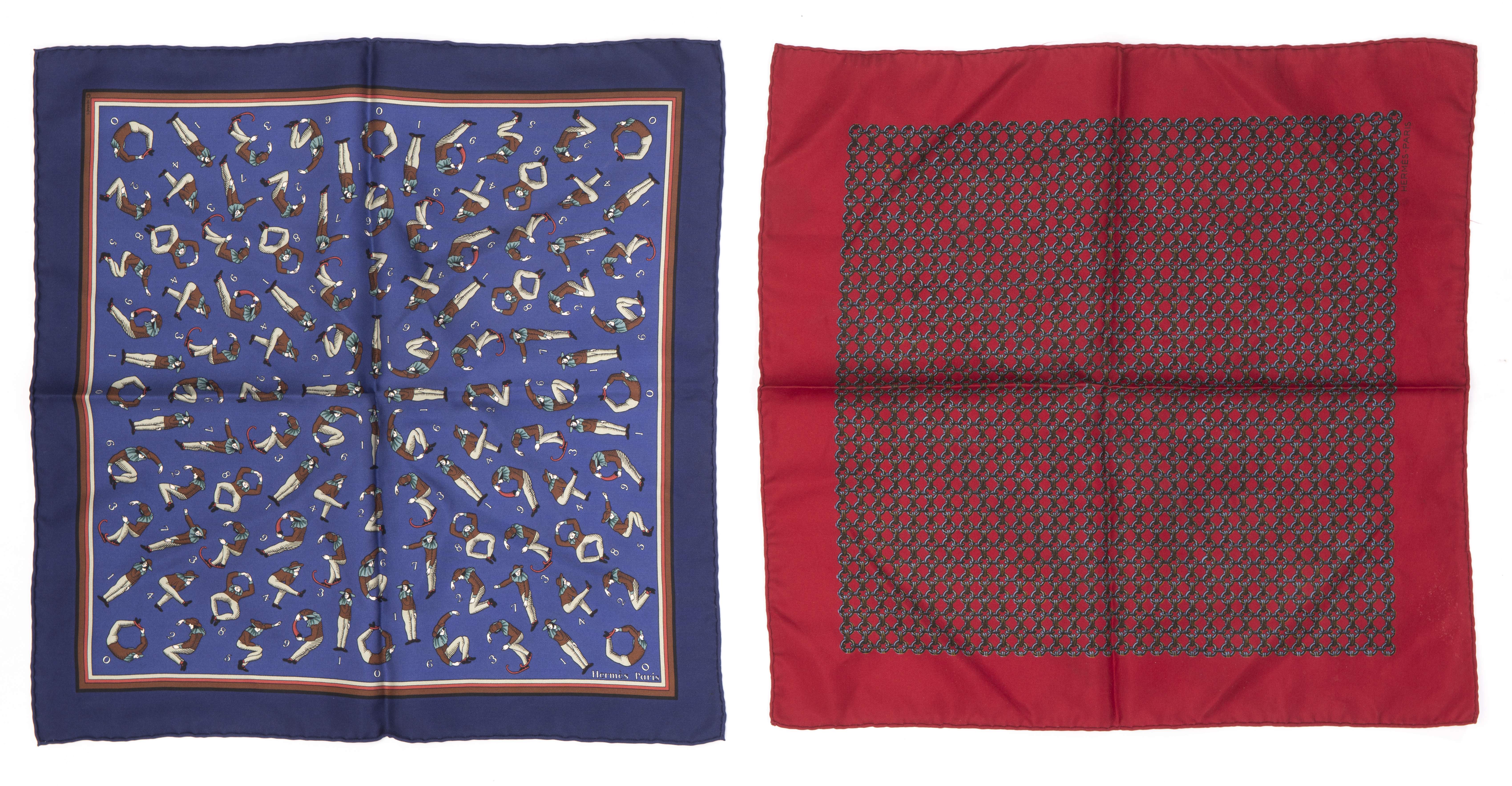 Lot de deux pochettes homme carrées en soie Hermès Paris, un sur fond bordeaux à décor mailles, l'autre personnages imitant des chiffres sur fond bleu.