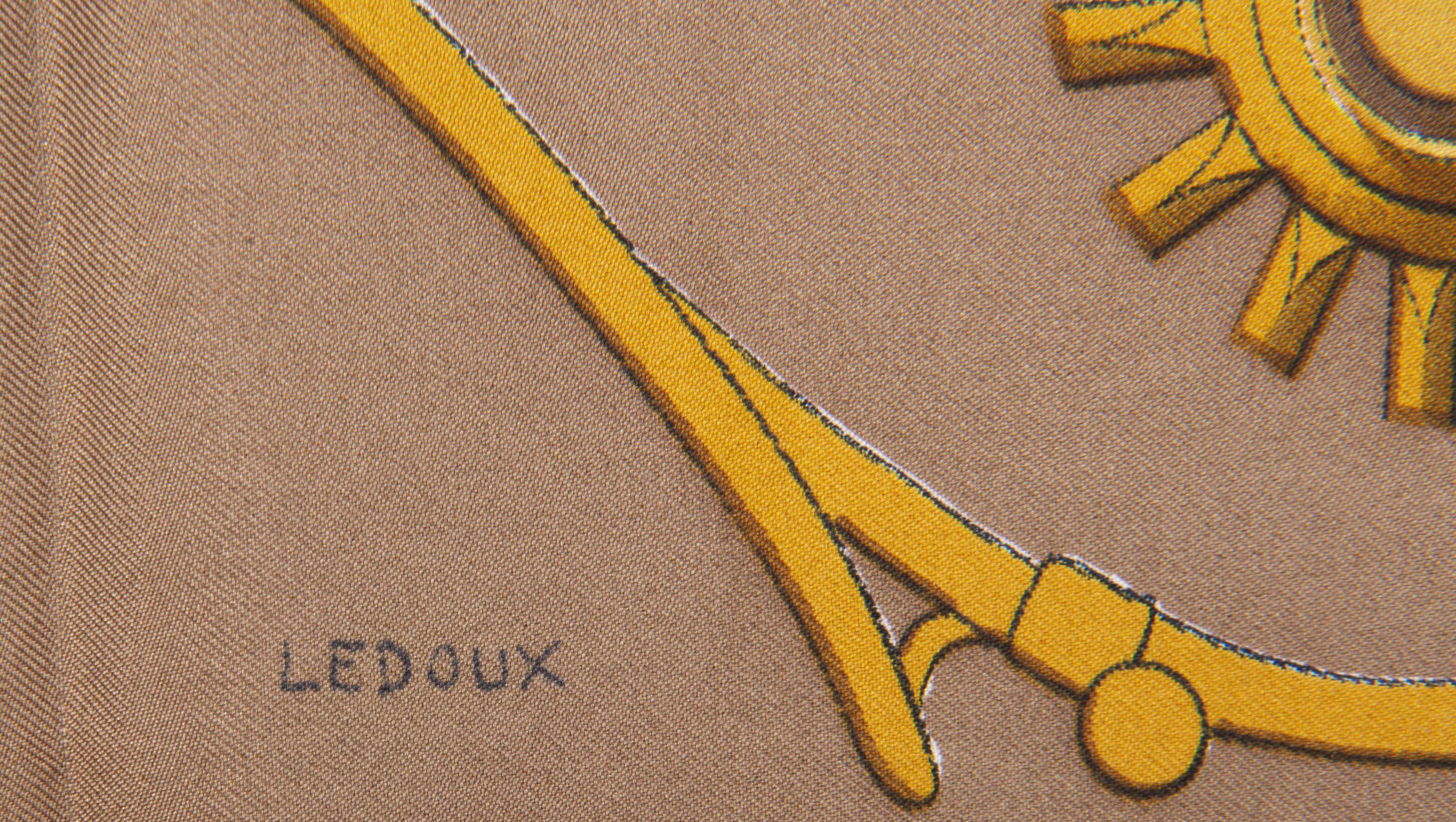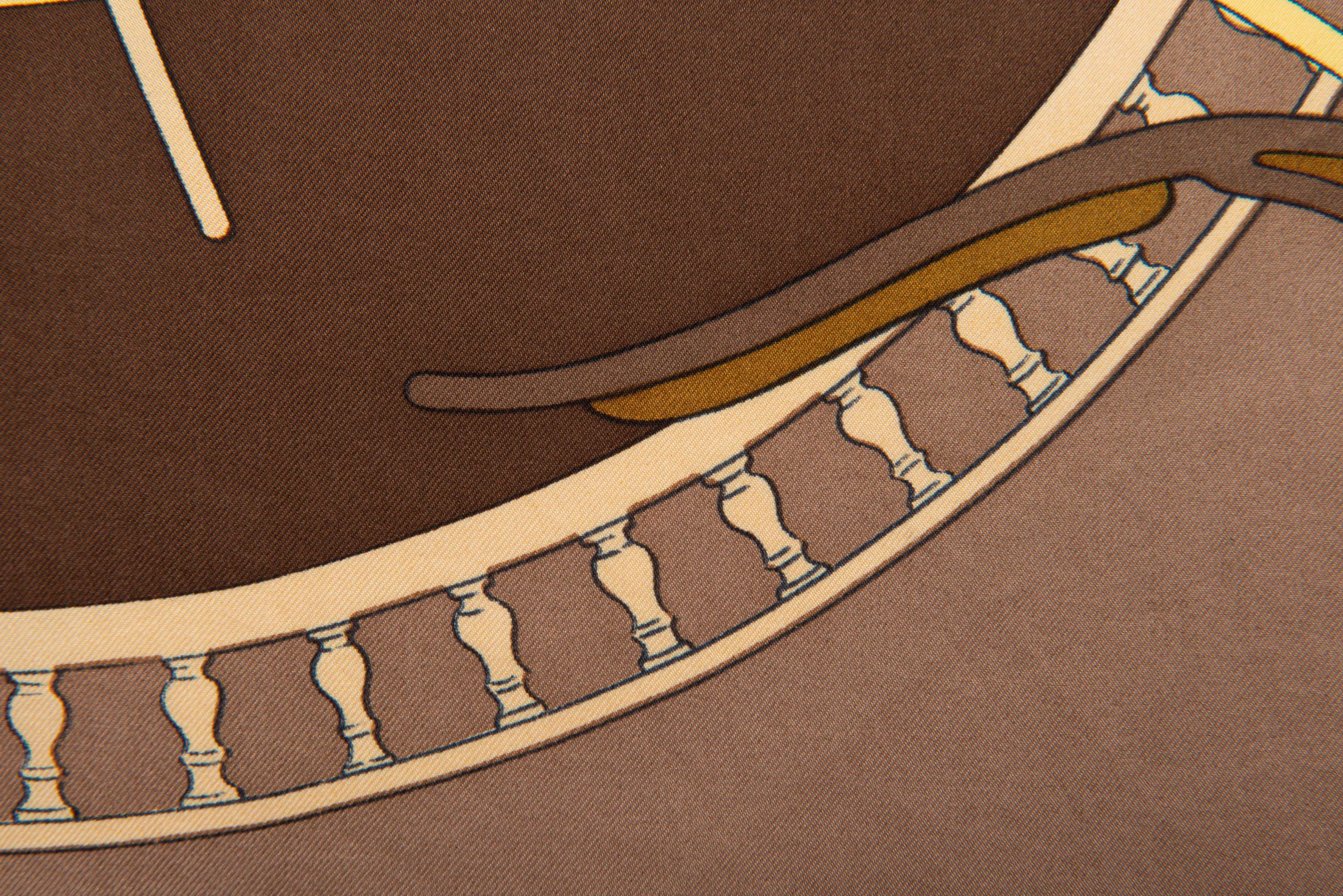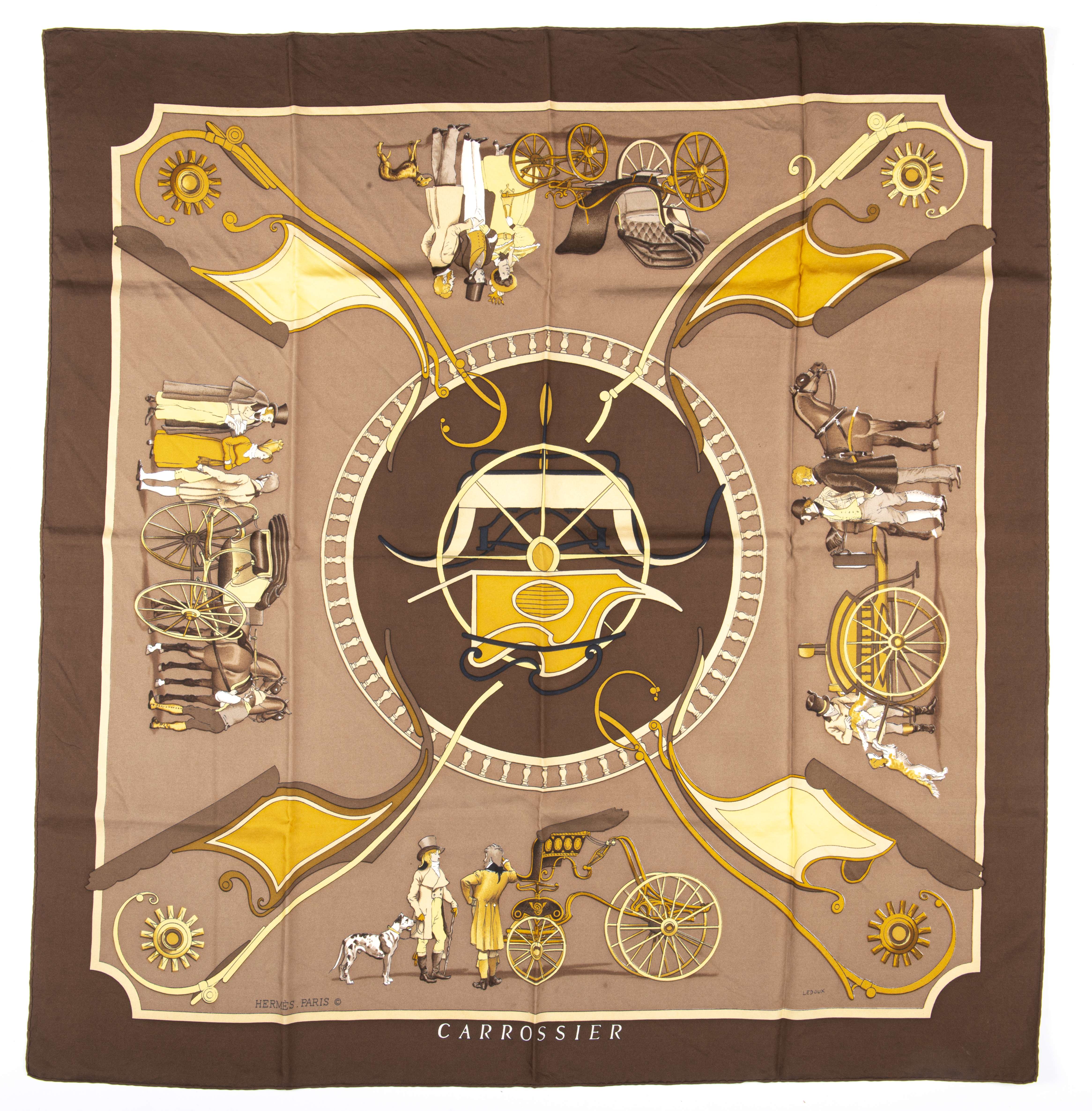 HERMÈS Paris, carré en soie "Carrossier" en brun et or par Philippe Ledoux des années 70 (rare).