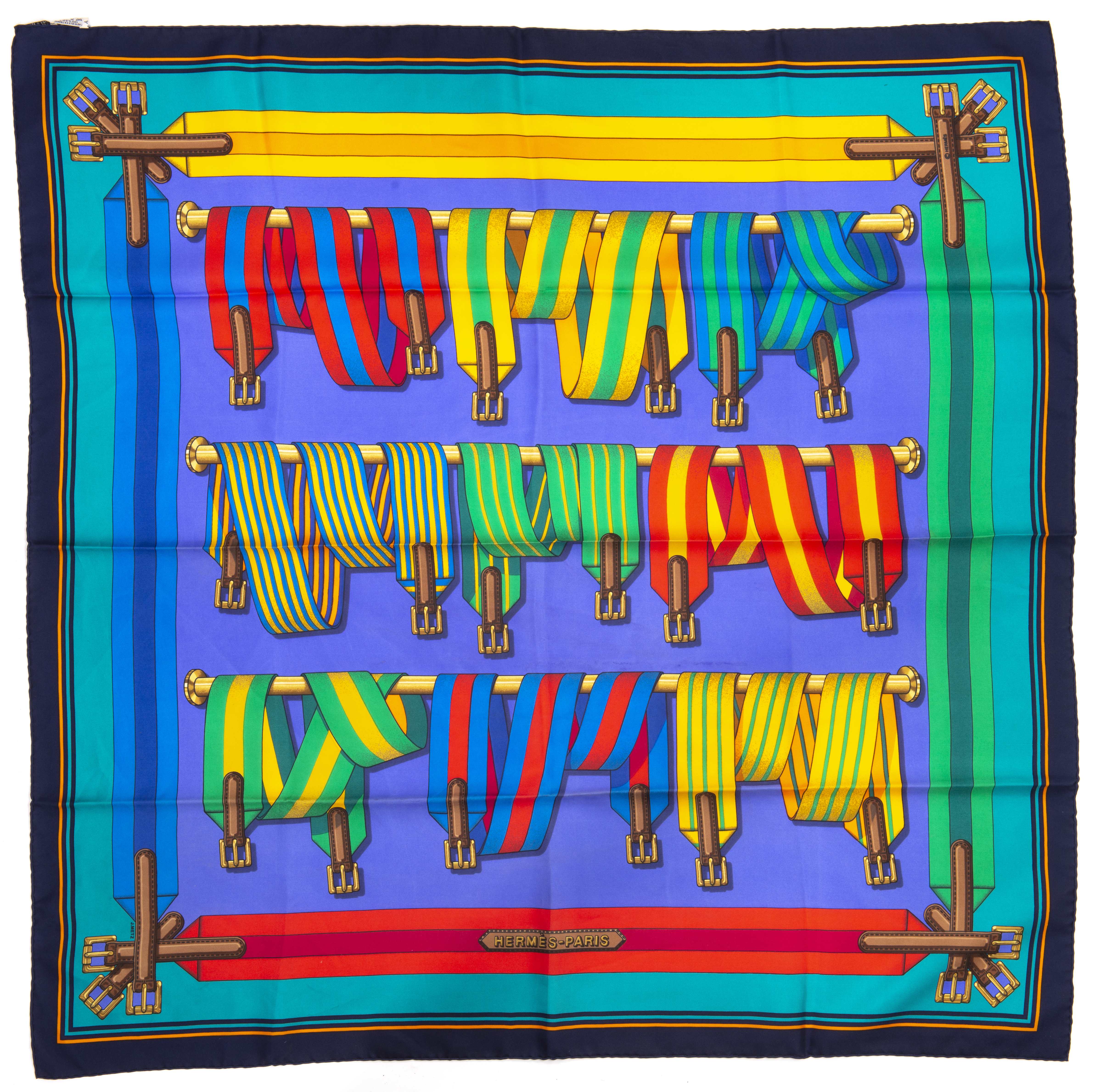 Hermès Paris, carré en soie "Sangles" par Joachim Metz, première édition datant de 1985.