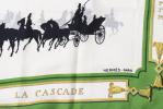 HERMÈS Paris, carré en twill de soie imprimé, modèle "Le Bois de Boulogne" dessiné par Hugo Grygkar en 1957, édition des années 80, frise en vert sur fon blanc à décor de cavaliers et cygnes.