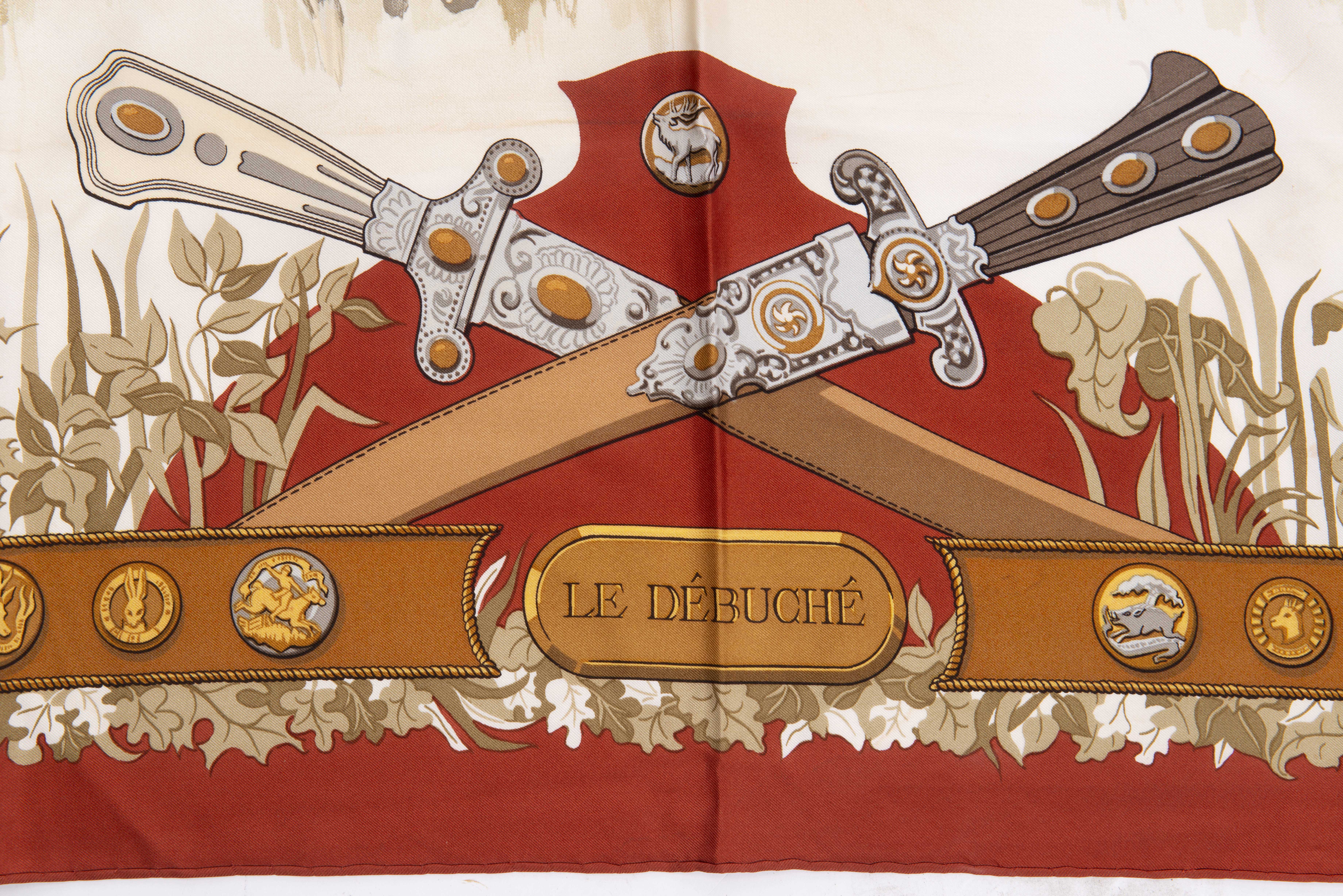 Hermès Paris, carré en twill de soie "Le Débuché" par Ch. Hano à bordure rouge brique.