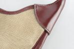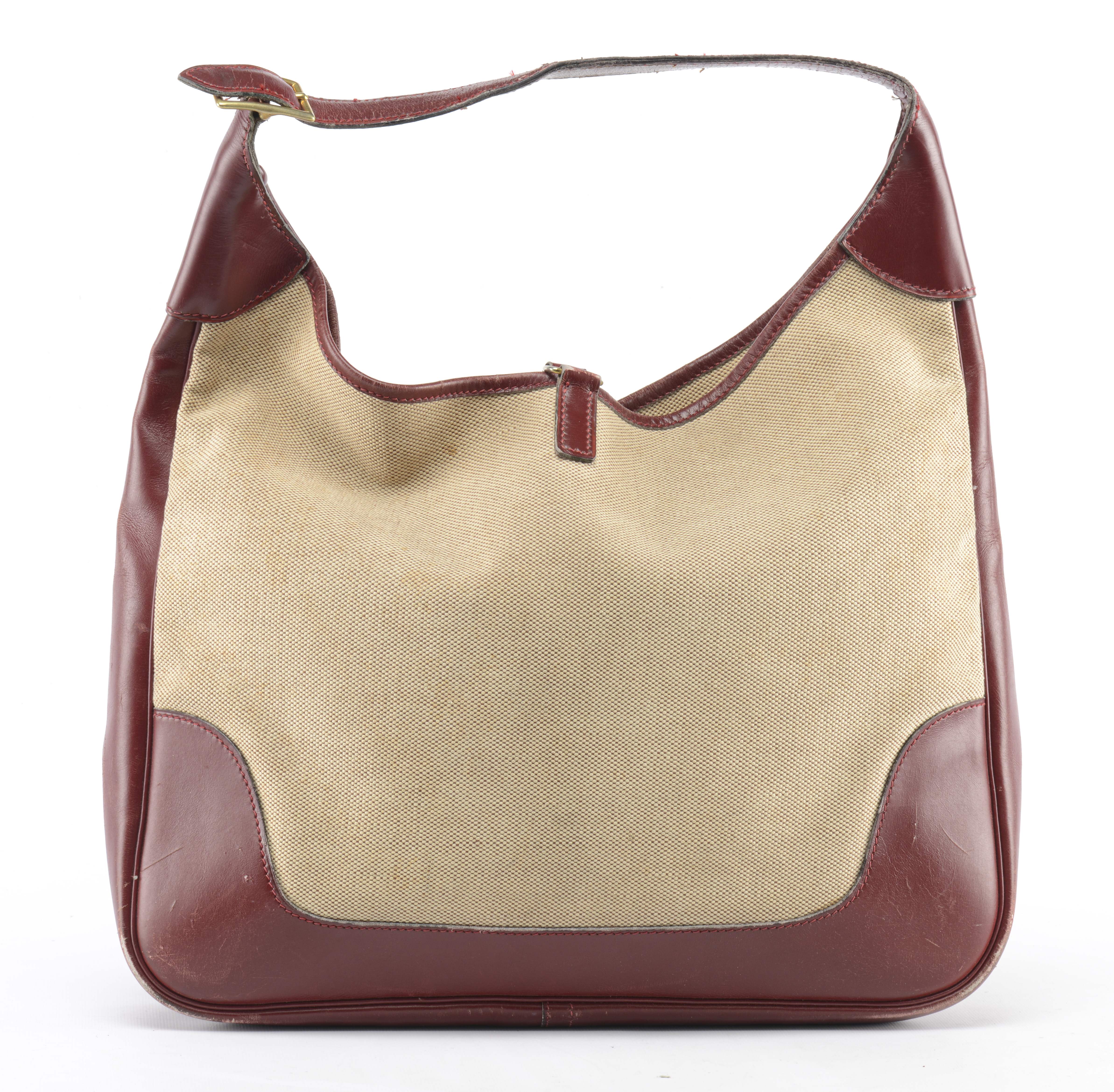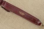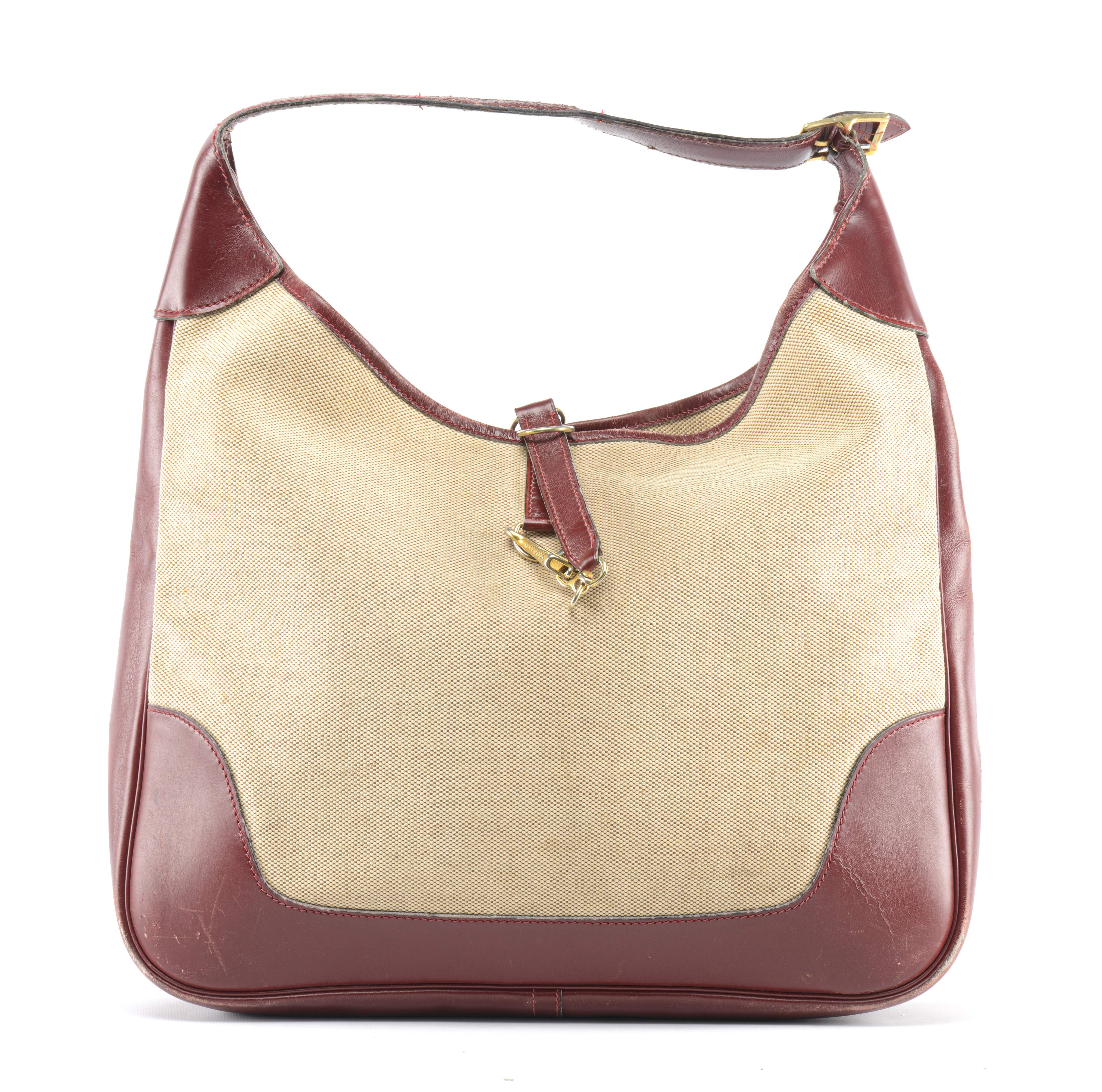 HERMÈS Paris, sac "Trim" en toile beige et cuir bordeau, garniture en métal doré, fermoir mousqueton, demi-anse bandoulière.