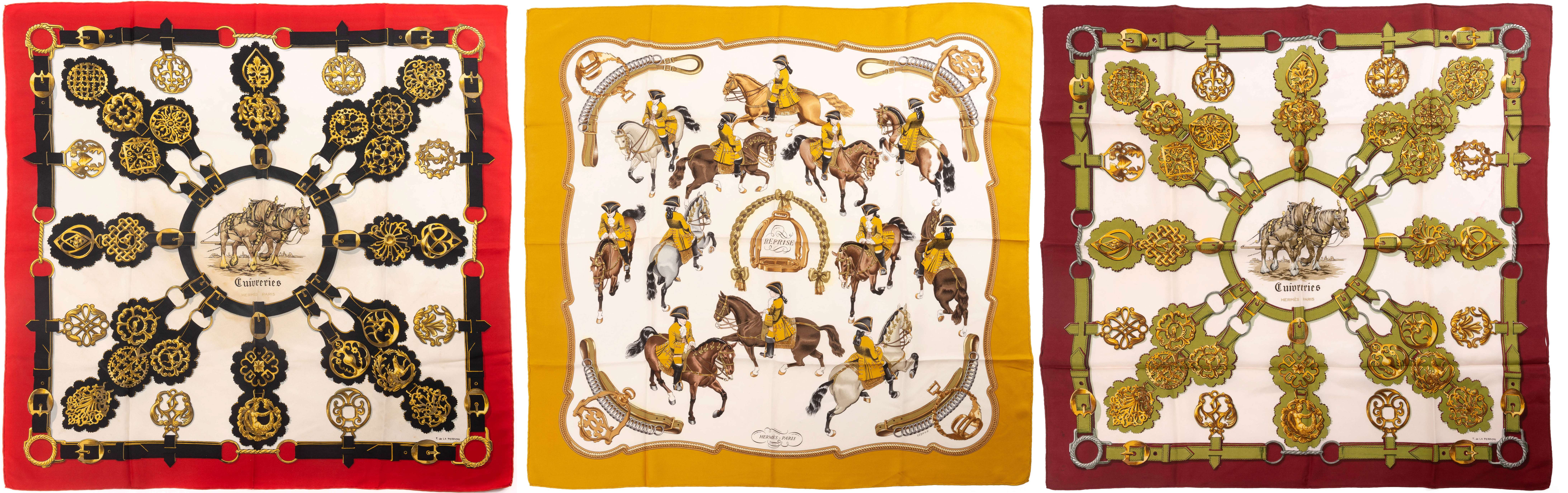 Hermès Paris, trois carrés en twill de soie "Cuivreries" & "Reprise"