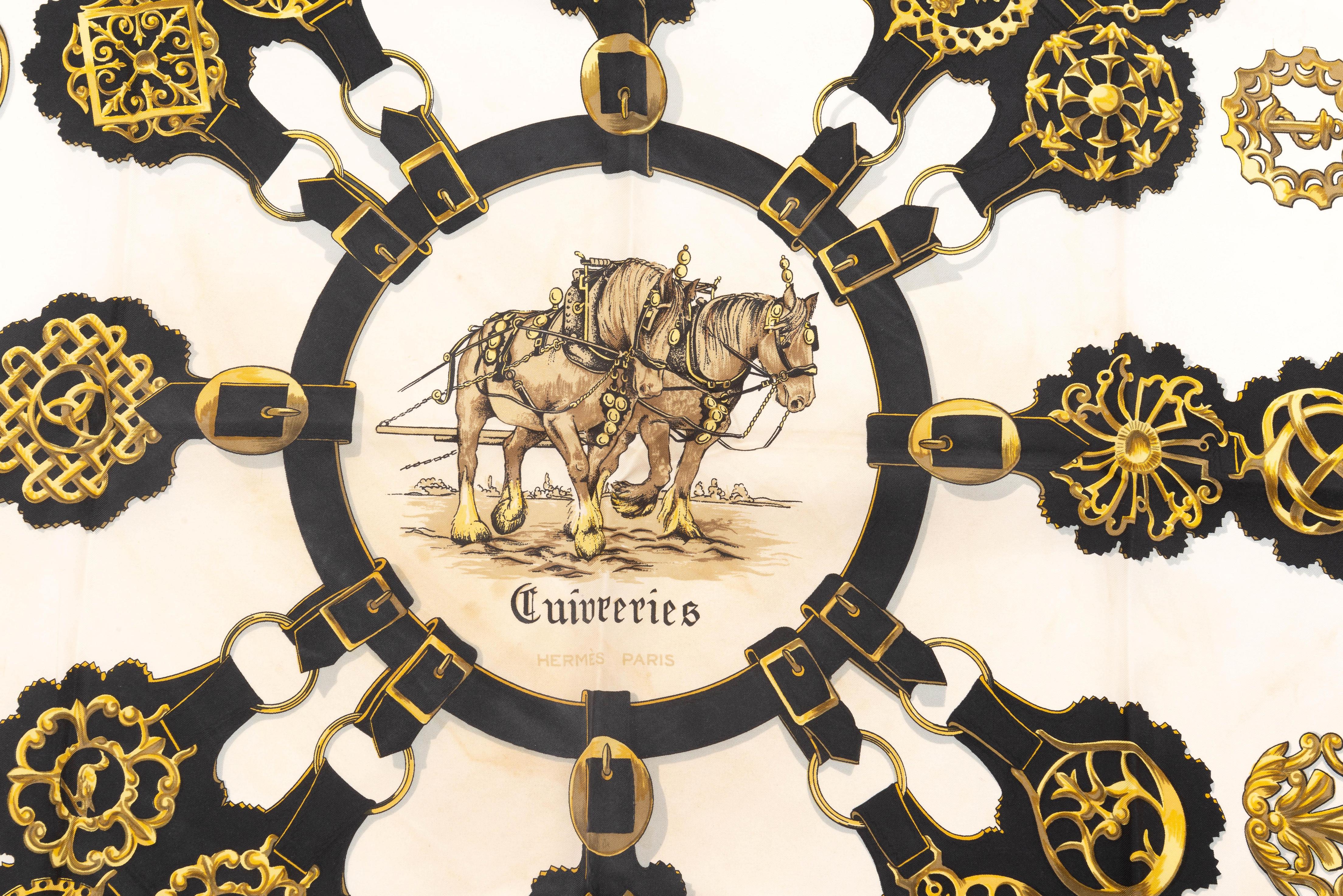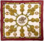 Hermès Paris, carré en twill de soie "Cuivreries" par Françoise de la Perrière à bordure bordeaux
