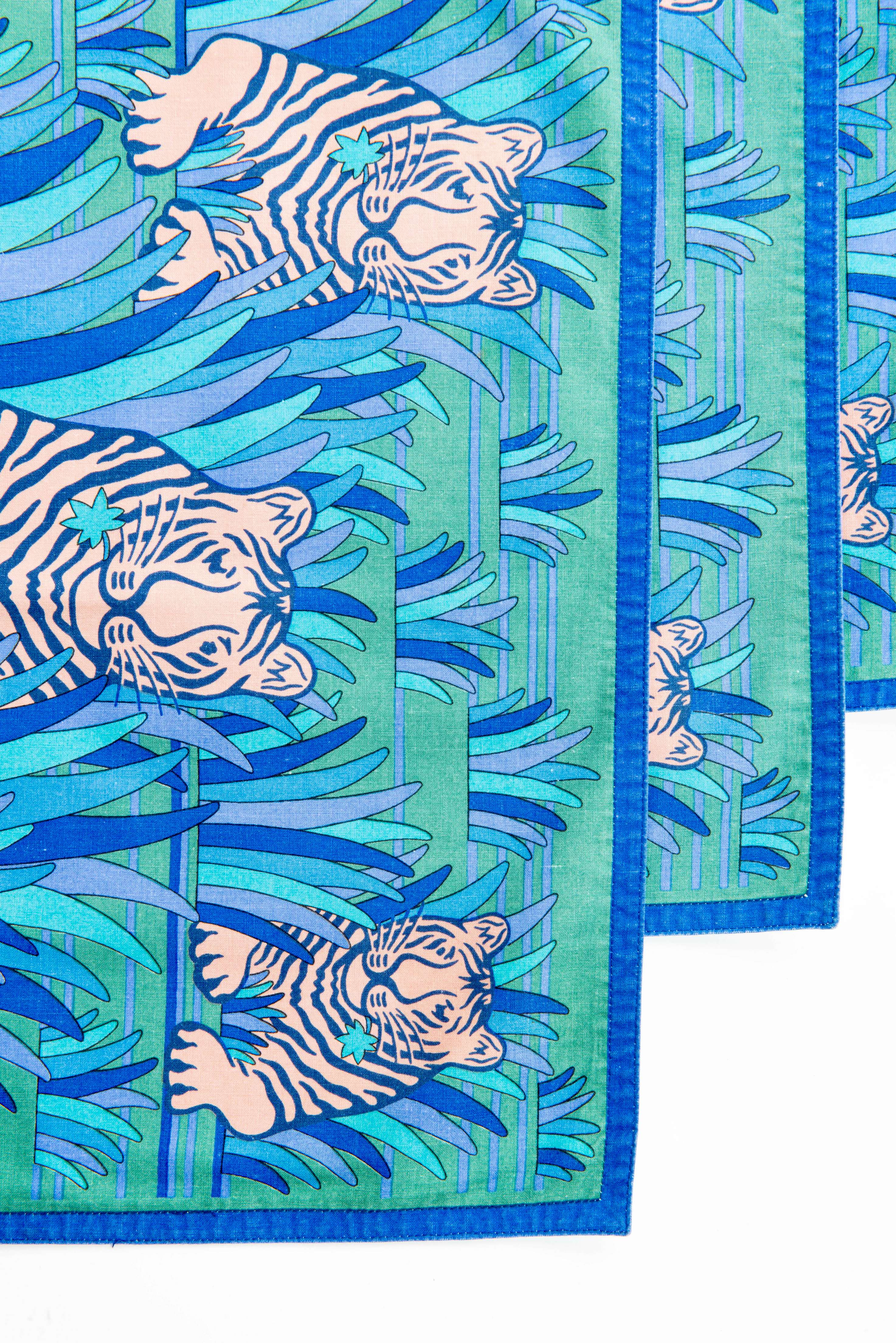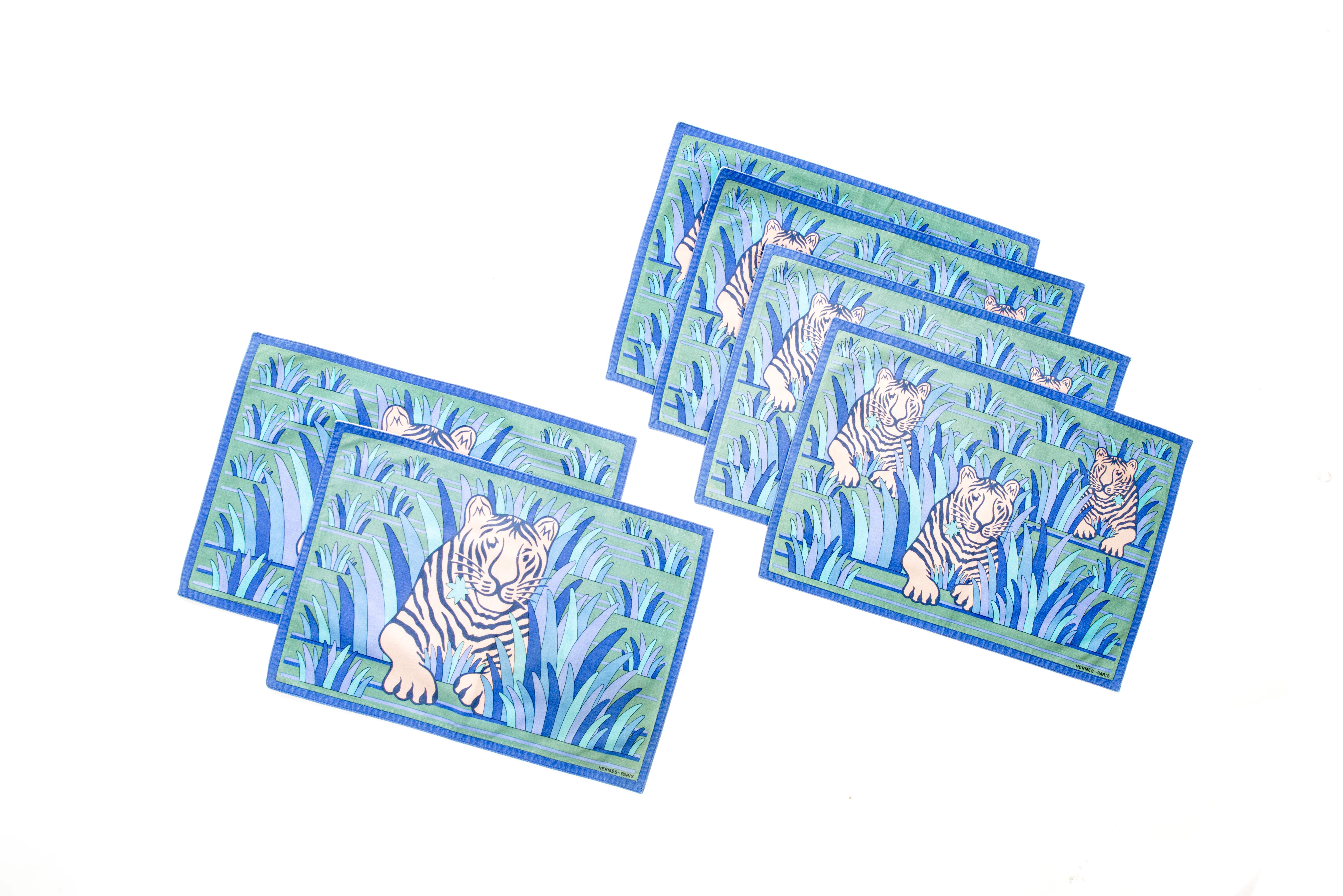 Hermès, 6 sets de table et 6 serviettes au décor de tigre dans la forêt.