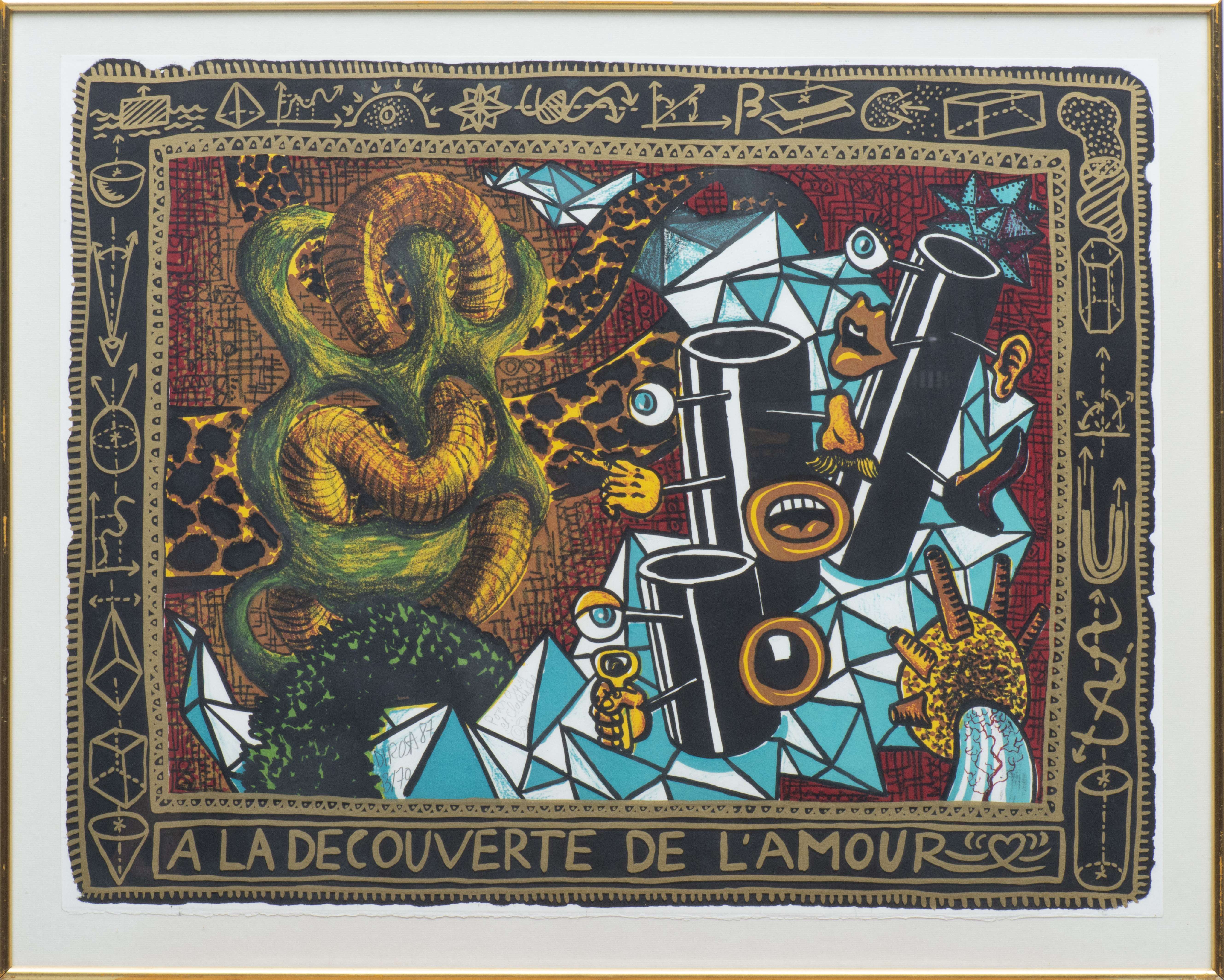 Hervé DI ROSA (1959), "A la découverte de l’Amour", Lithographie, numéroté 13/70 signé en bas à gauche Di Rosa et daté 1987. Porte une dédicace de mariage dans un triangle à droite de la signature (Pour Guy et Claudine).