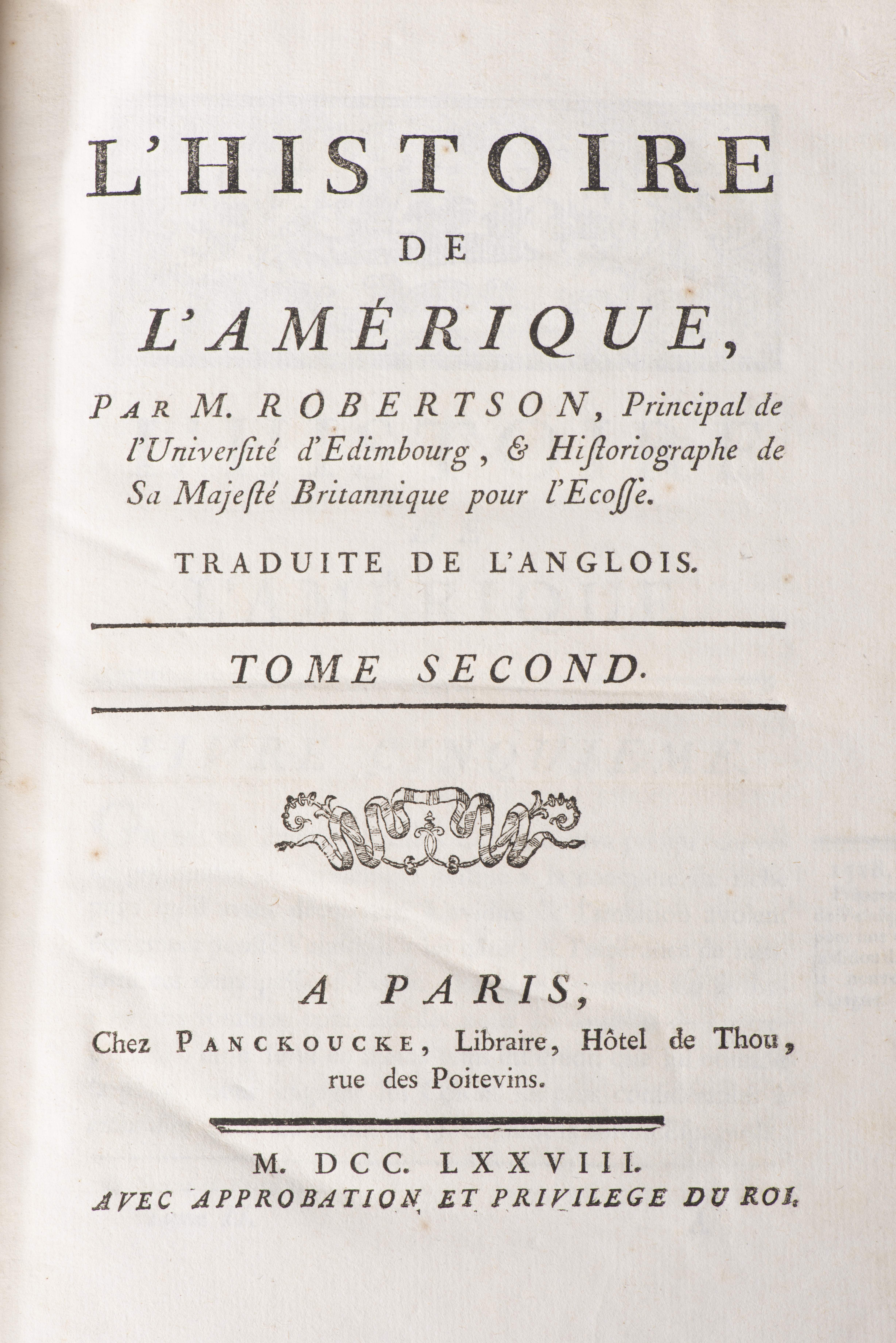 "Histoire de l'Amérique" par M. Roberston* (en 2 tomes), à Paris chez Panckoucke libraire Hôtel de Thou, rue des Poitevins, 1778 avec approbation et privilège du Roy.
