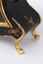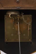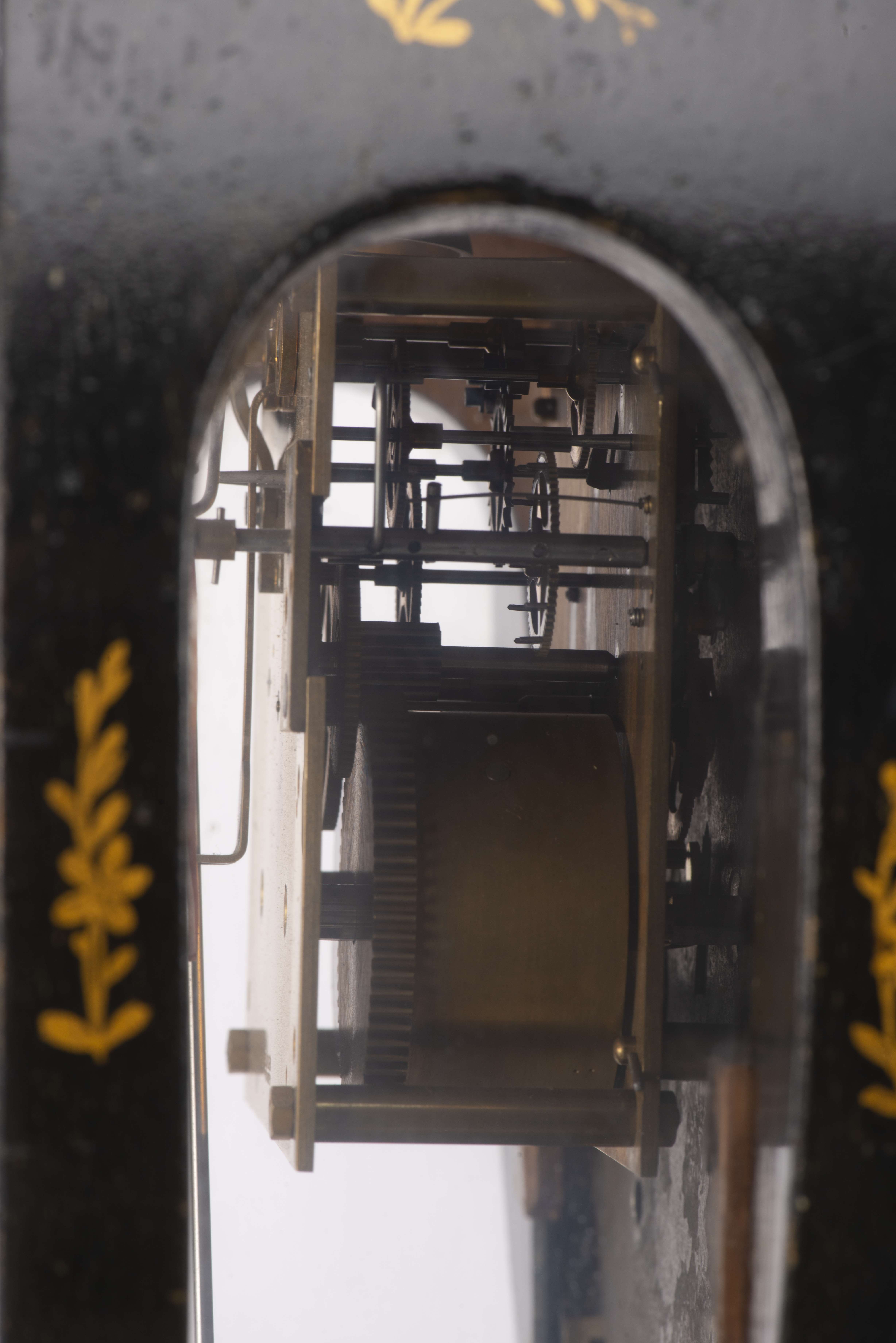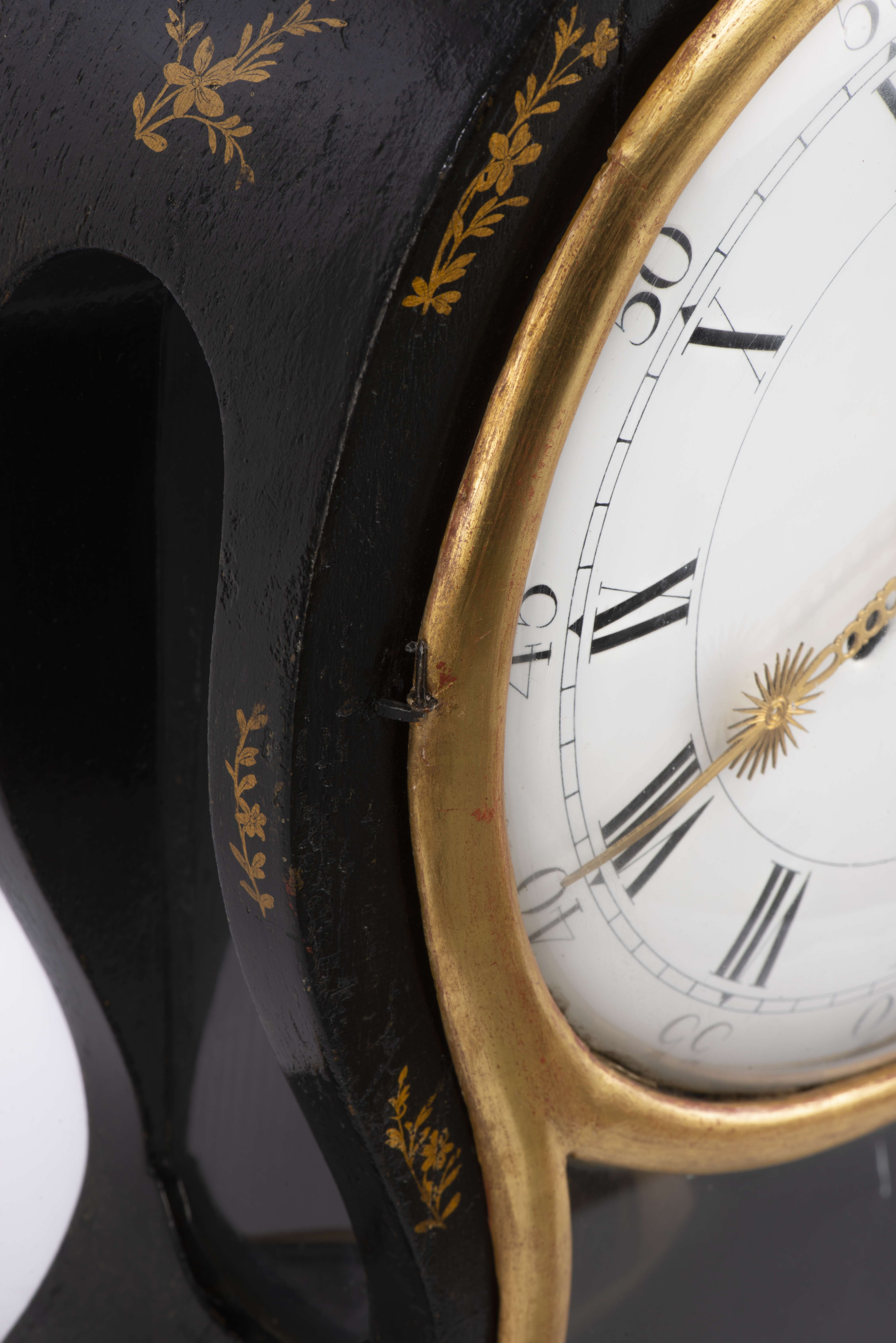 Horloge neuchâteloise avec cadran en émail à cuvette et aiguilles soleil pour les minutes et les heures, boîte re-laquée noire avec décalcomanies de fleurettes à l'or, datée à l'intérieur 1er janvier 1833. Mouvement signé au dos O. Holger Furtwangen, mouvement changé ultérieurement.