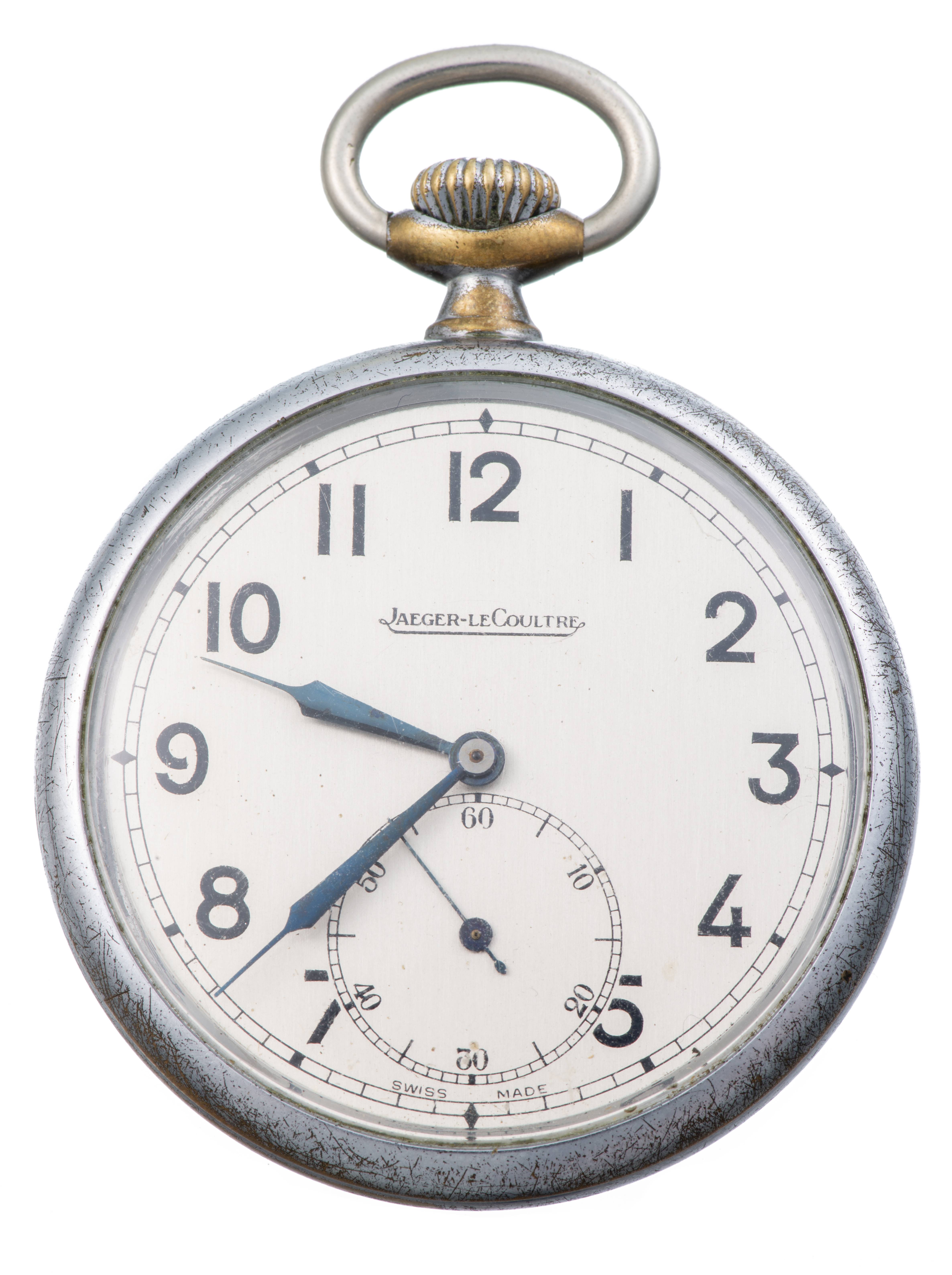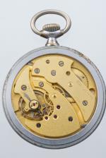 JAEGER LECOULTRE, version civile d'une montre de poche militaire commandée pour l'armée anglaise dans les années 1940 en acier. Mvt mécanique de la seconde guerre mondiale doré signé Jaeger-LeCoultre n°467/2, cadran argenté avec petite aiguille des secondes à 6h, boîte en métal nickelé. version civile n° 144433.