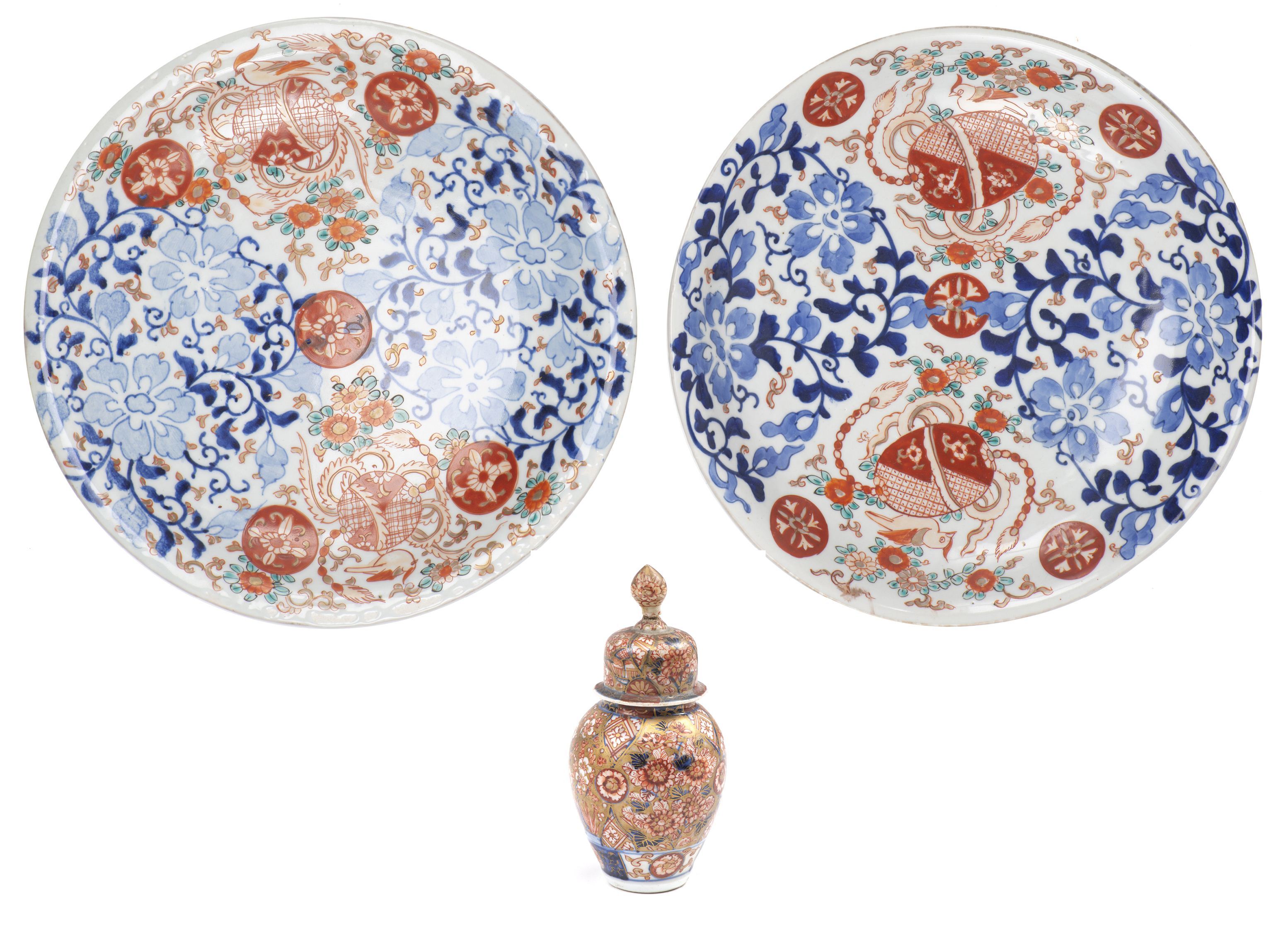 JAPON, décor Imari, deux plats Imari famille verte & petit vase à couvercle à décor Imari