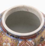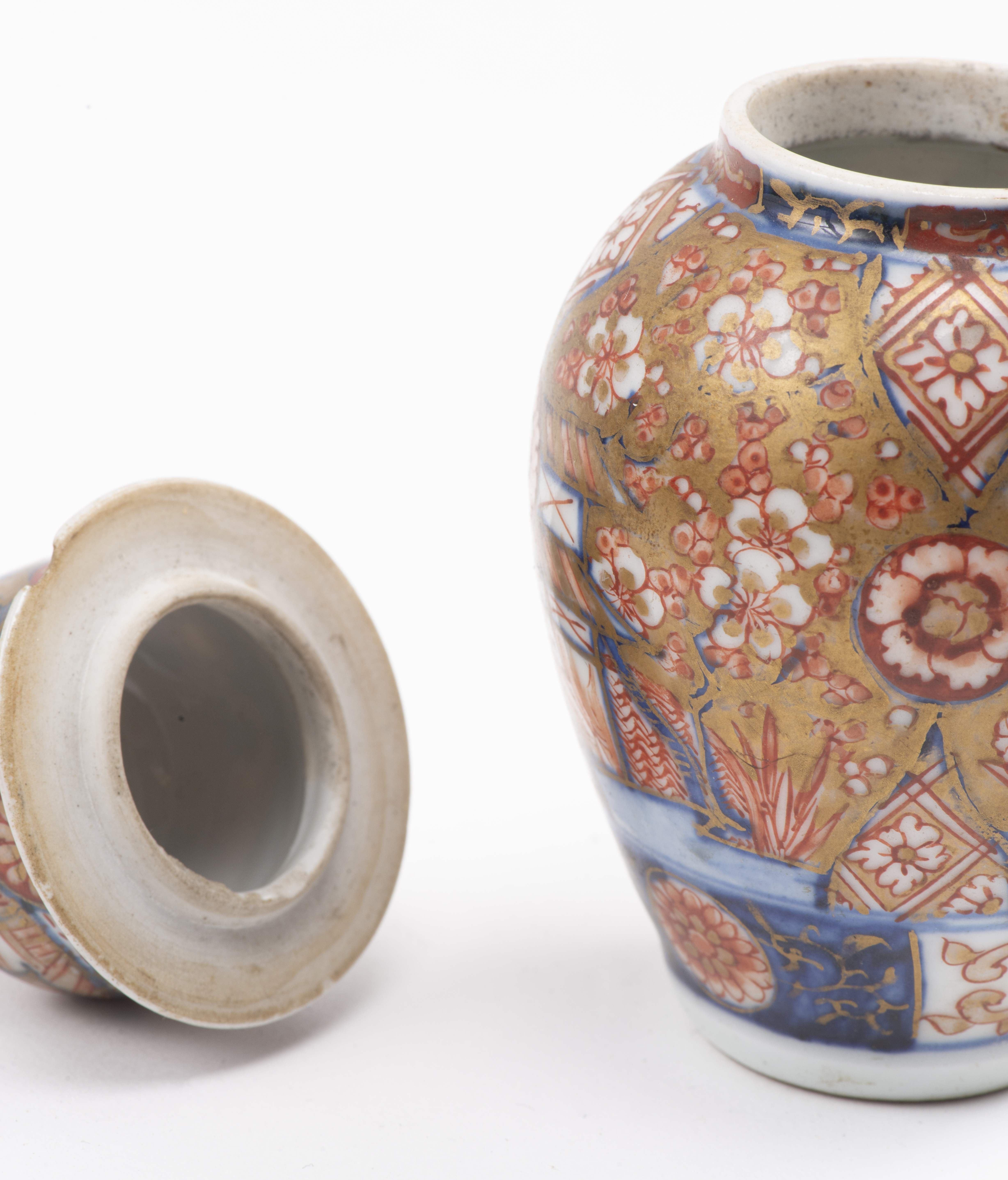 - un petit vase à couvercle en porcelaine du Japon à décor Imari à médaillons de fleurs et paysages architecturaux lacustres