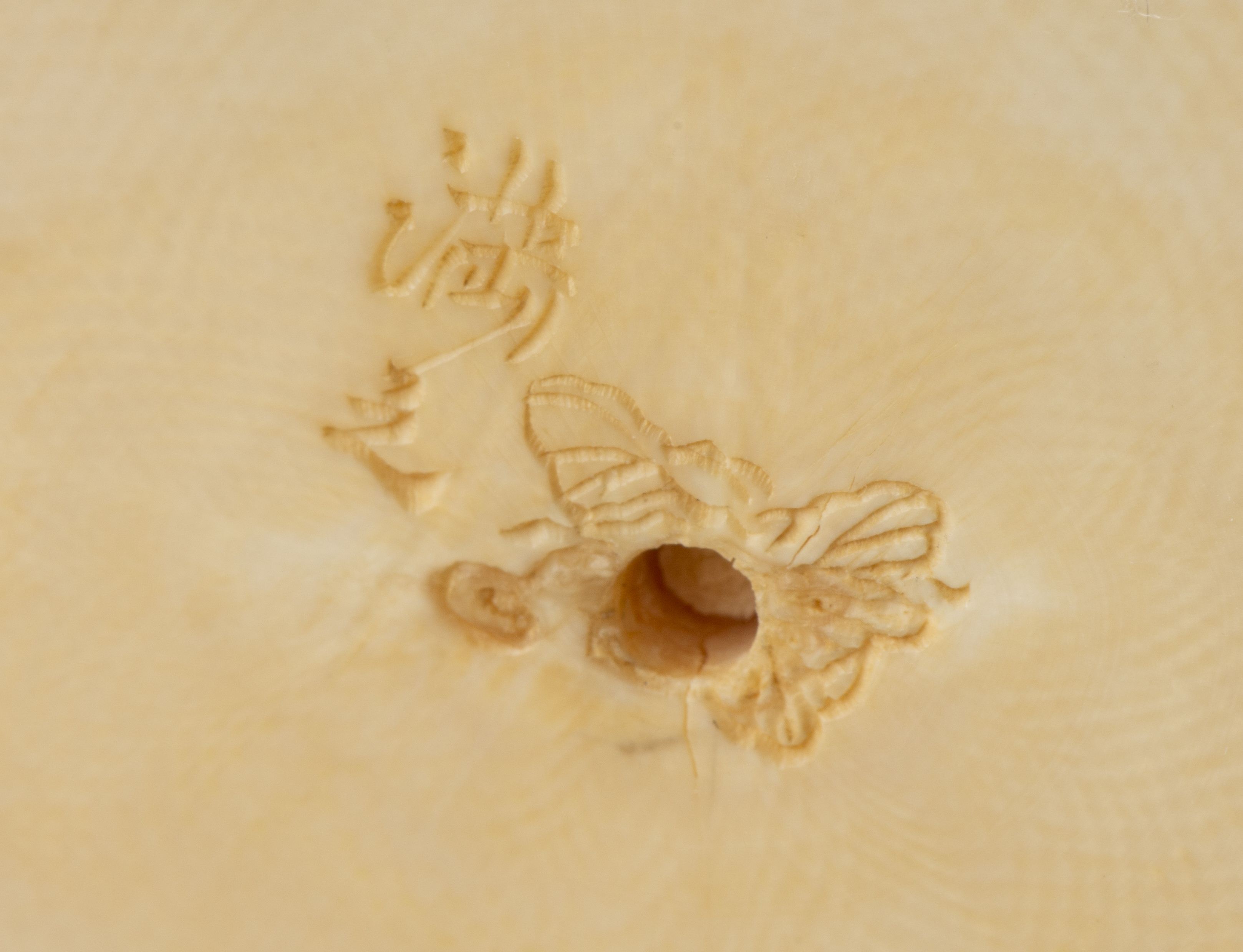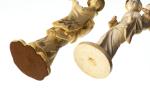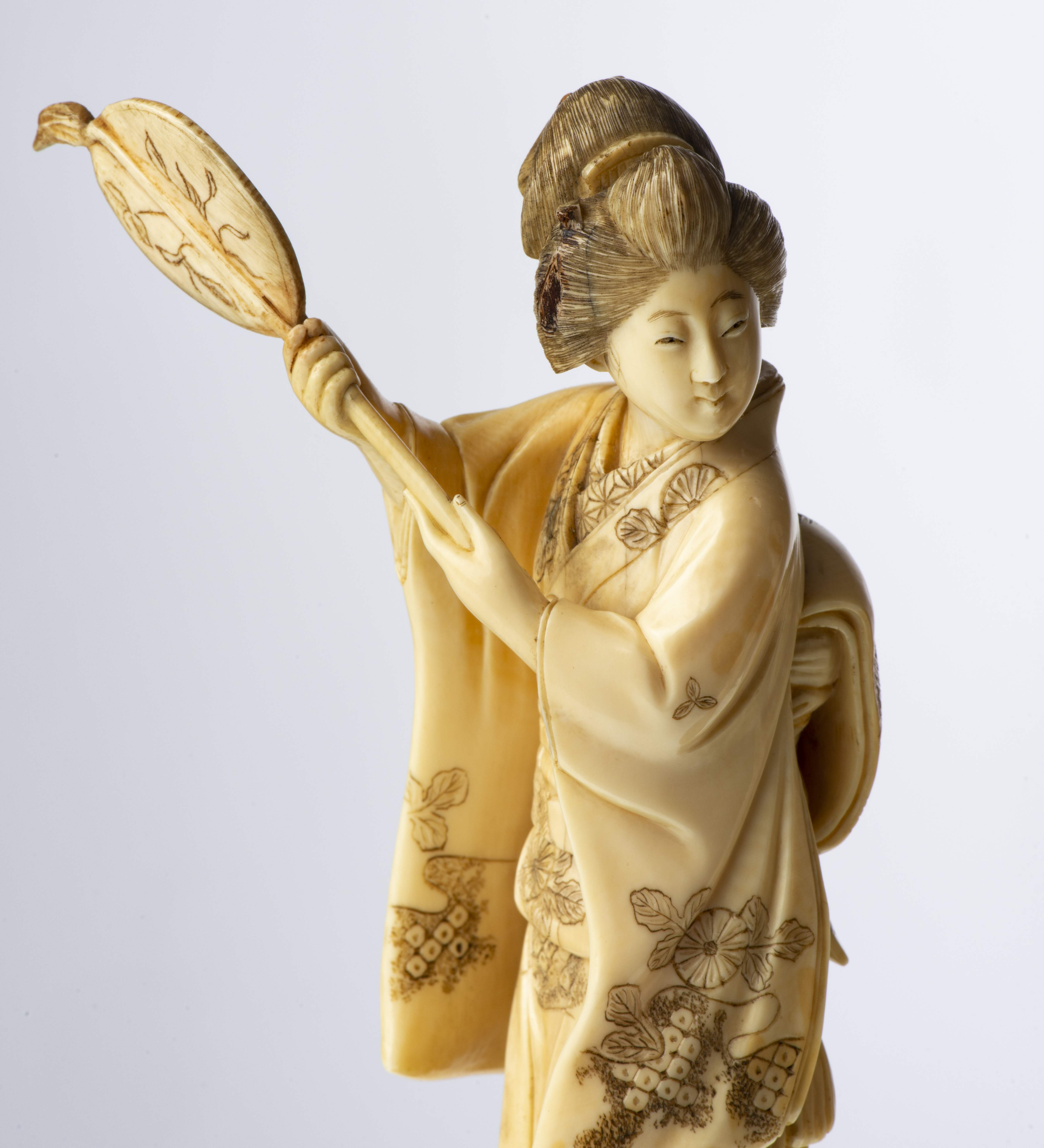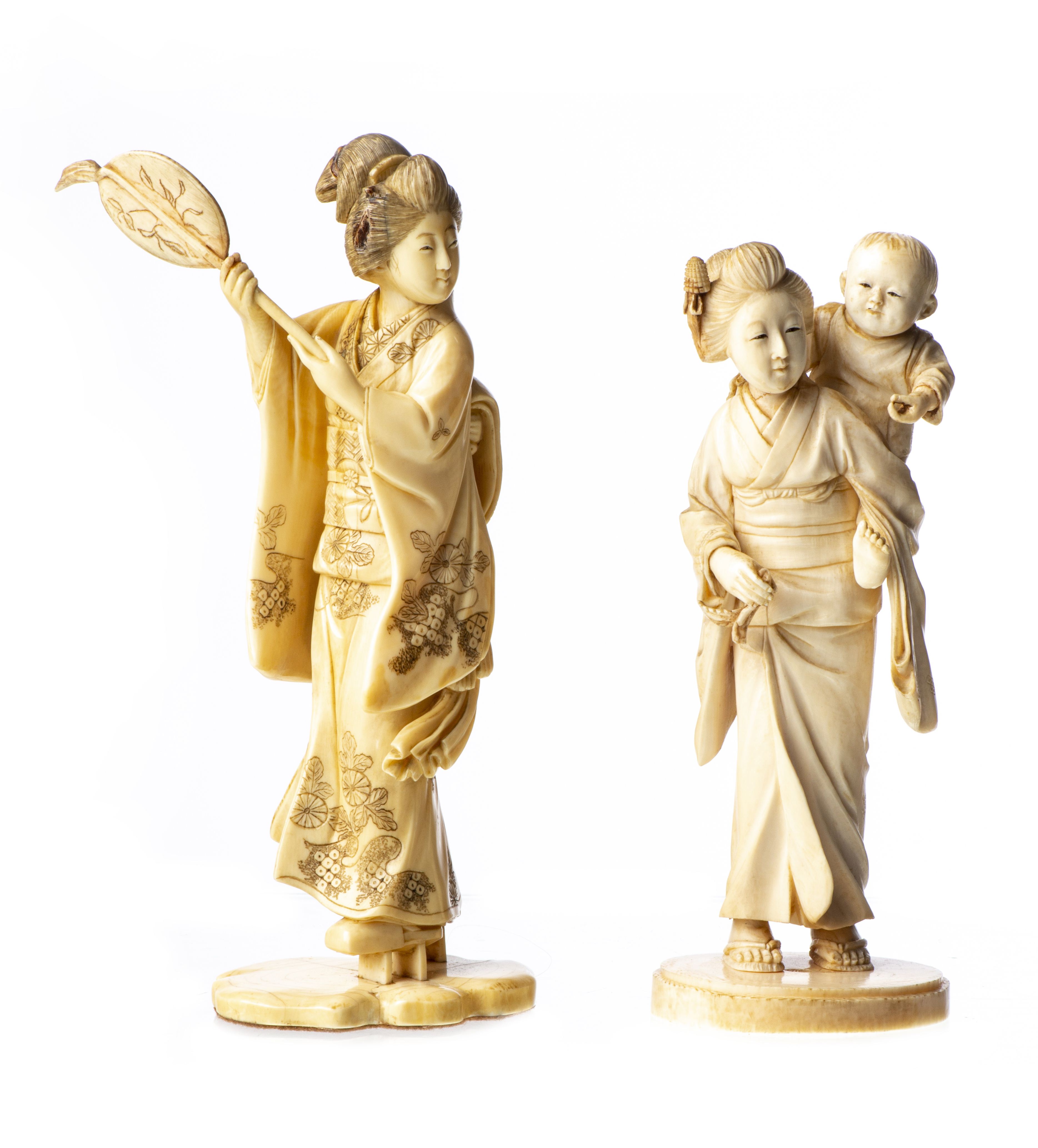 JAPON, deux okimomo en ivoire représentant chacun une jeune femme, l'une manchant et tenant un éventail de ses deux mains, l'autre, avec son enfant dans le dos, tenant de sa main droite une tige de plante (manque la fleur).
