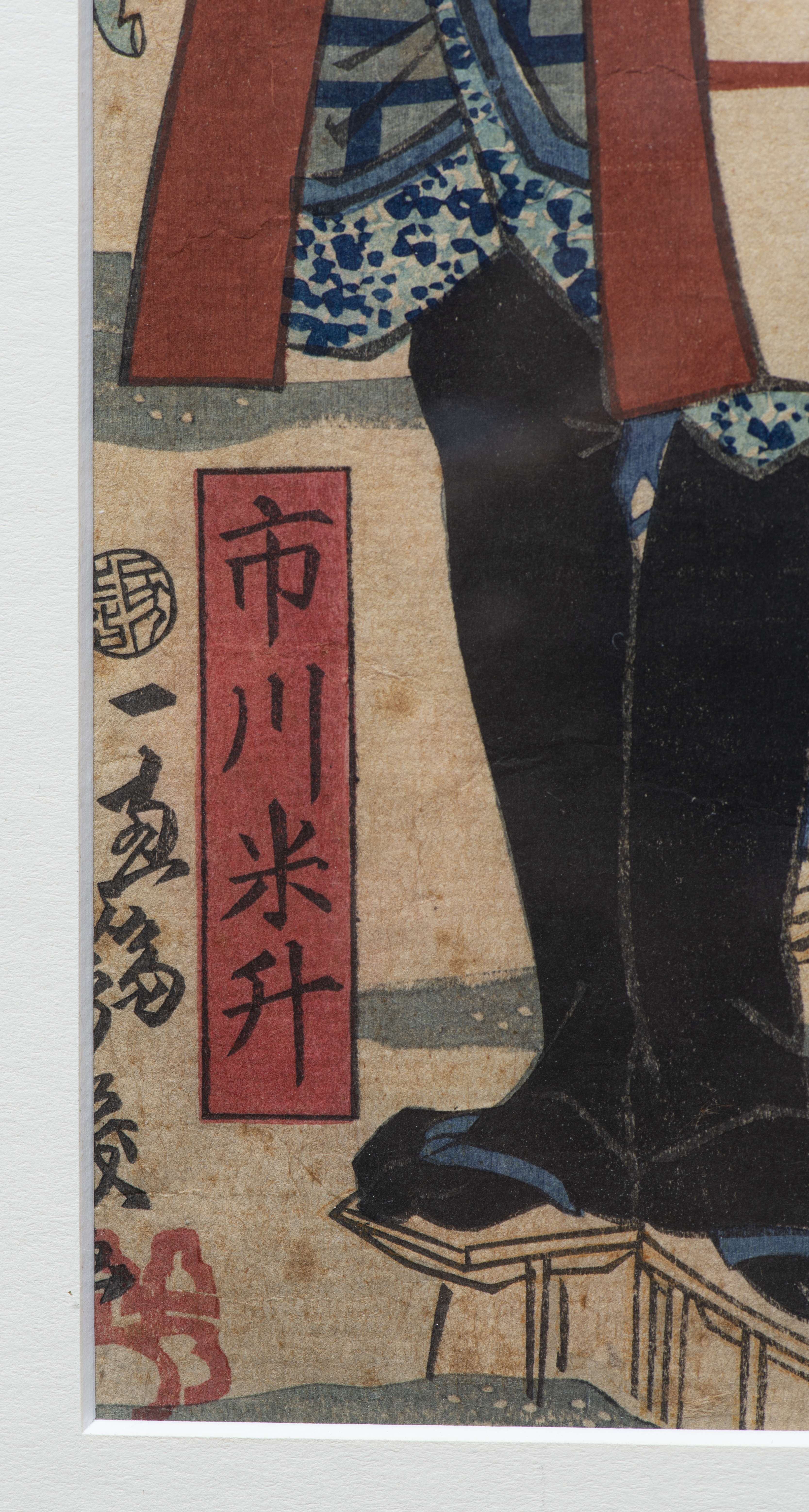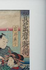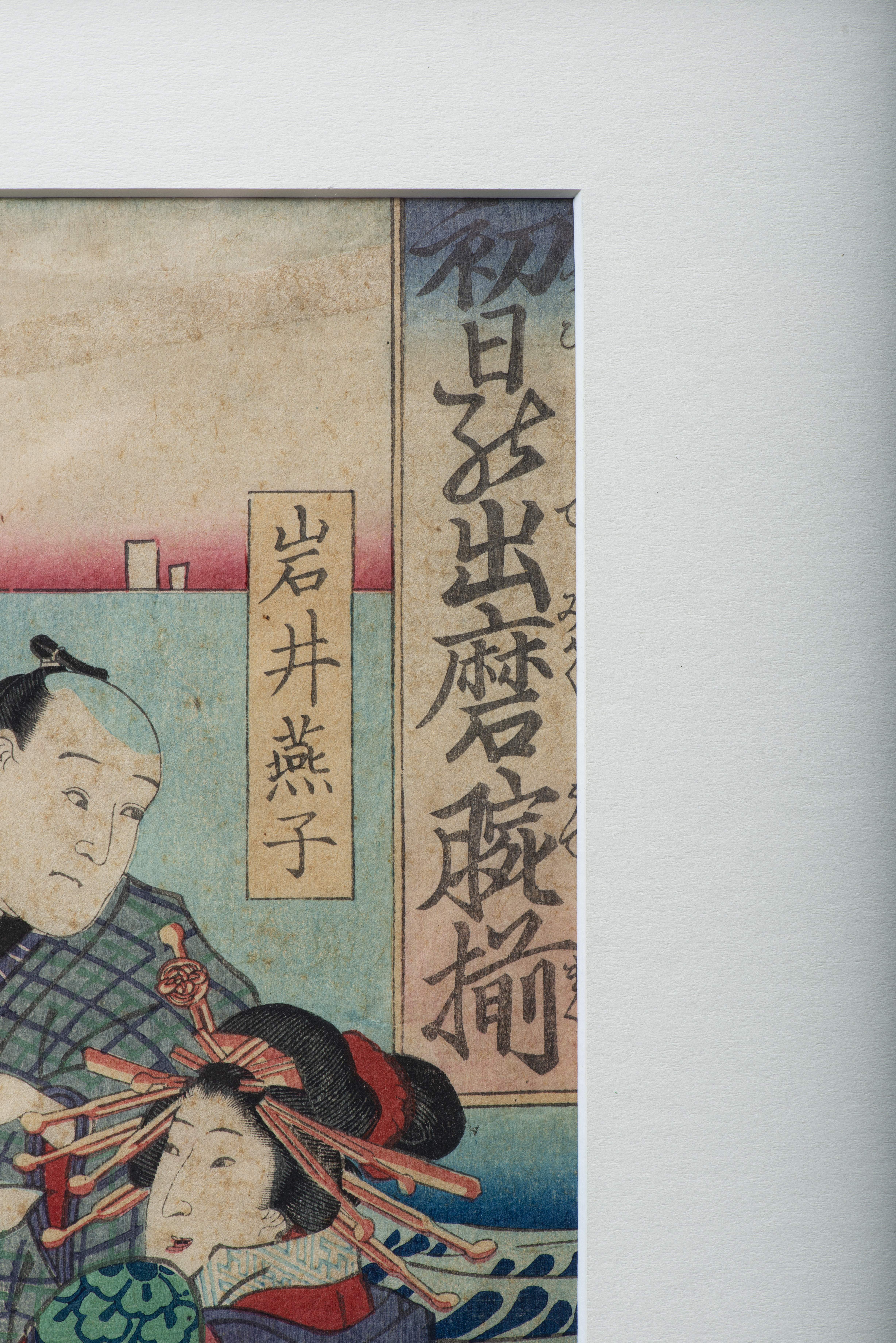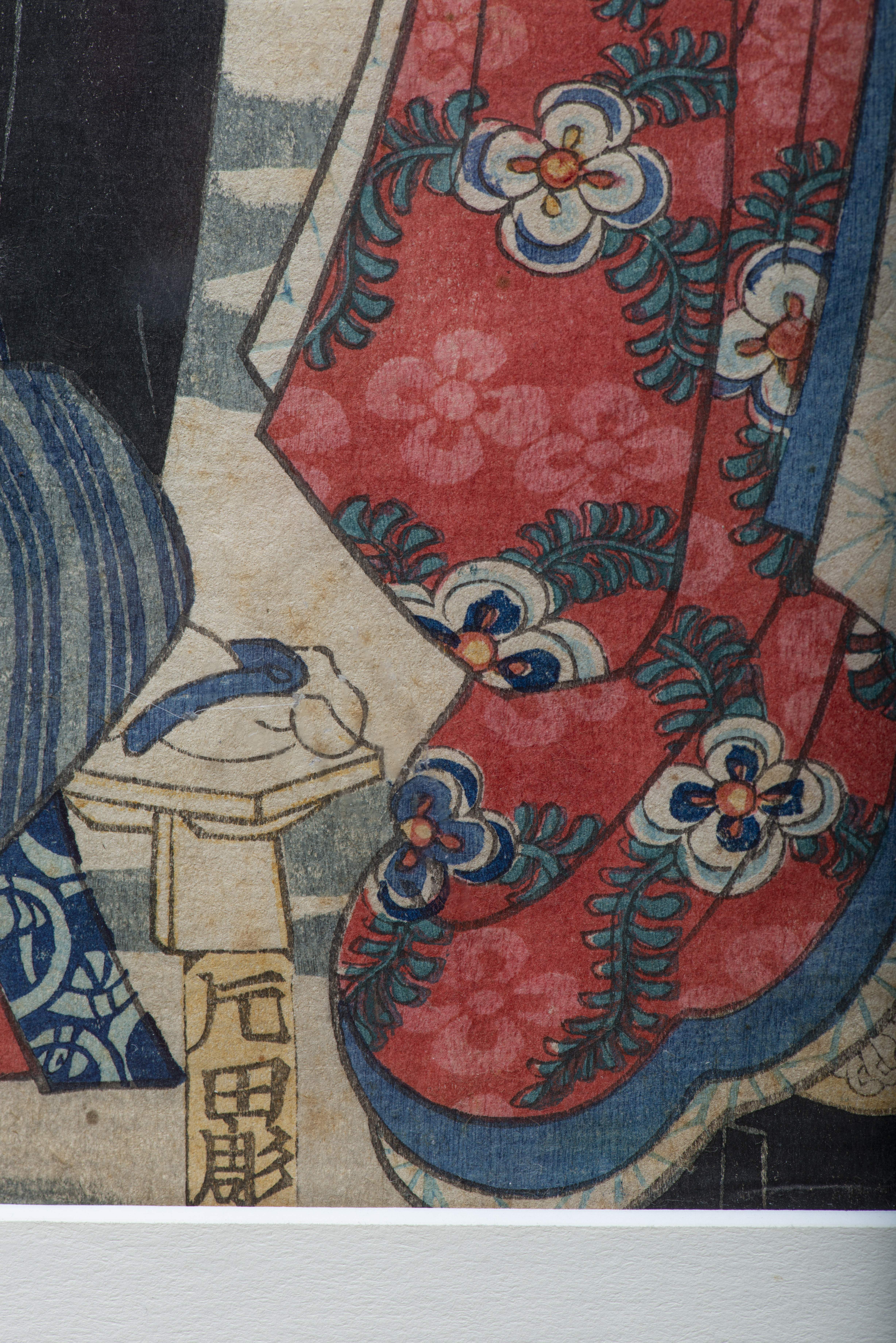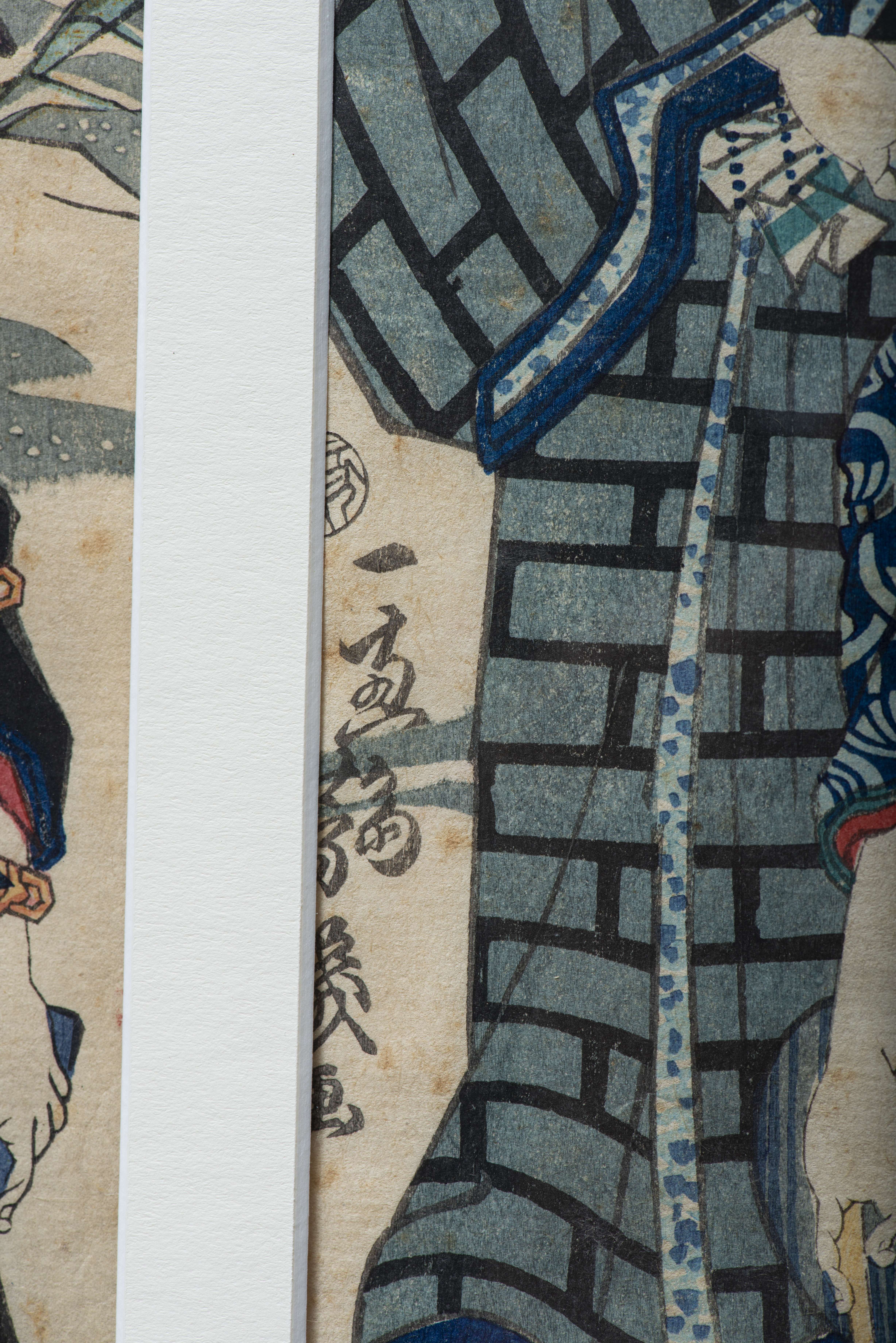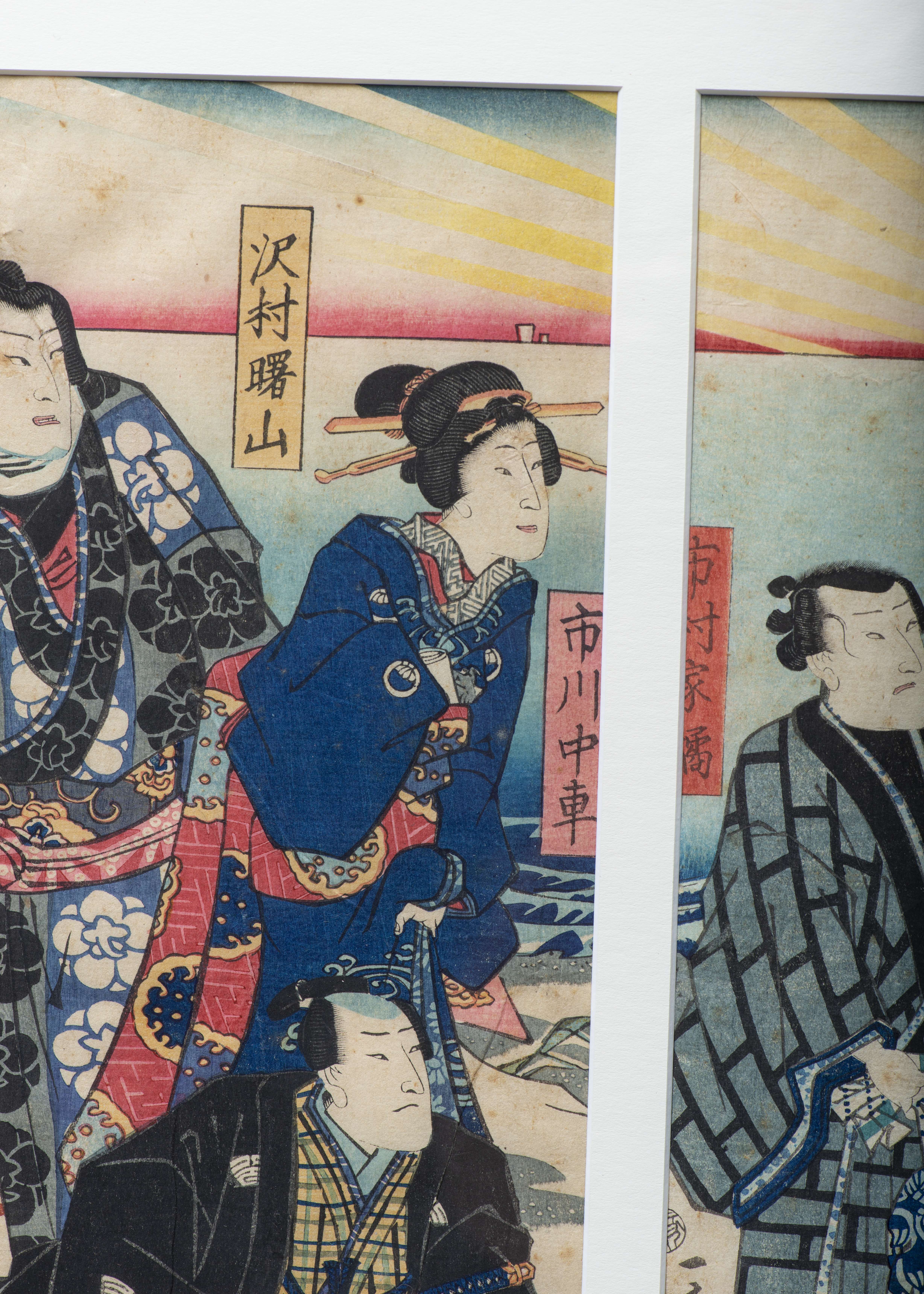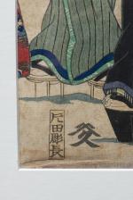 JAPON, Estampe japonaise en triptyque "Discussion dans un parc à la pointe du jour" estampe en culeurs avec cachet de censure de 1790 à 1842.