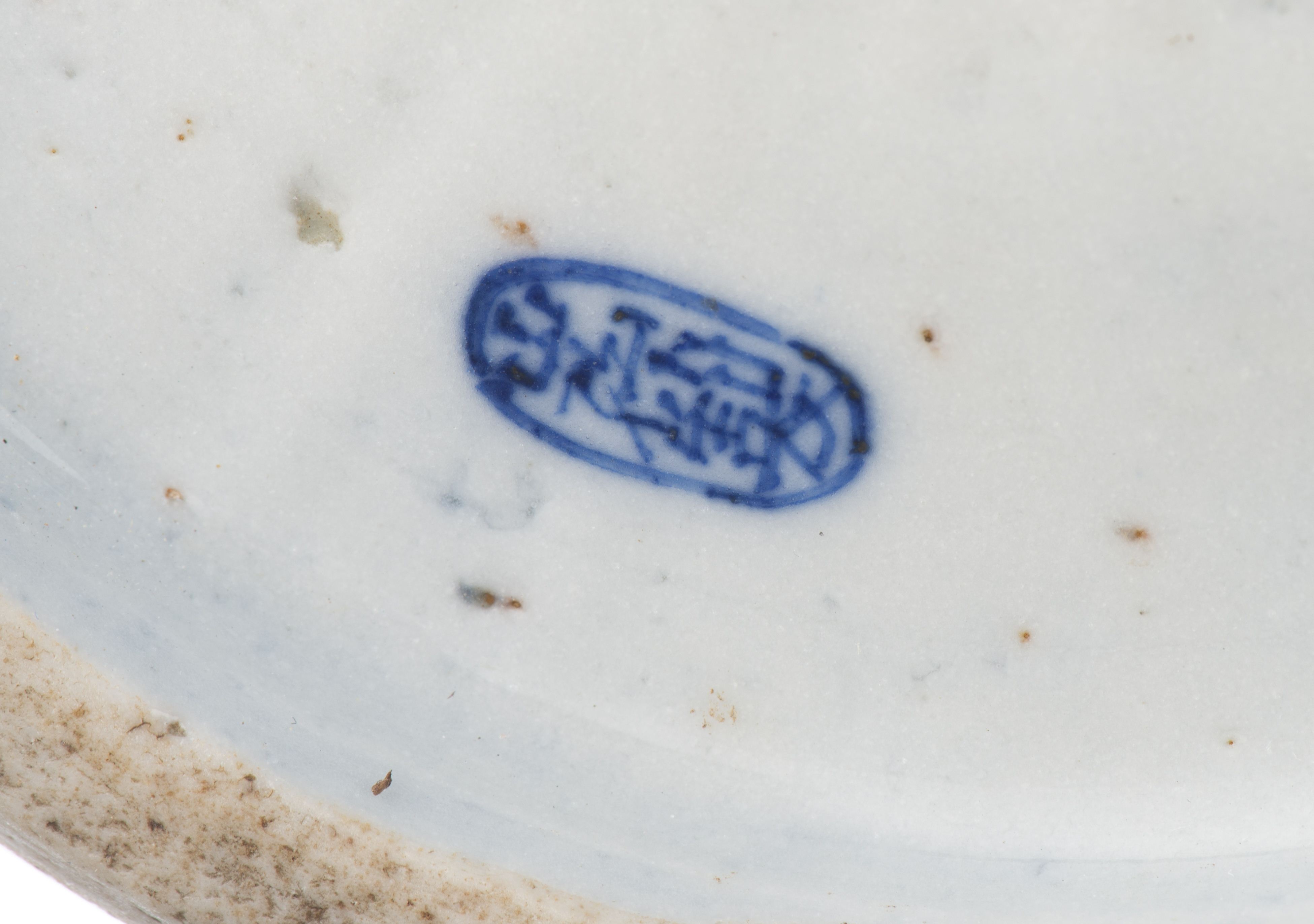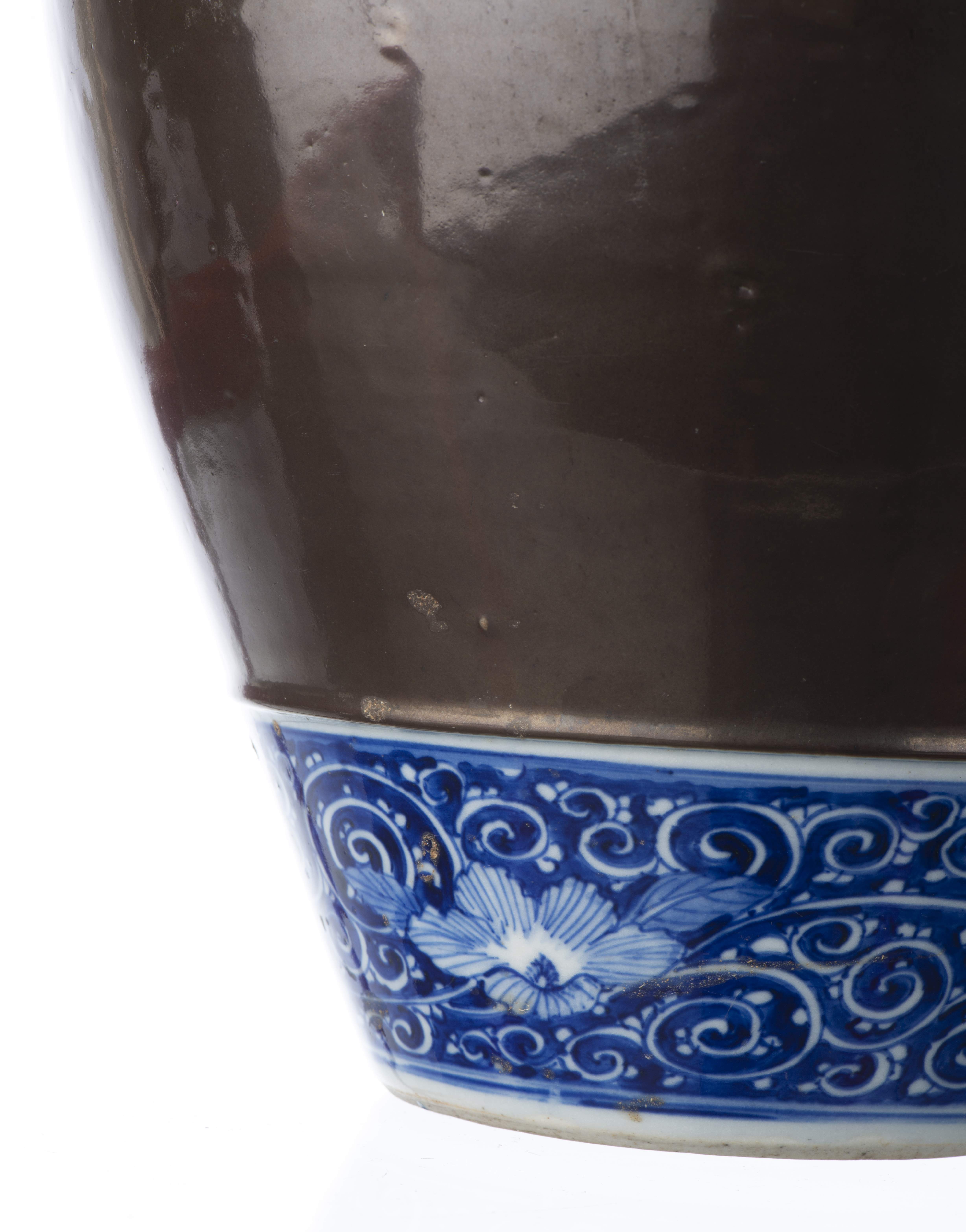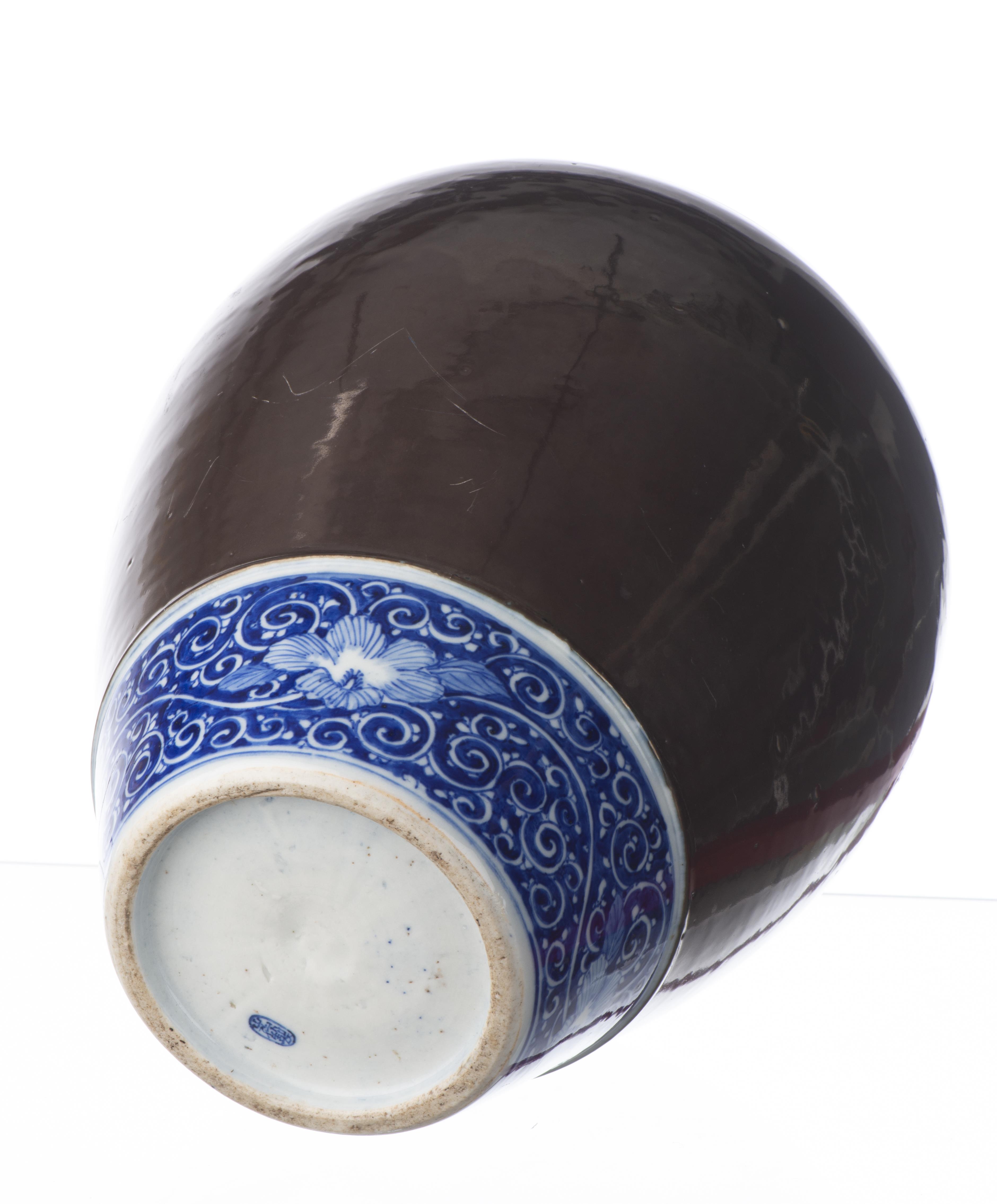 JAPON, Jarre en porcelaine à décor monochrome à l'oxyde de fer paré de deux frises de fleurs et entrelac sur champ cobalt à la base et à l'épaule, cachet ovale à deux caractères sous la base du nom du potier. Ere Meiji.