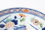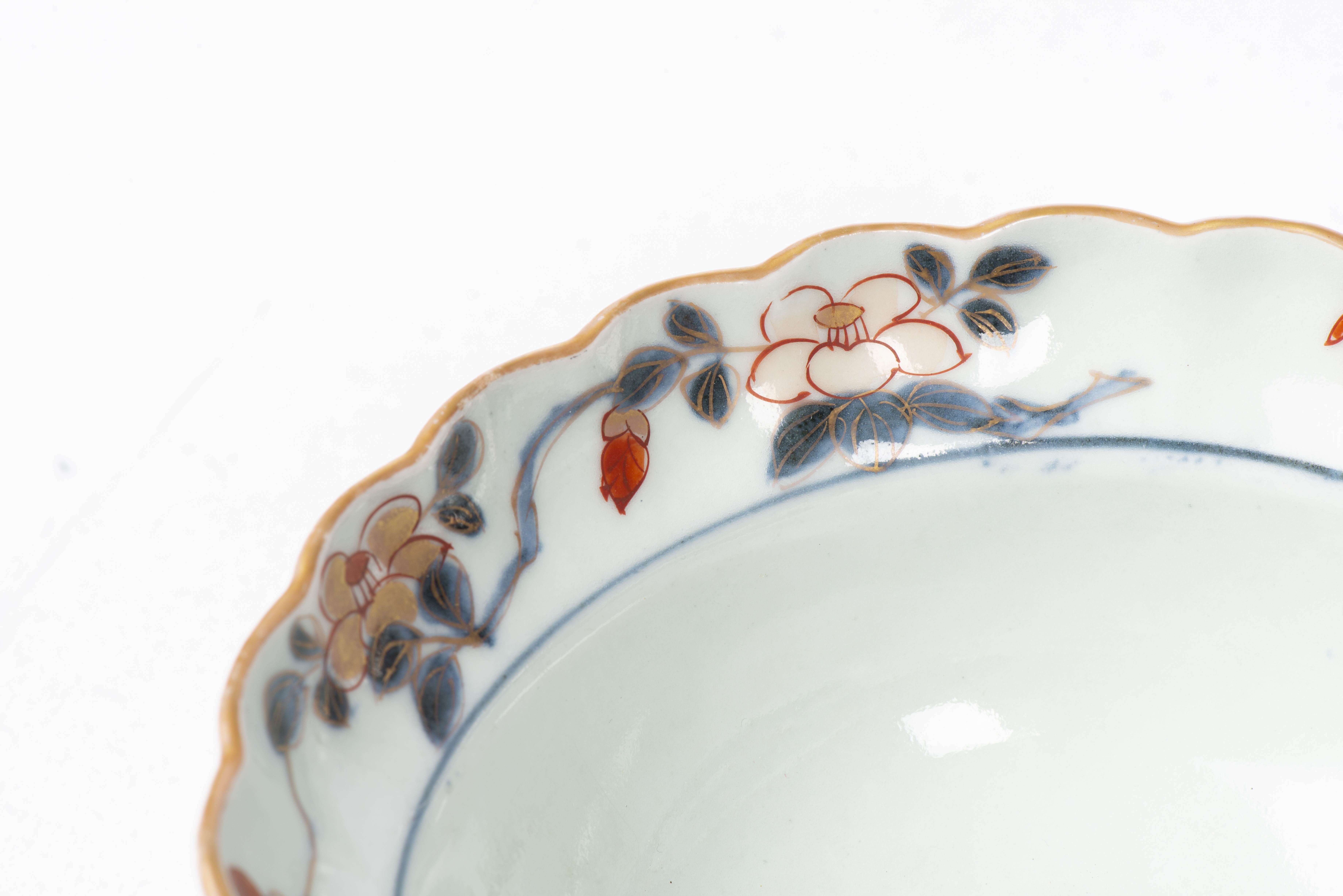 JAPON, Paire bols en porcelaine, l'un à décor Imari d'époque Edo à décor floral et vase fleuri, bordure mouvementée, marque à la tige de fleurs sous la base et l'autre à décor Arita de fleurs dans des registres horizontaux. Marque à la feuille sous la base