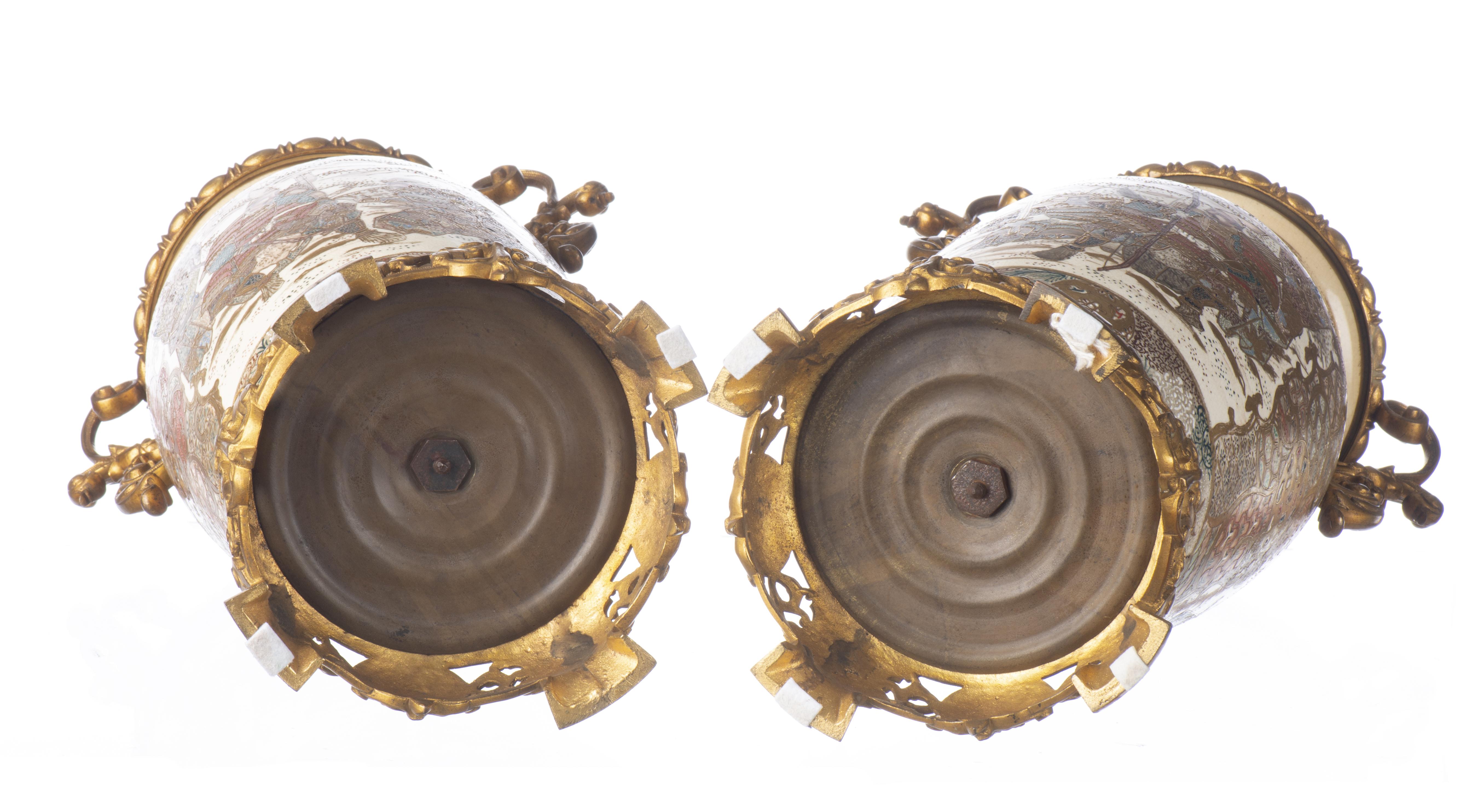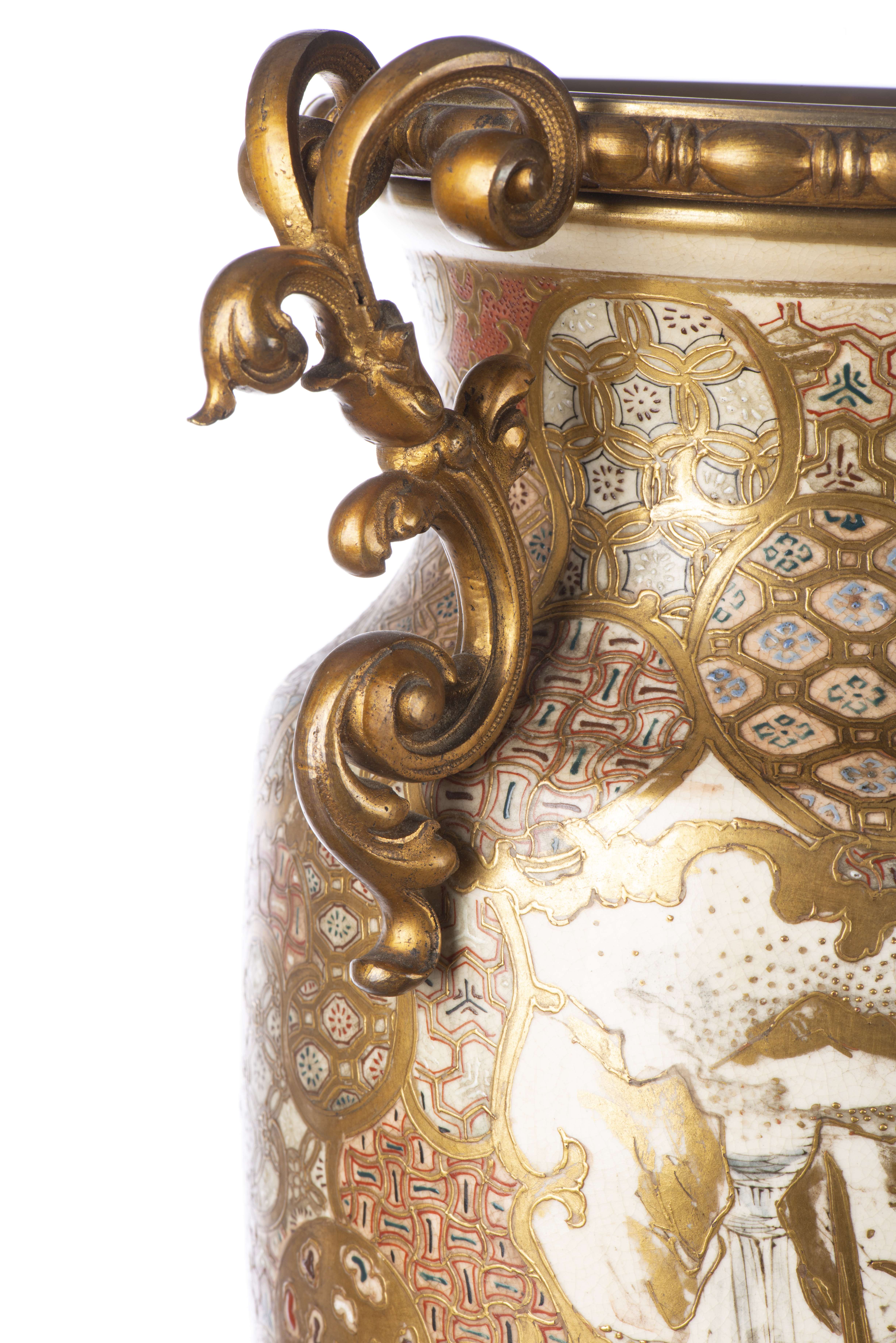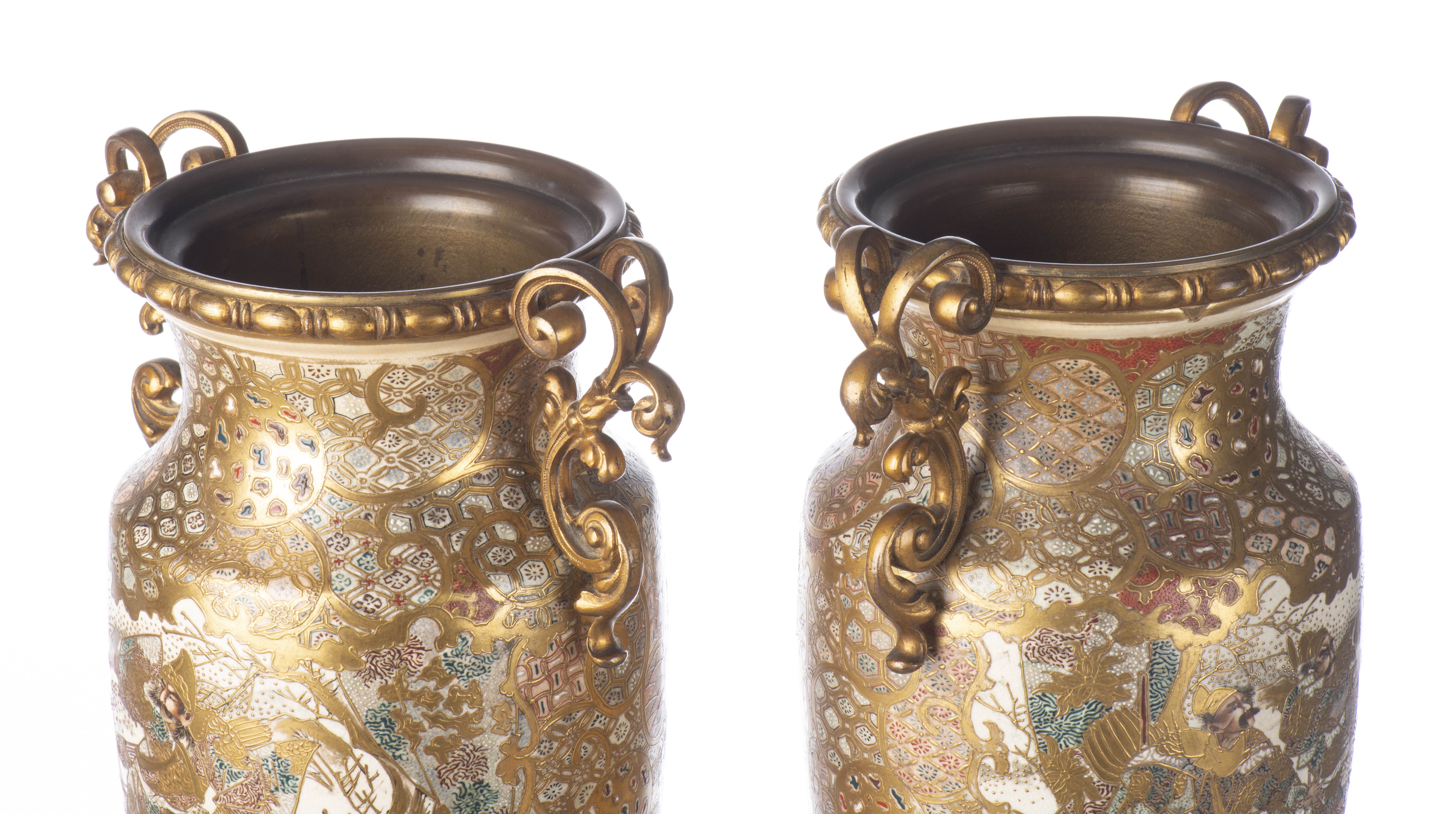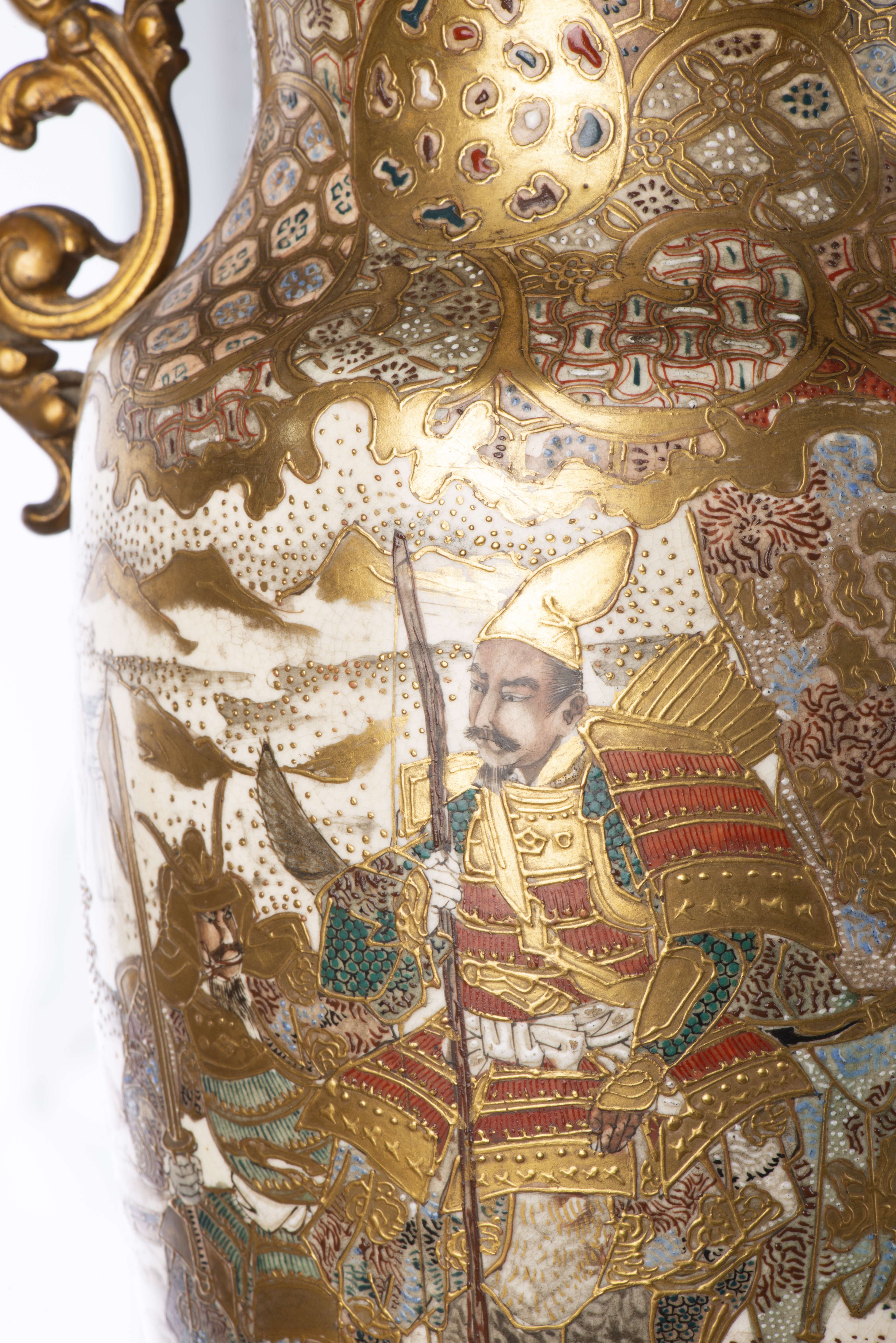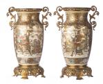 JAPON, paire de vases à décor Satsuma de scène de samourais sur la panse, à monture en bronze doré d'époque Napoleon III, ére Meiji.