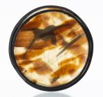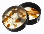 JAPON, Petite boîte ronde en écaille de tortue à décor laqué or d'un oiseau dans un paysage lacustre. Ère Meiji