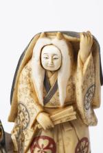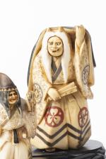 JAPON, Quatre sculptures en ivoire de femmes âgées à tête à pivot et chevelure rouge ou chevelure de peau de bête, tenant un éventail ou une coloquinte, posées sur un socle en bois, Ère Meiji. Signée sous la base à 2 caractères rouges 光之