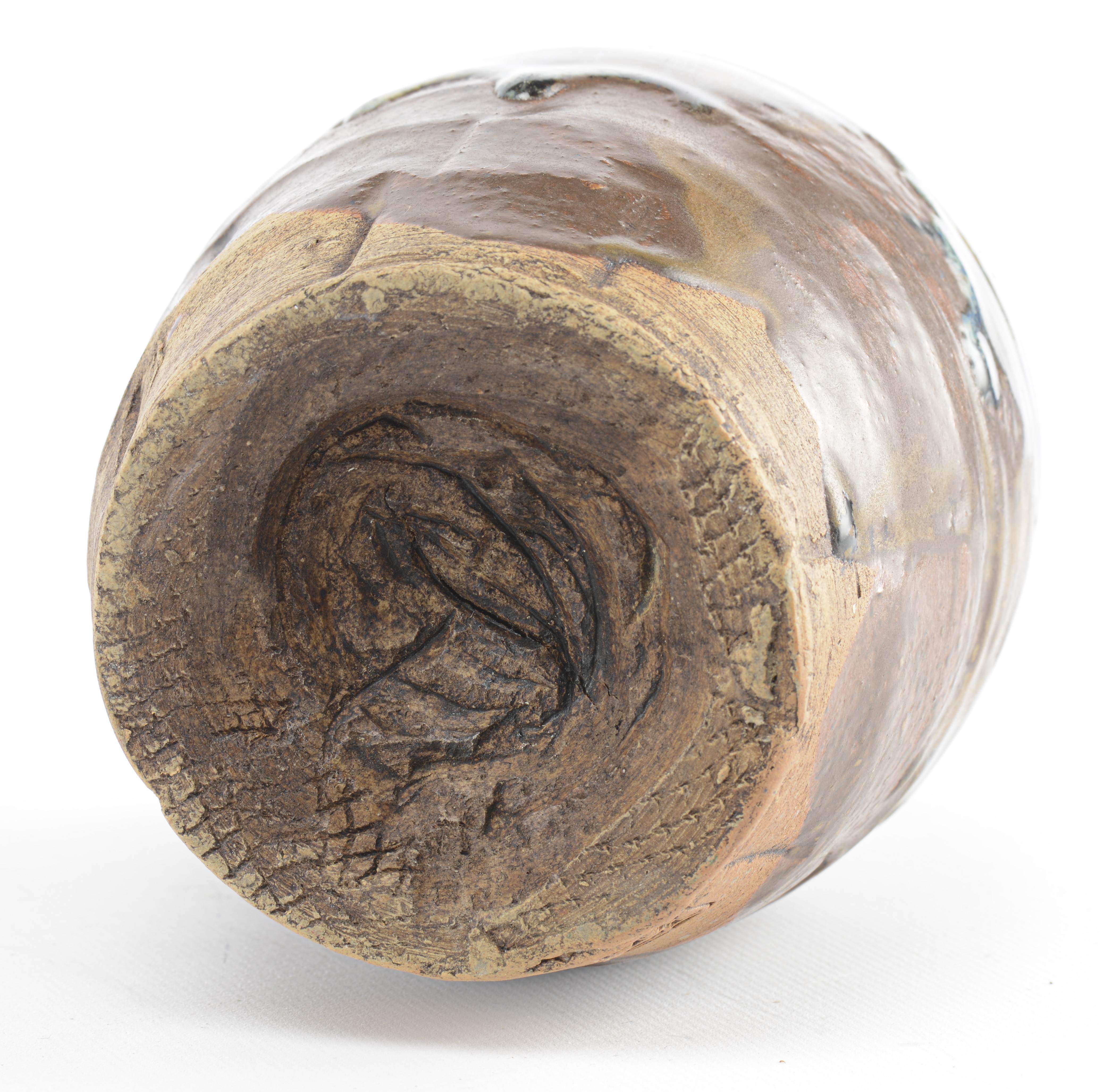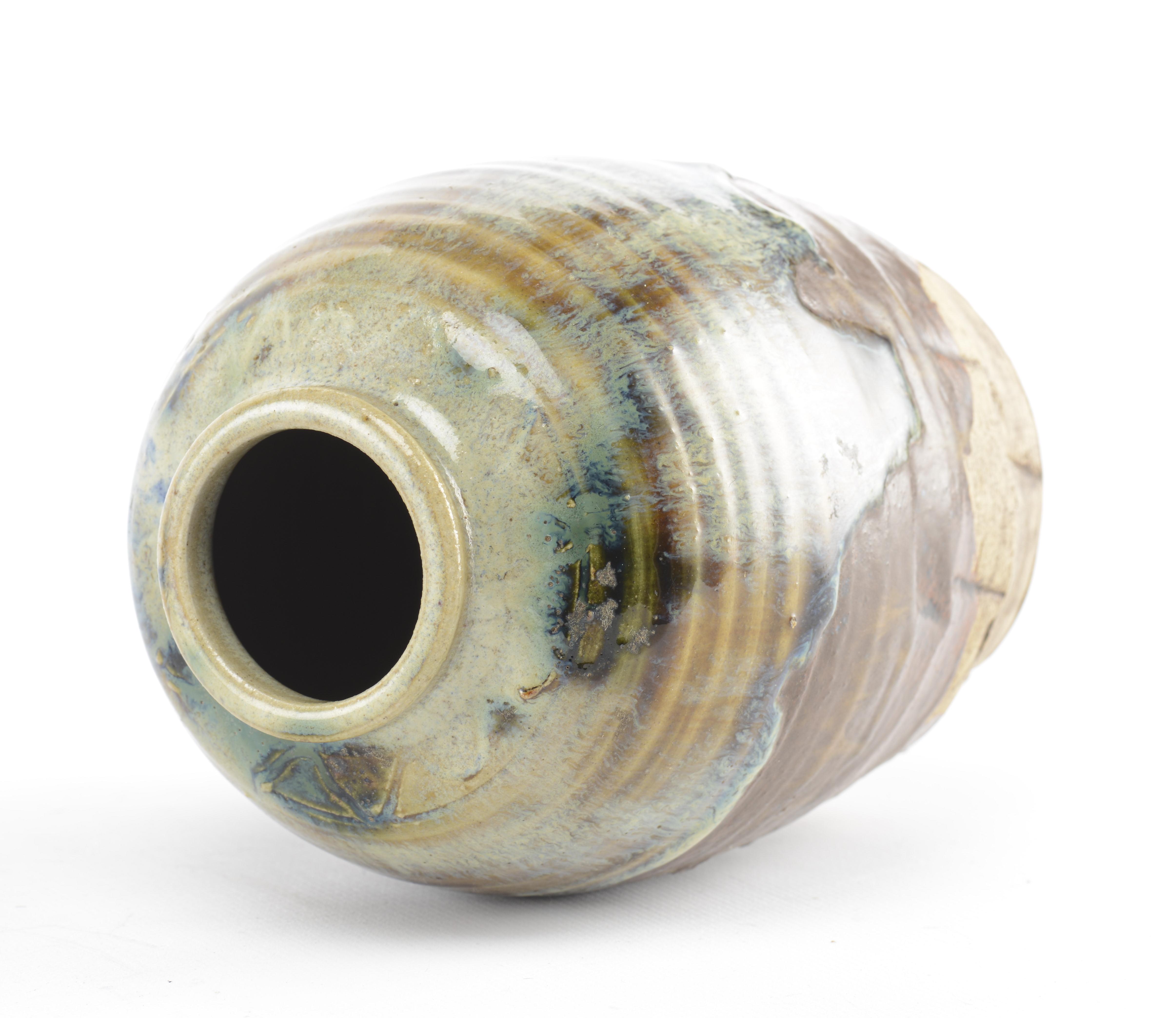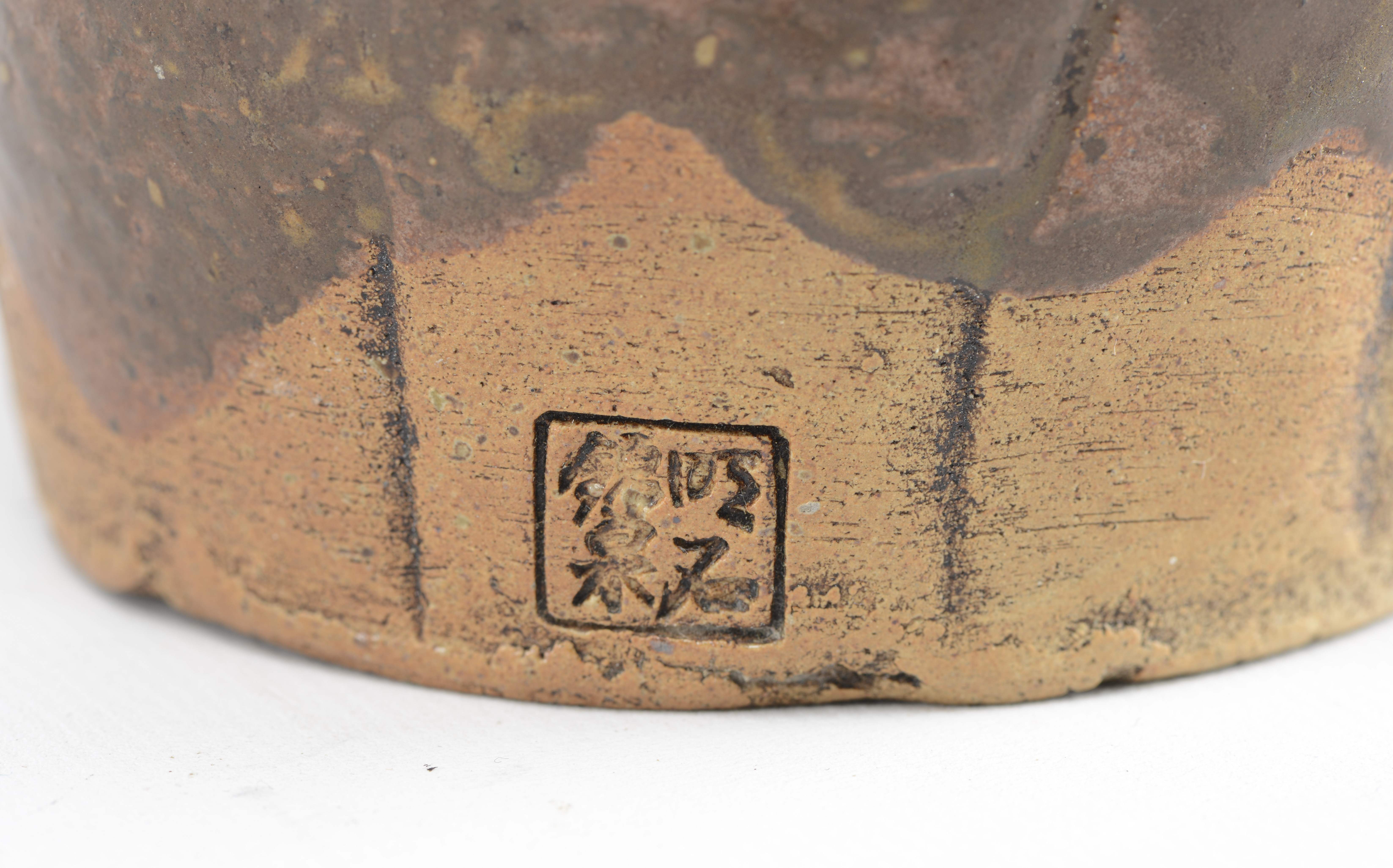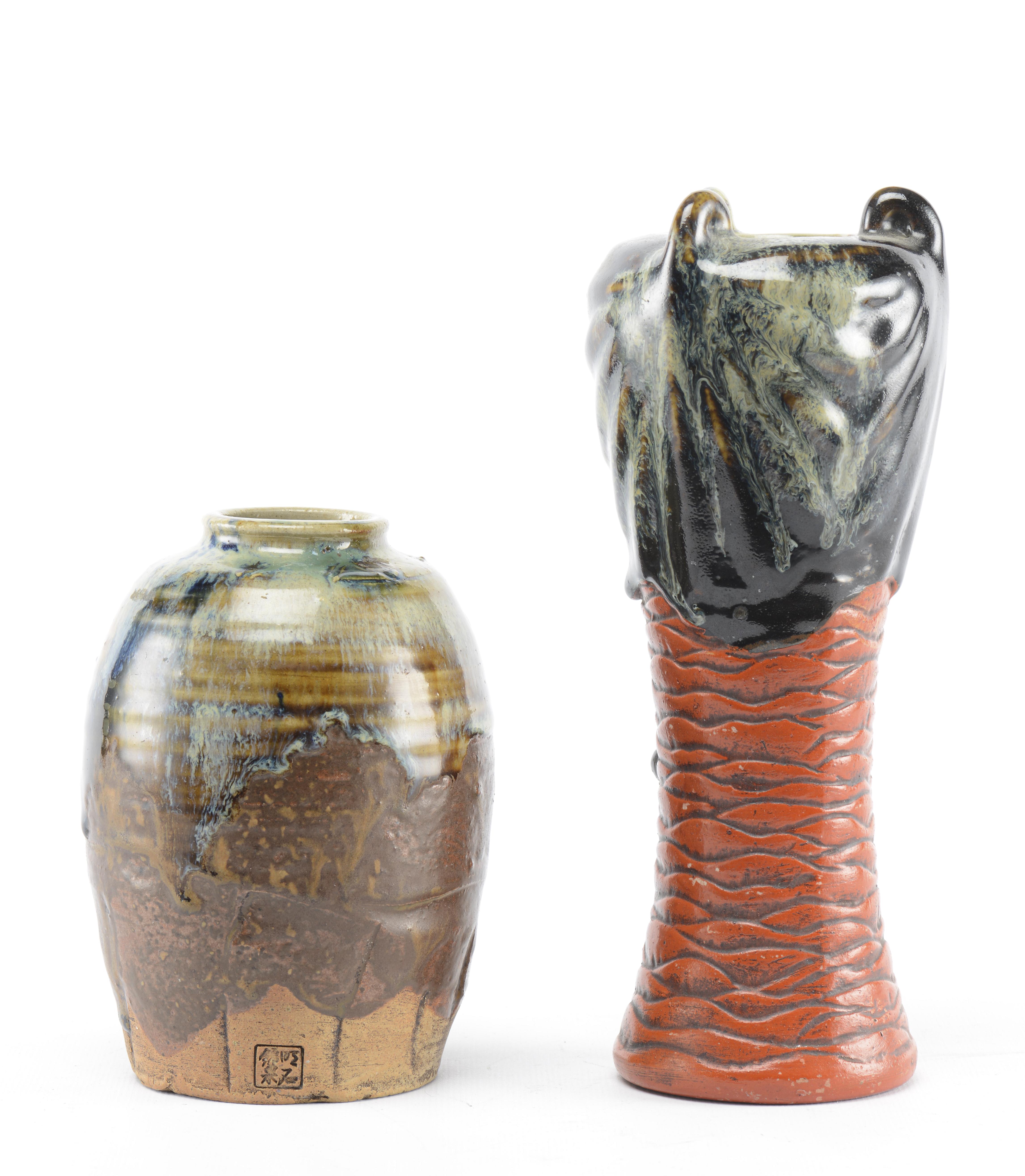 On y joint un vase de borme ovoide allongée en grès de Raku à couverte flambée débordant de la lèvre, cachet à 4 caractères sur le bas de la panse.