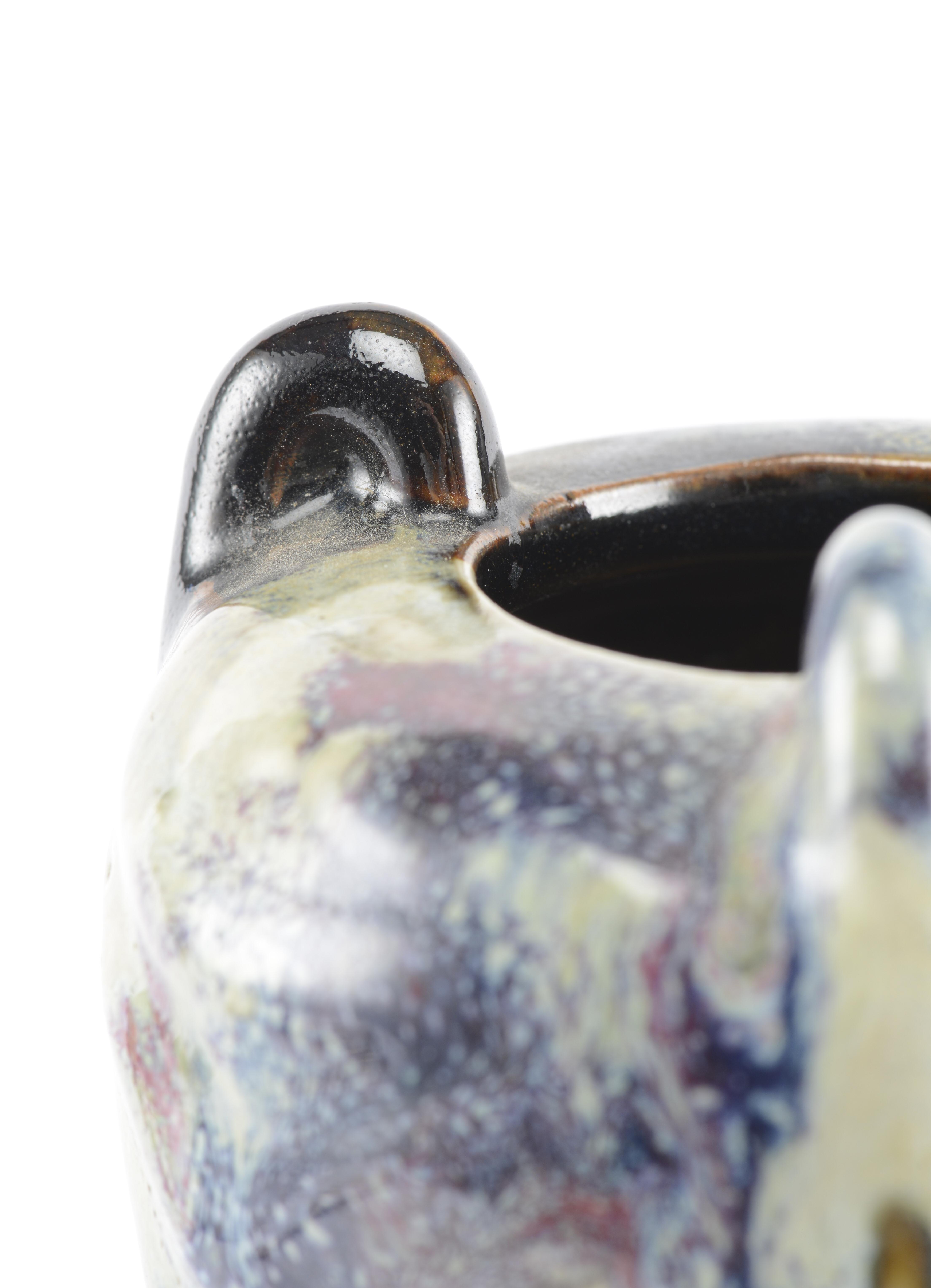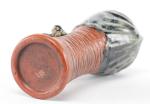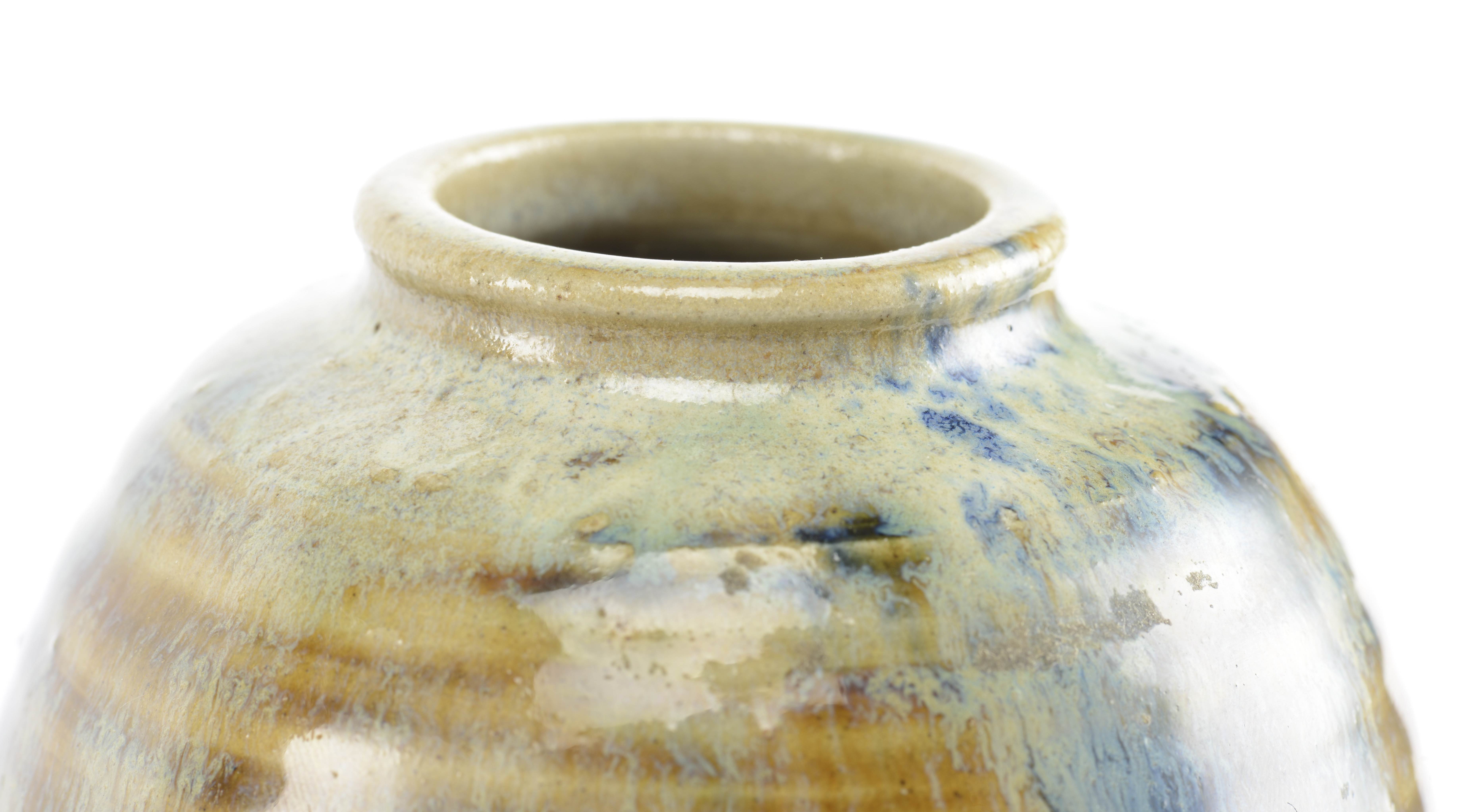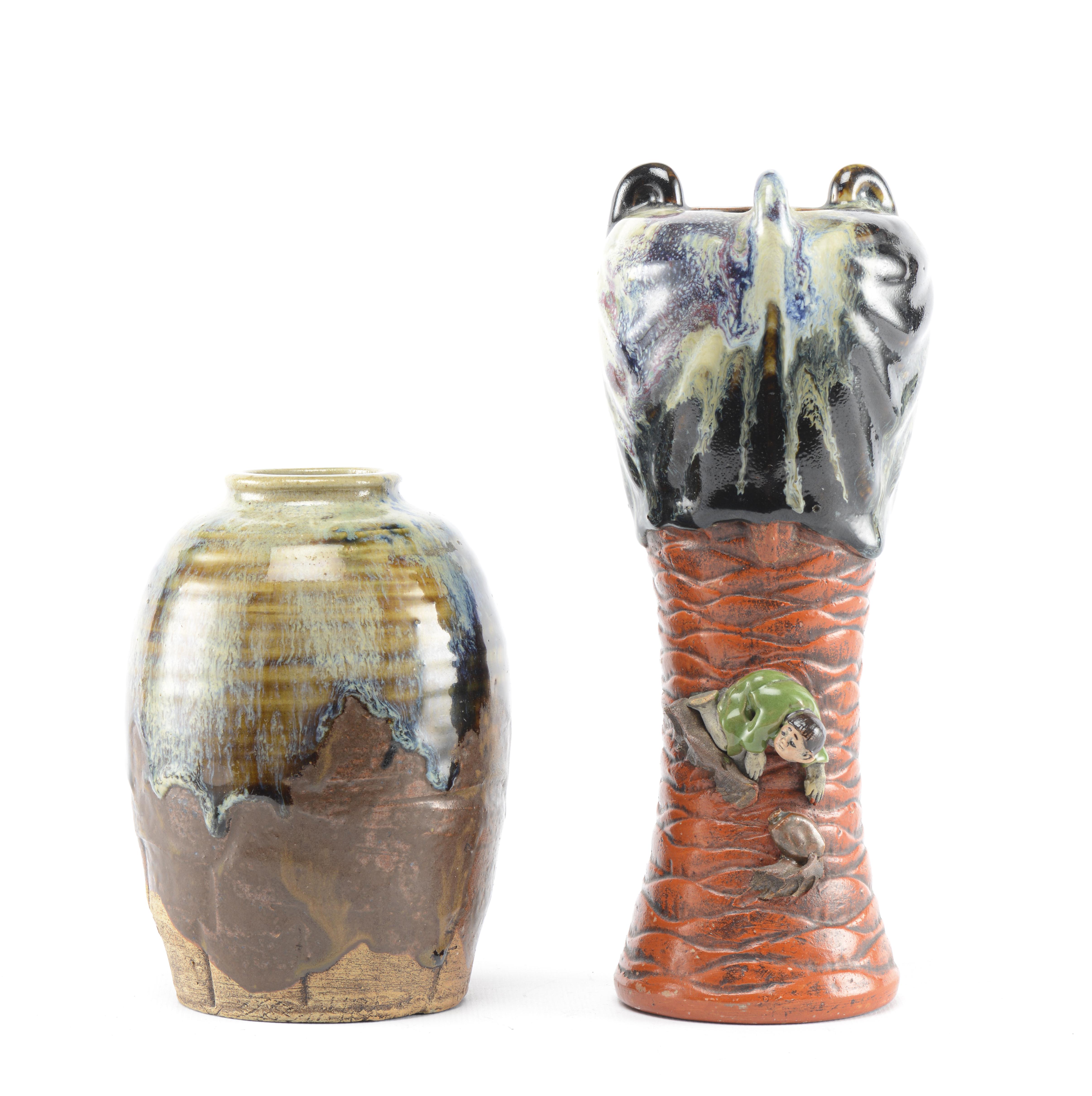On y joint un vase de borme ovoide allongée en grès de Raku à couverte flambée débordant de la lèvre, cachet à 4 caractères sur le bas de la panse.