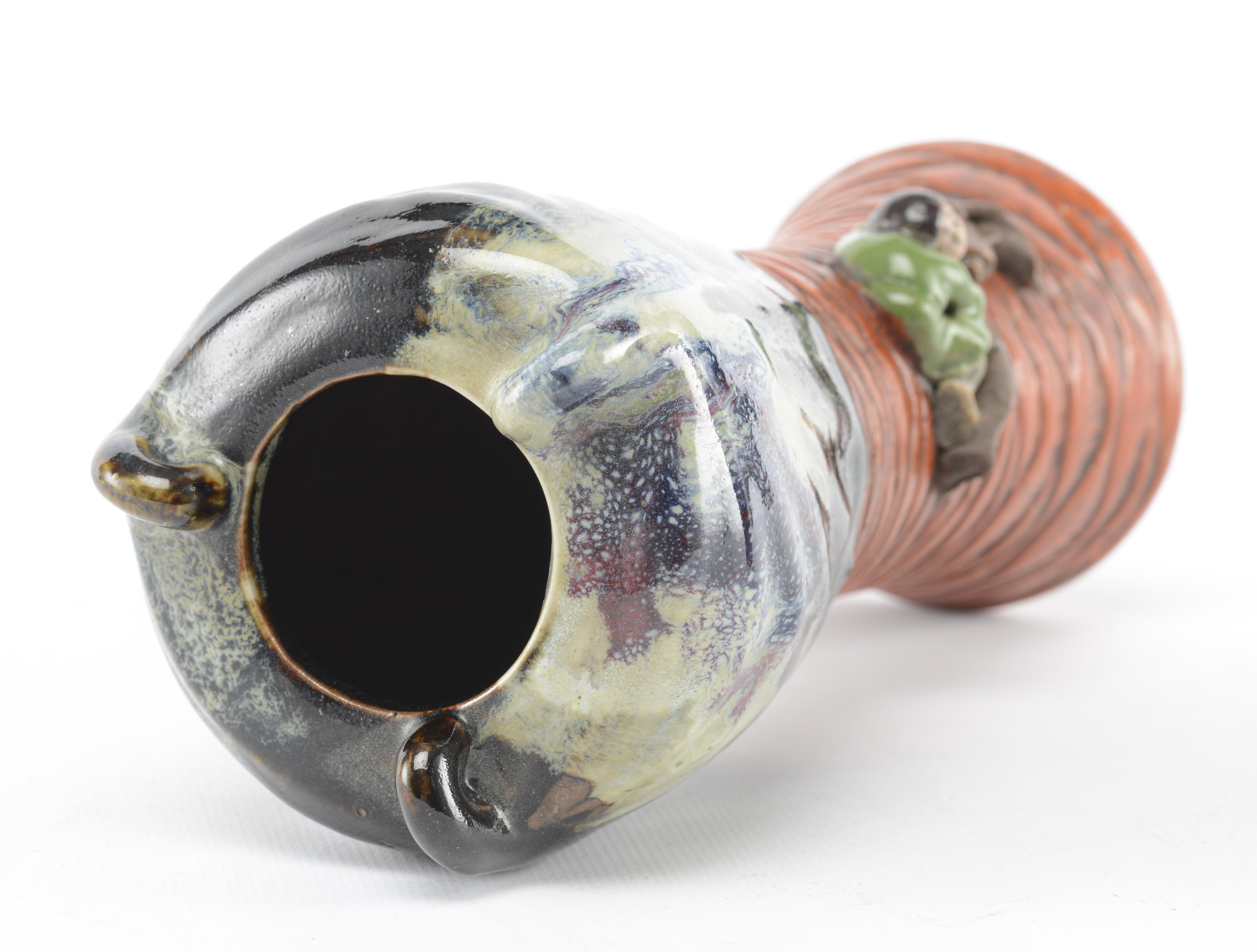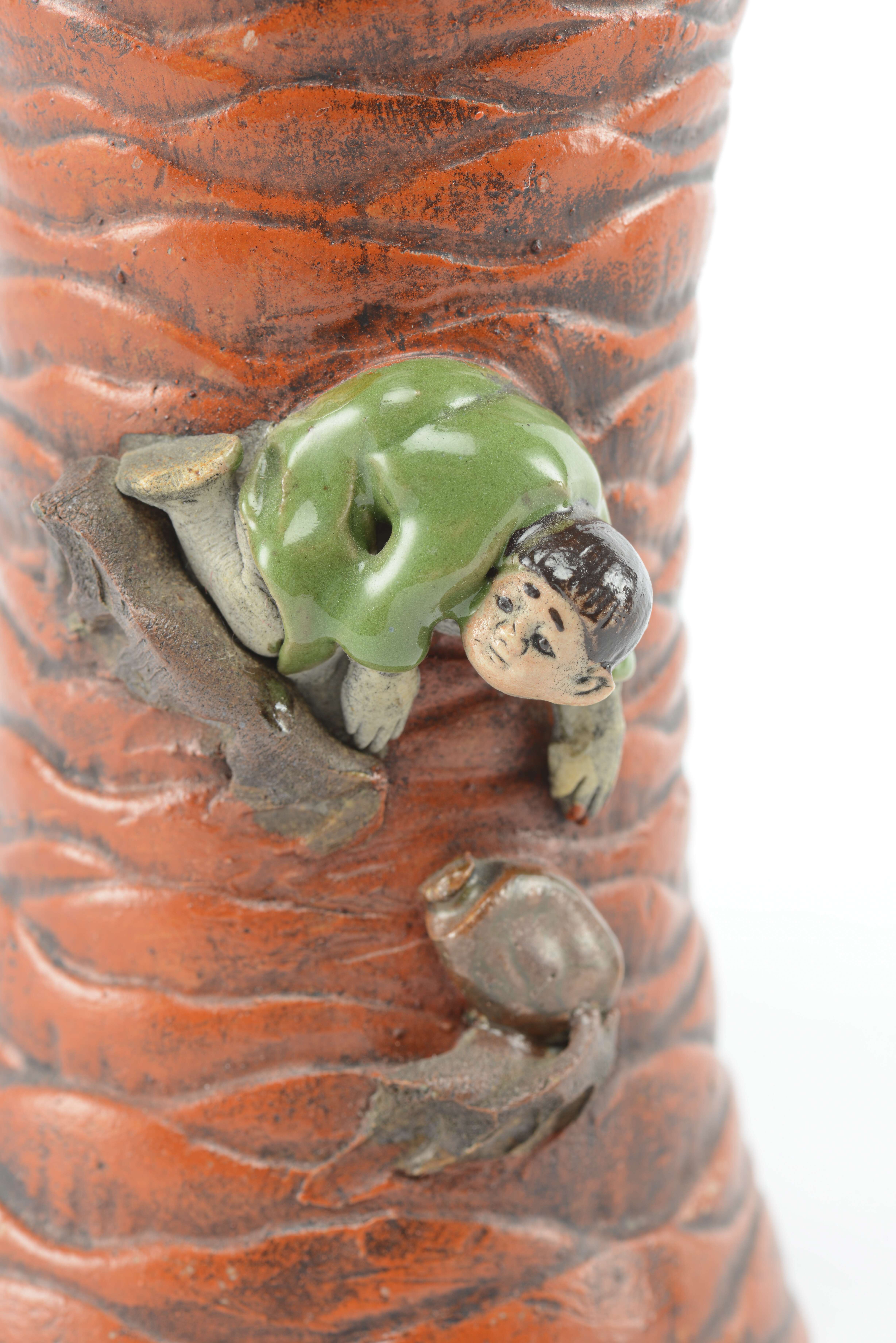 Vase en grès du Japon de Sumidagawa au décor flambé débordant de la lèvre sur un pareterre de flots rouges et d'un petit garçon sur un rocher cherchant à attraper un vase brun posé sur un autre rocher.